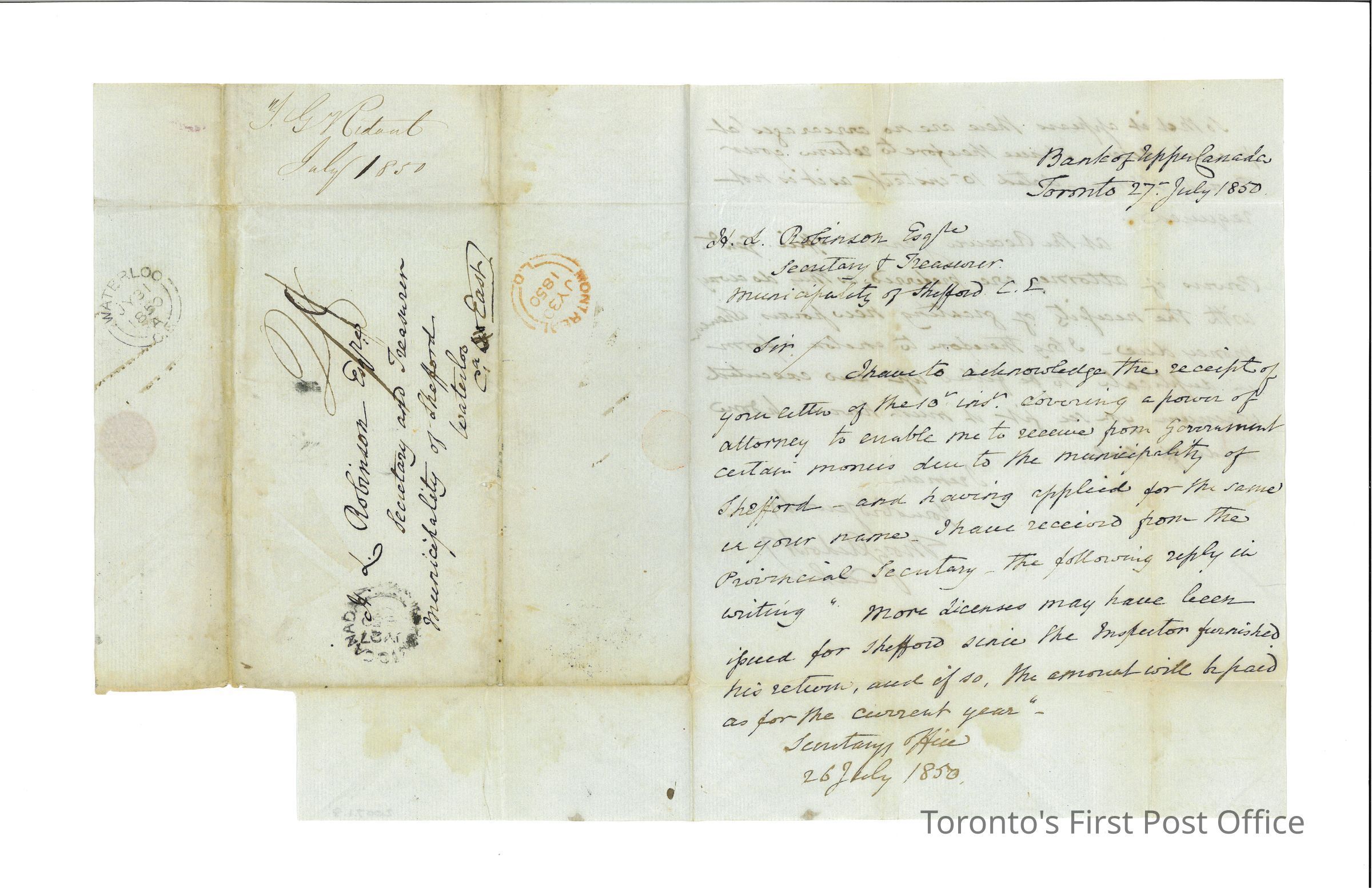 Letter and cover addressed to "L. Robinson Esqre, Secretary and Treasurer, Municipality of Shefford, Waterloo, Ca. East."; postmarks: black double circle "TORONTO CANADA" (smudged), black double circle "WATERLOO C.E. JY 31 1850"; red double circle "MONTREAL L.C. JY 30 1850"; red wafer seal; black ink manuscript; re: power of attorney, arrears, etc.; one page folded, letter on front and back; from the Bank of Upper Canada, Toronto; signed by Ridout, Cashier; on white laid paper; dated July 27 1850.Update Date