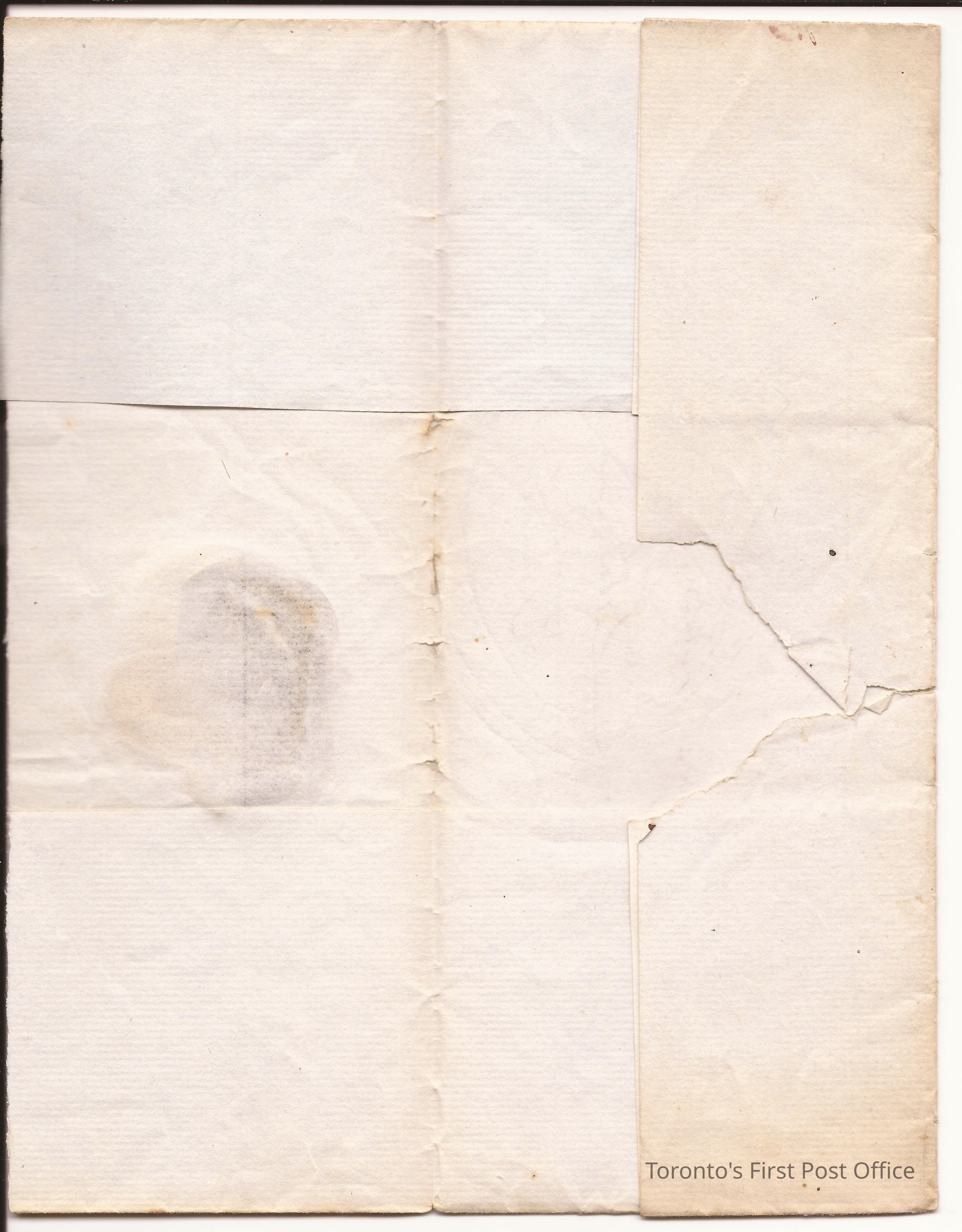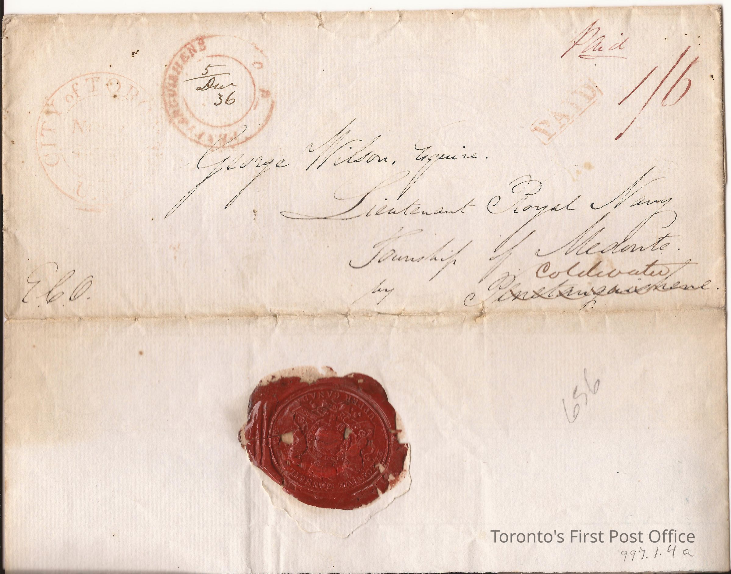.1: Cover; to George Wilson, Esquire, Lieutenant Royal Navy, Township of Medonte by Coldwater; postmarks: double red City of Toronto N… U.C., double red Penetanguishene 5 Dec 1836, red ink PAID stamp; red ink PAID manuscript