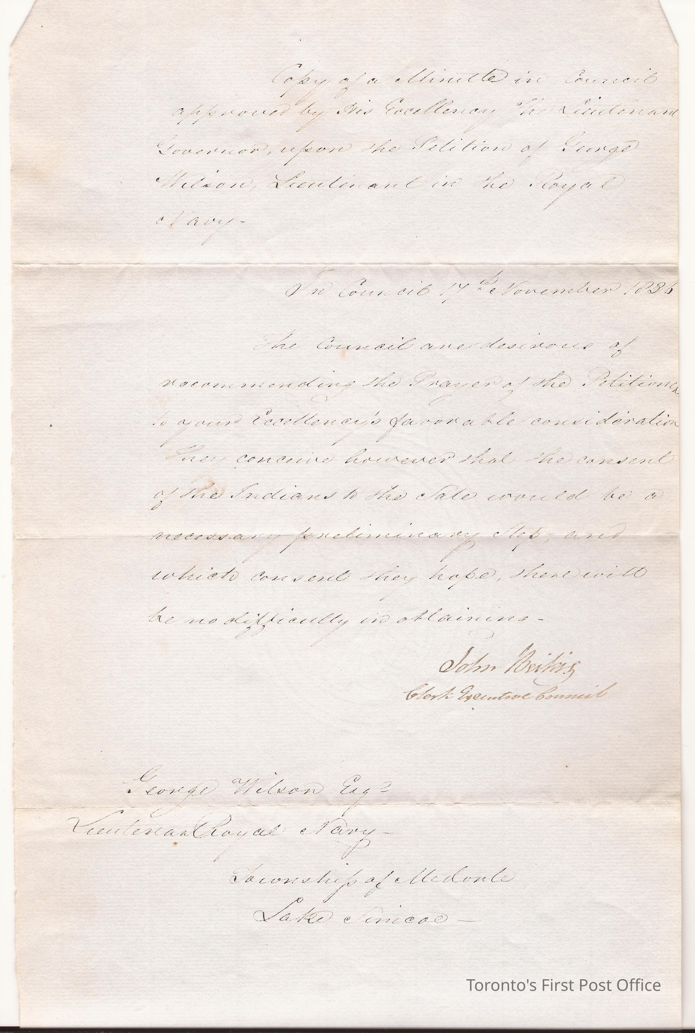 .2: letter; dated 17th November 1836; re: copy of minutes of the Executive Council, U.C., directing Lt. Wilson to obtain approval of land purchase from Indians in Medonte Township, Lake Simcoe; red wax seal of Executive Council; signed John Reitzig, clerk.Dimensions