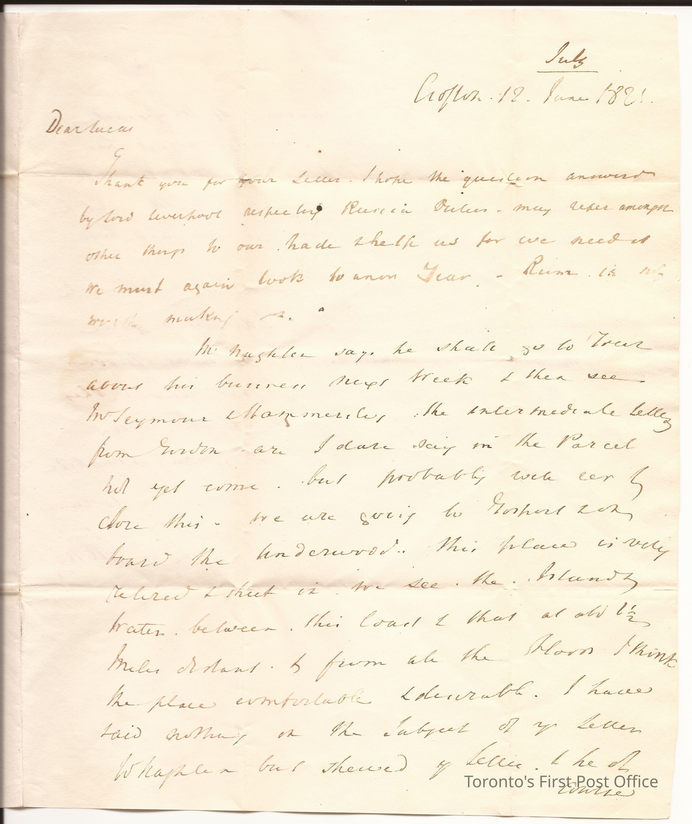 Black wafer seal; watermark "C WILMOTT 1820"; dated: Gafton 12 June, 1821; addressed to PM Lucas Esq., Inc c/o Lang Chauncey Lucas, London; re: trade, duties, going to Gosport, island, to trade or vacation (?); postmarks: 1. manuscript 12 July 1821, 2. single, black British postmarks F 13 JY 13 1821, 3. black type FAREHAM 75.Update Date