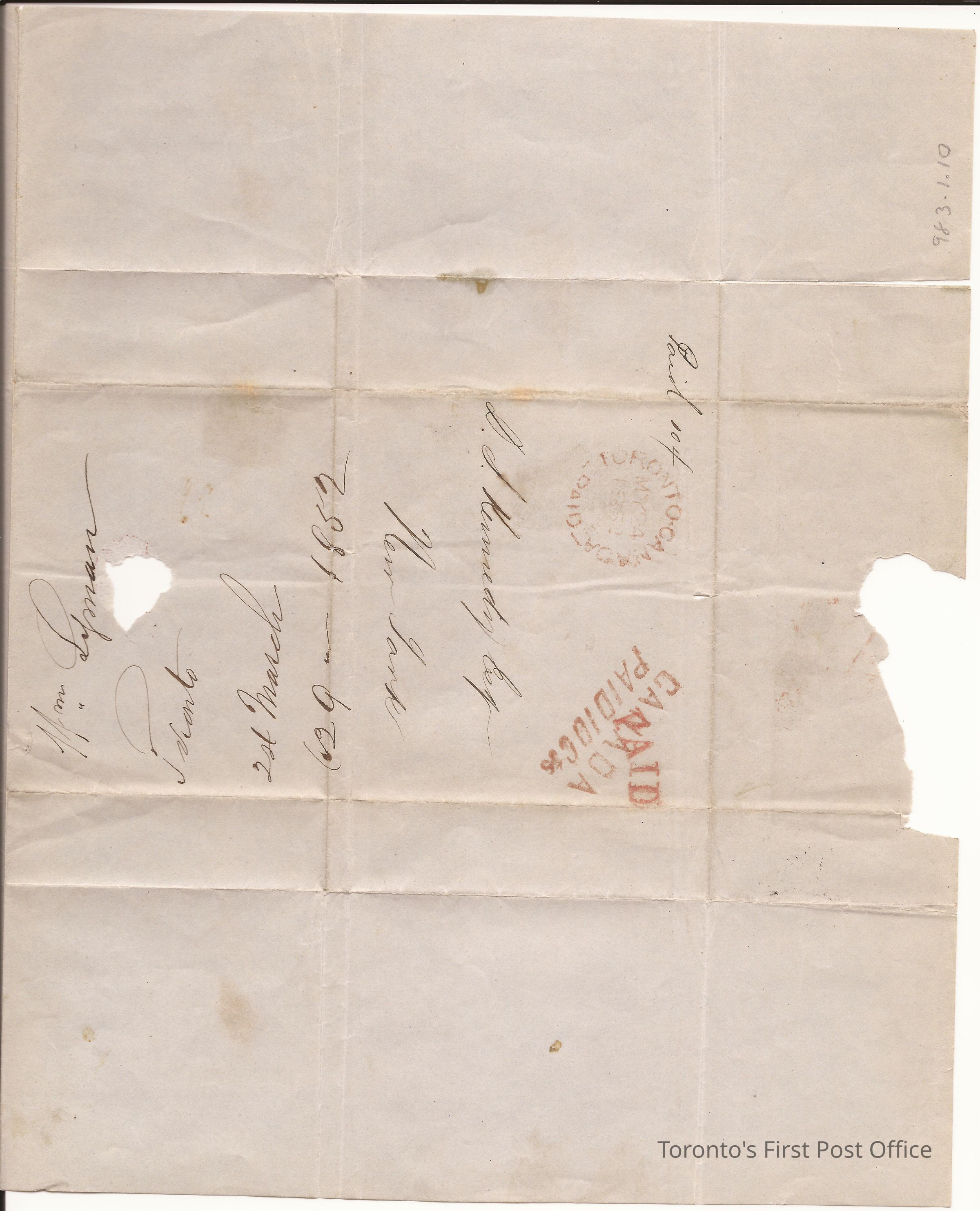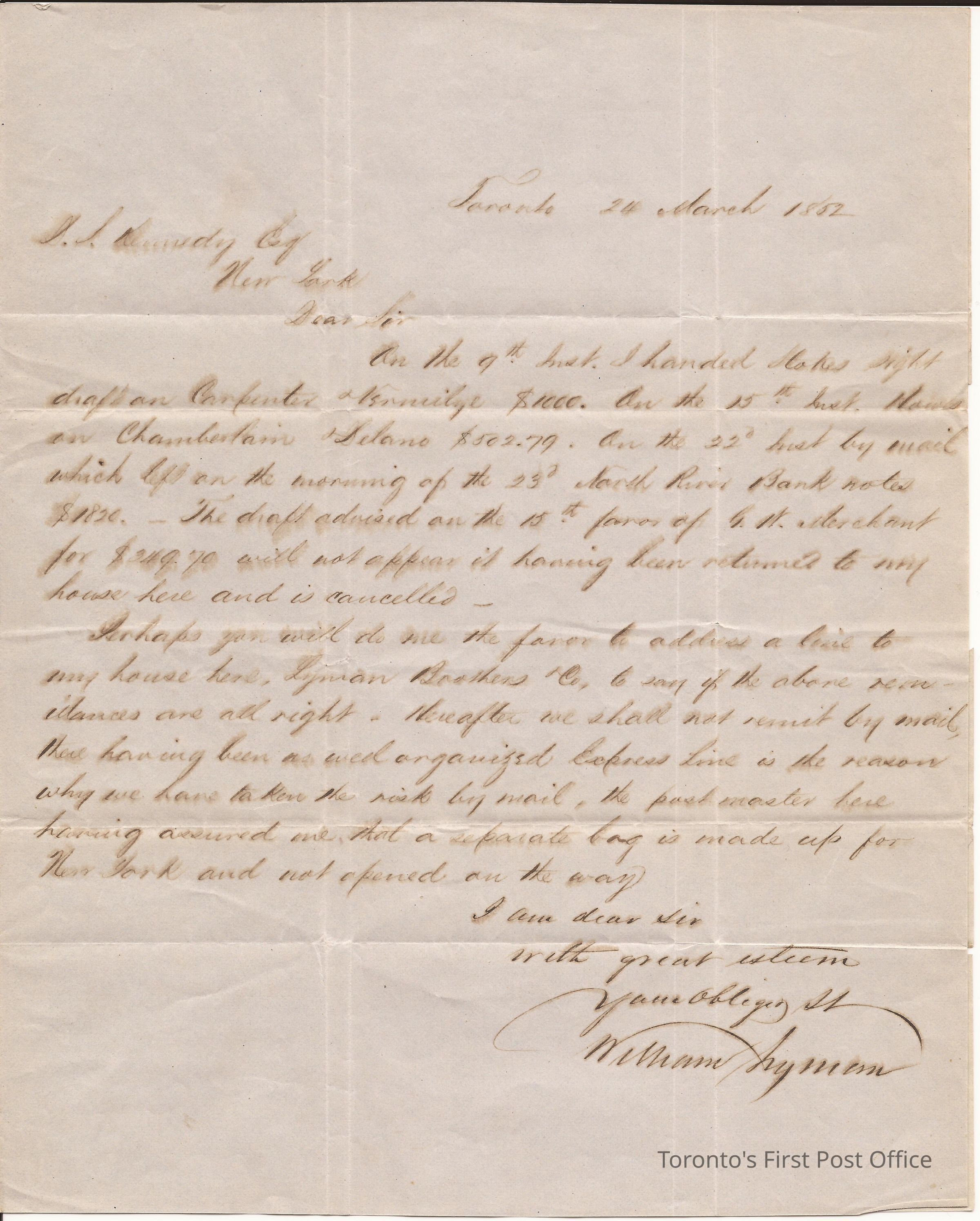 Black ink; green-grey paper; addressed to D.S. Kennedy, New York; from William Lyman, Toronto; dated: March 24, 1852, Toronto; re: payment of carpentry work (see 983.1.8), risking sending remittance by mail, no organized Express Line; date stamp: single broken TORONTO - CANADA MY24 1852; "PAID CANADA 10 cts"Update Date