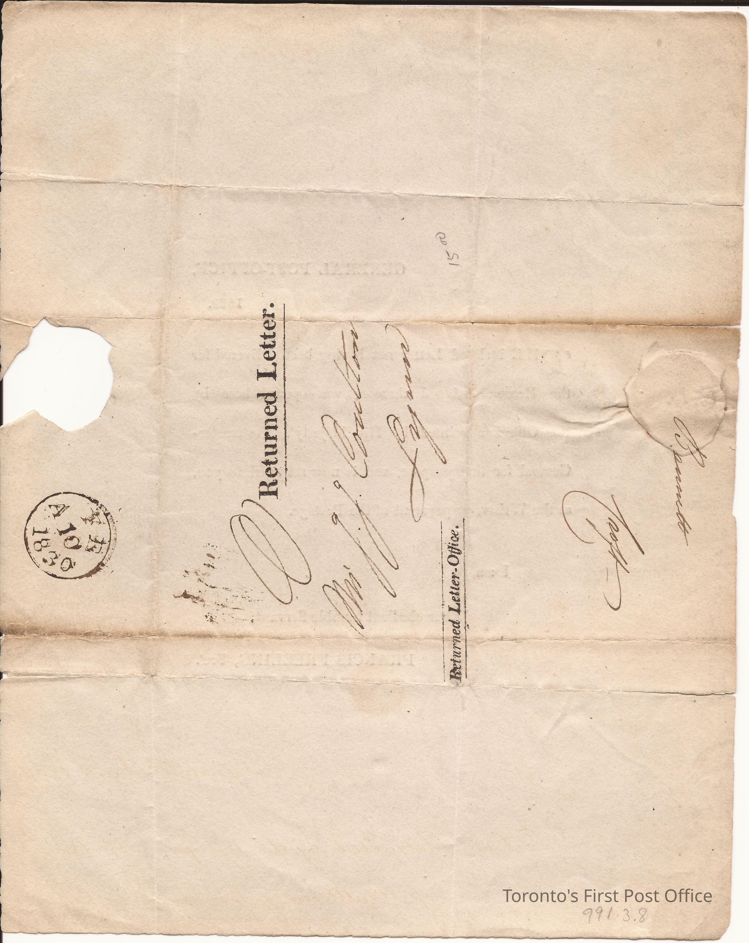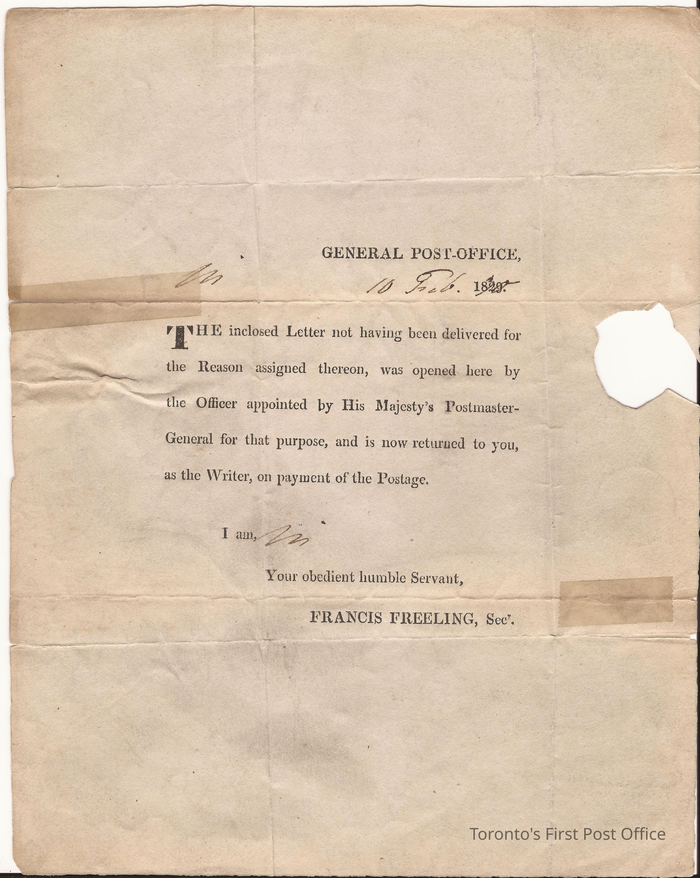 Letter from Francis Freeling, Sec.; to Mr. G.G. Coulton, Lynn (Bennett Croff); black printing; heavy, buff paper; form letter; re: a returned letter; originating at General Post Office 10 Feb. 1830.Dimensions