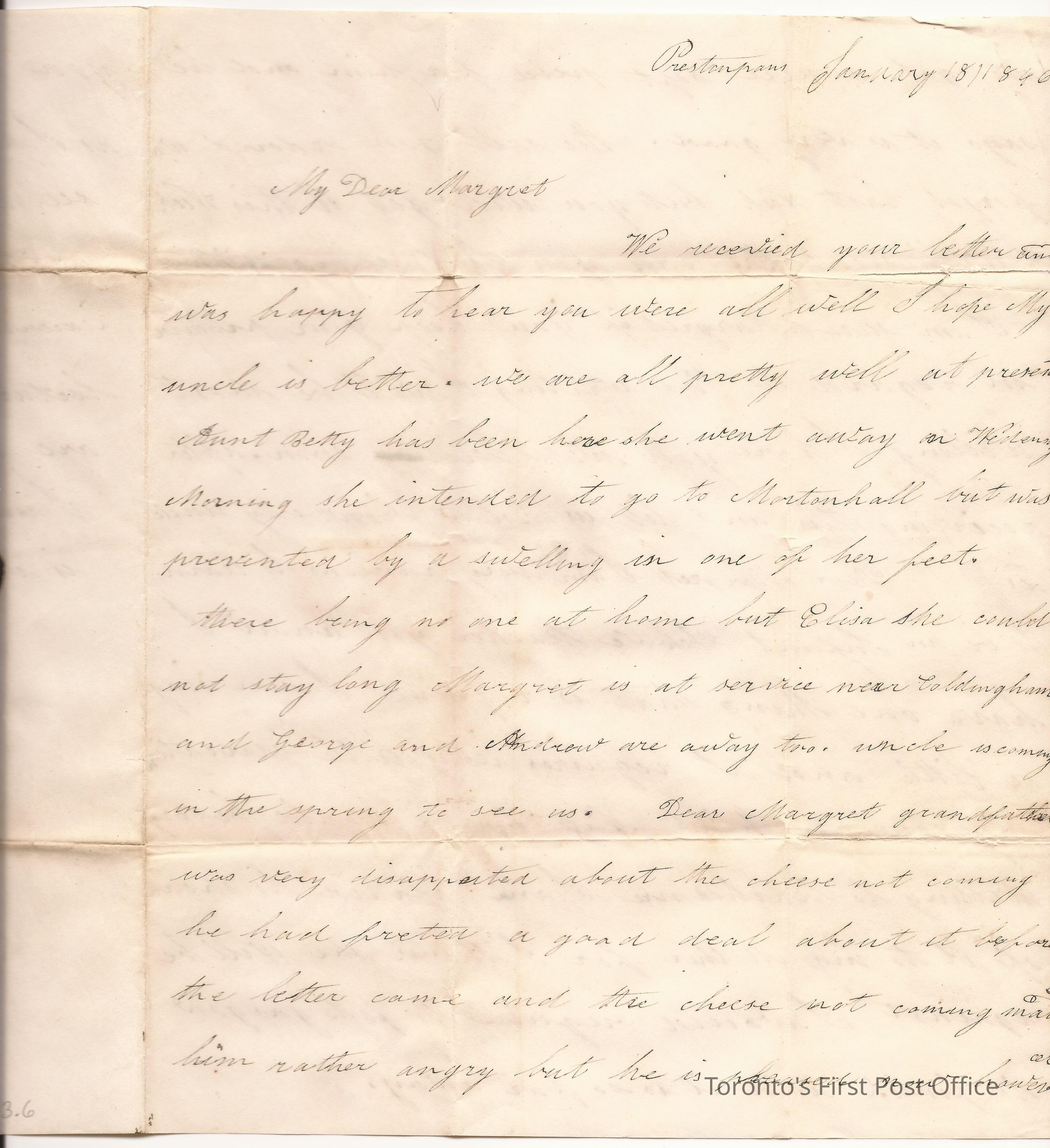Letter to Miss M. Gibbs, QueensBerry, Arms Inn, Sanguhen; from Mary Alexander; dated: 18 January 1846; white paper, yellowed with age; black ink; black seal; 7 fold lines; black wax seal; re: personal letter.Dimensions