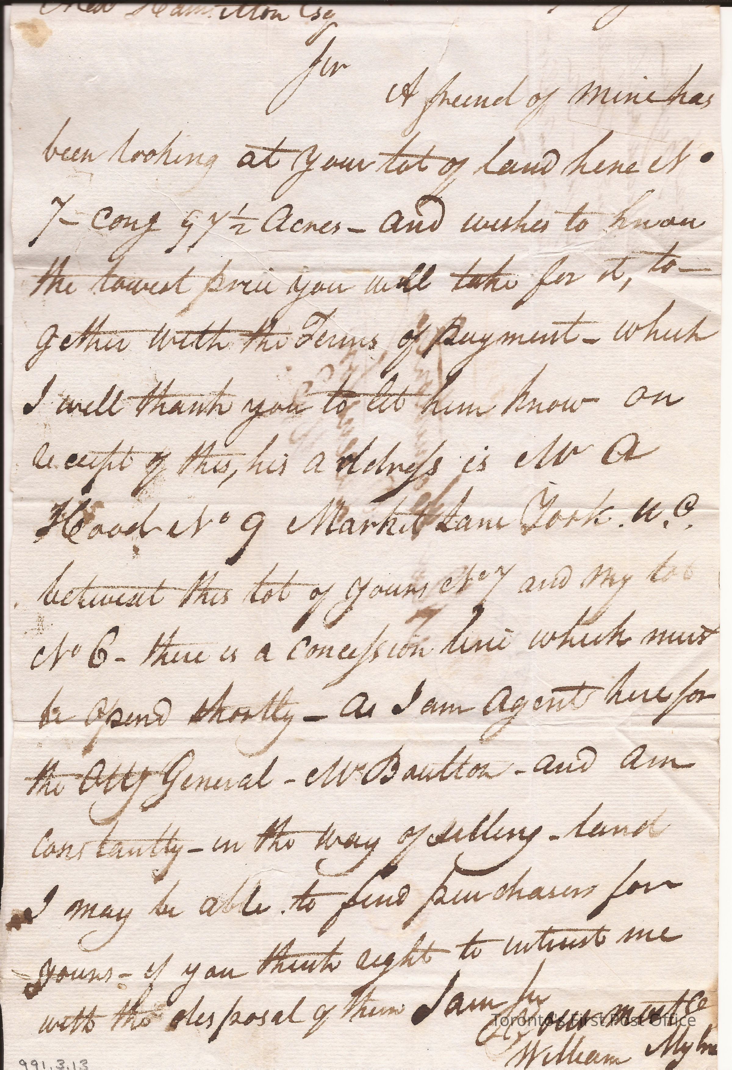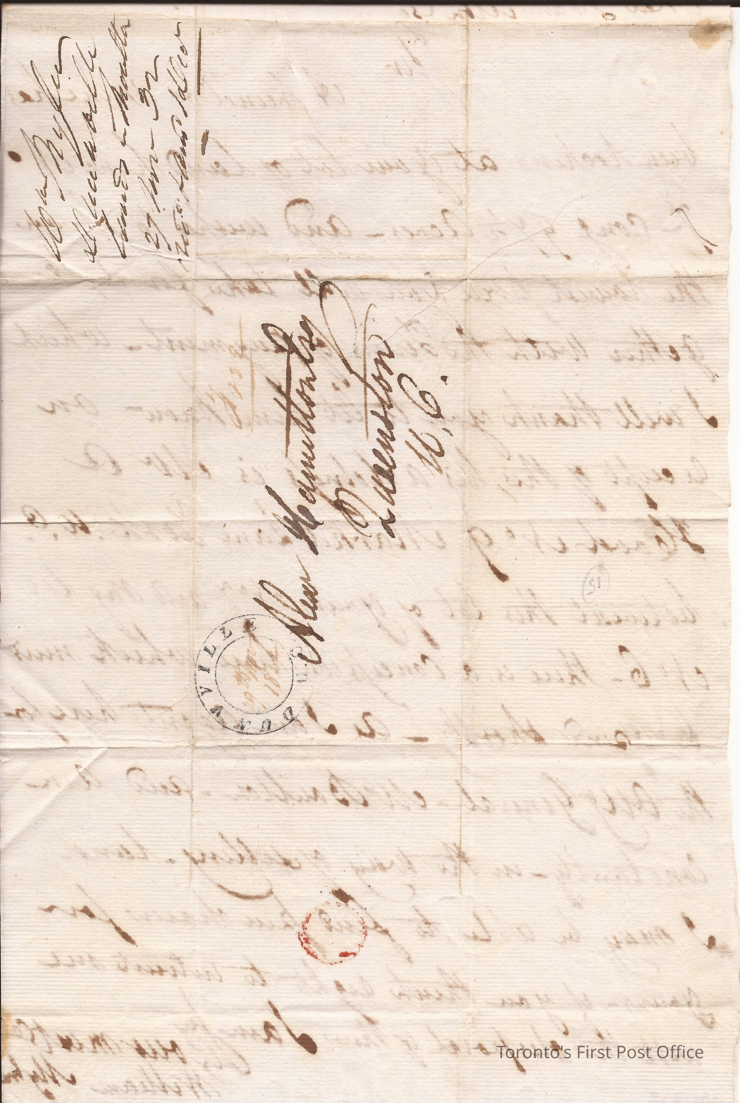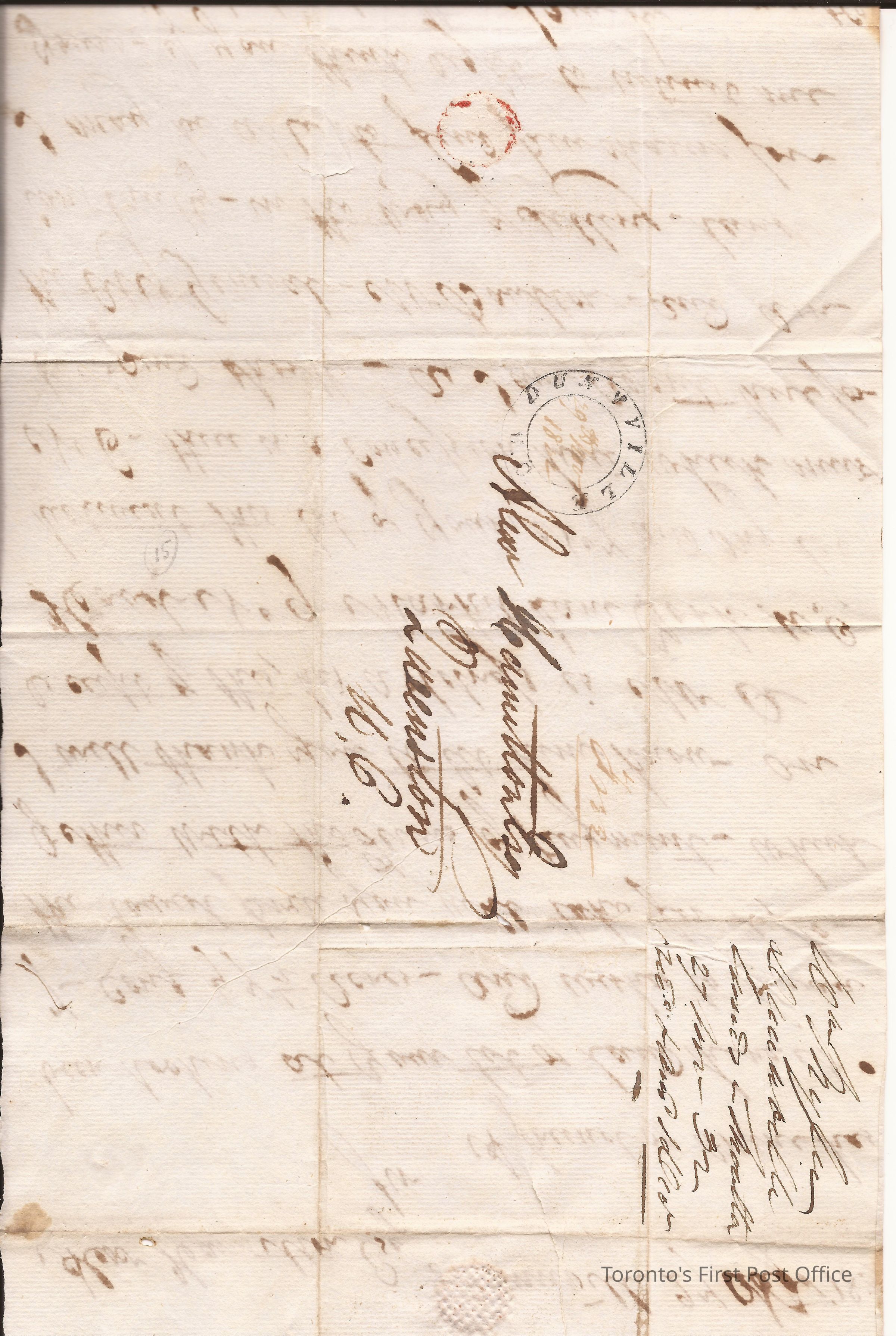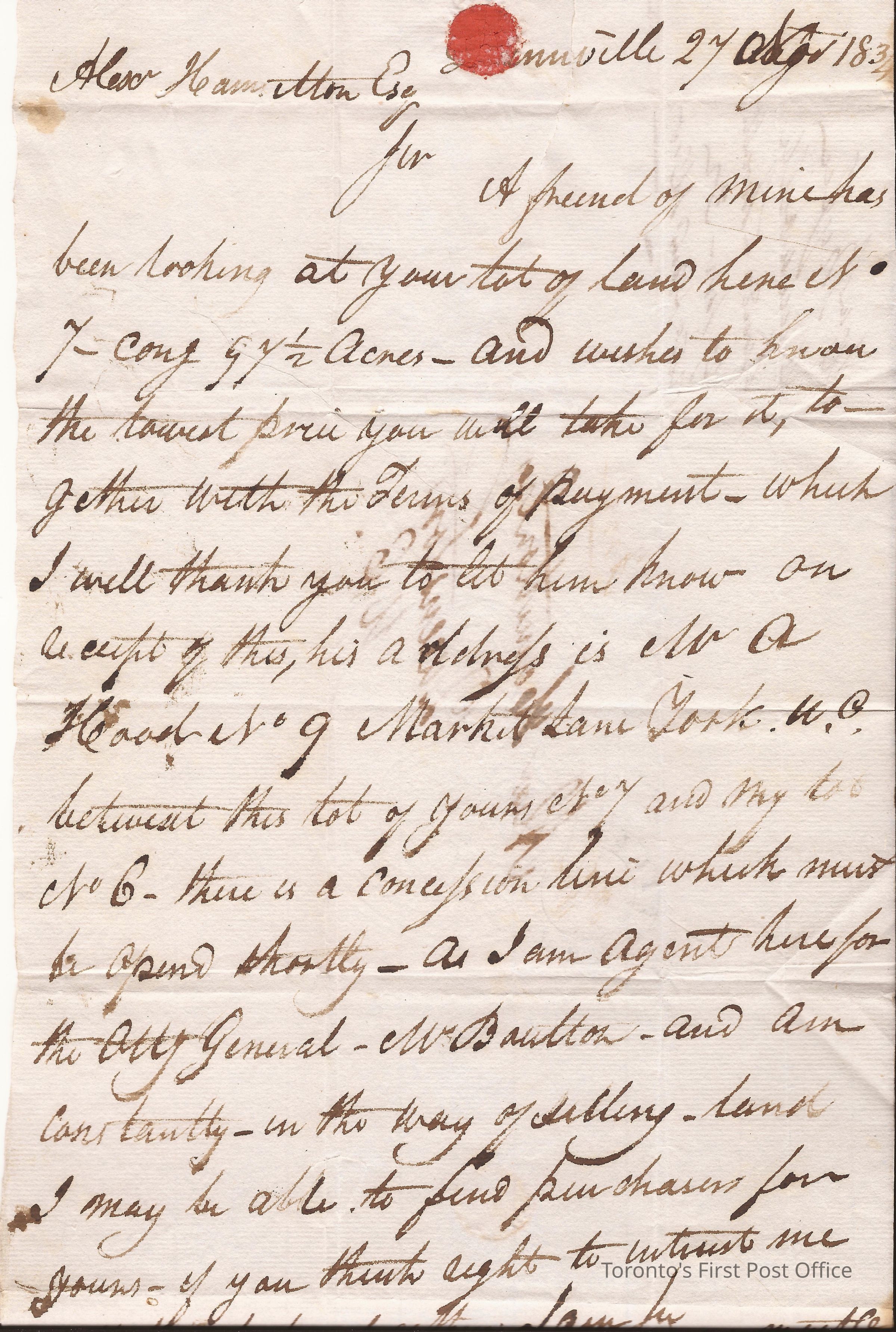 Letter from William Mylor, Dunnmilte; from Alex Hamilton, Esq., Queenston, U.C.; laid paper; watermark: medallion surmounted by crown; red sealing wax; black ink faded to brown; black date stamp: 27 Aug 1834.Dimensions
