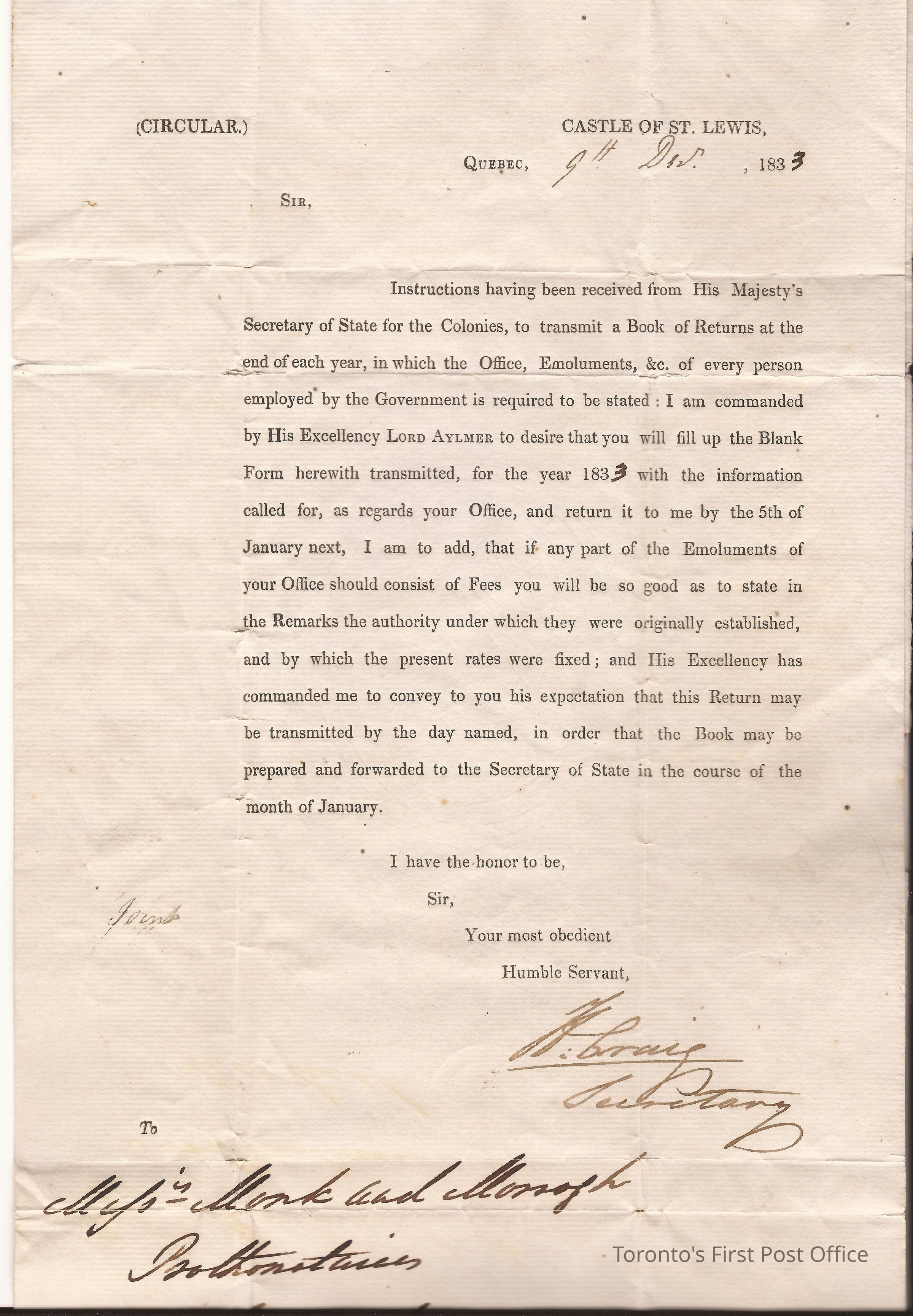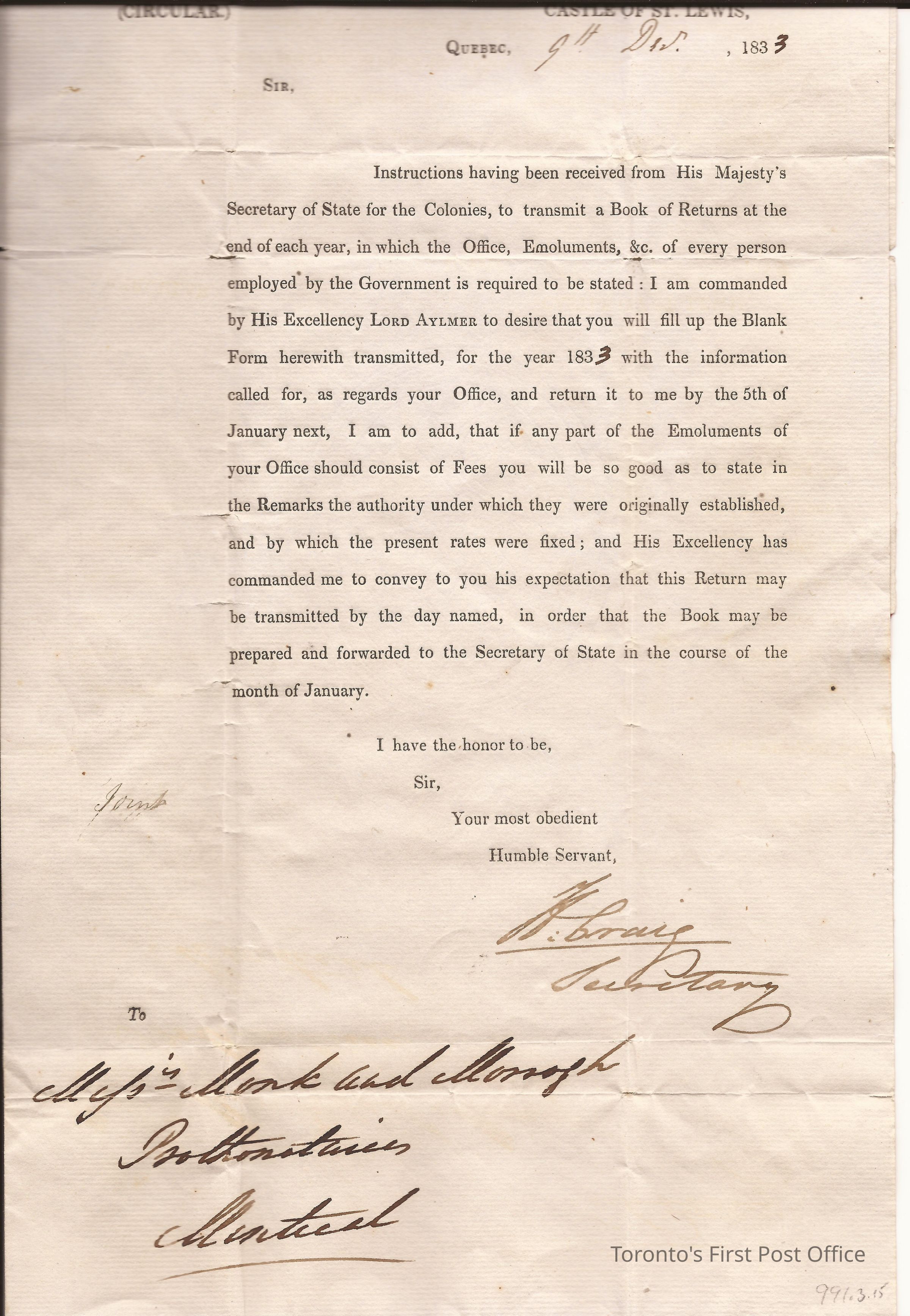Letter from H. Craig, Secretary; to Prothonataries, Montreal; red wax seal; watermark: "Harris 1832"; dated 9 Dec. 1833.Dimensions