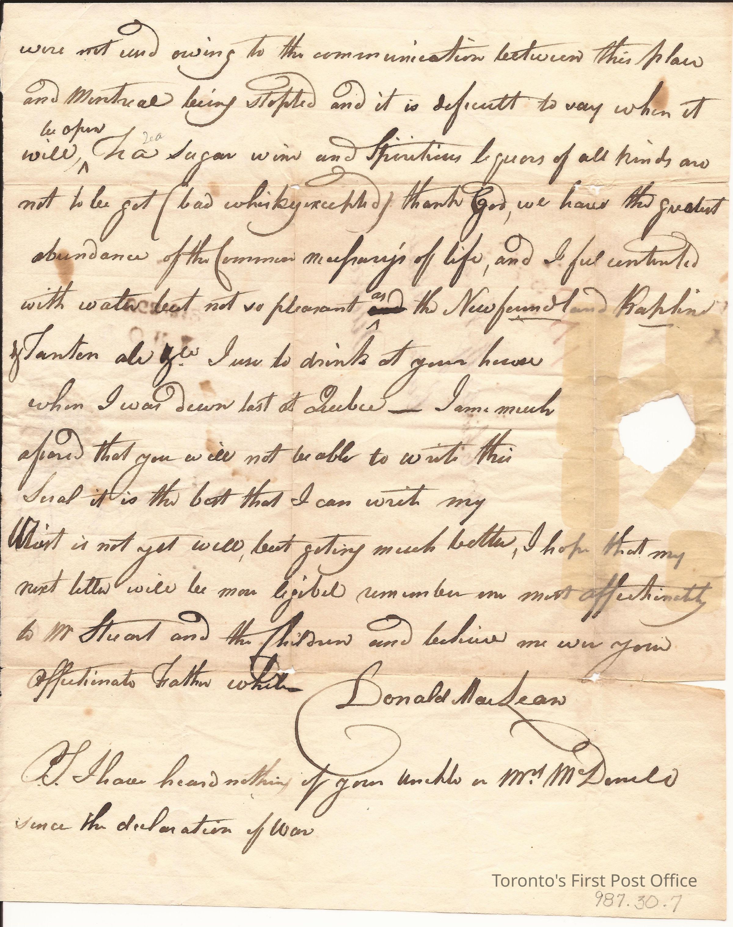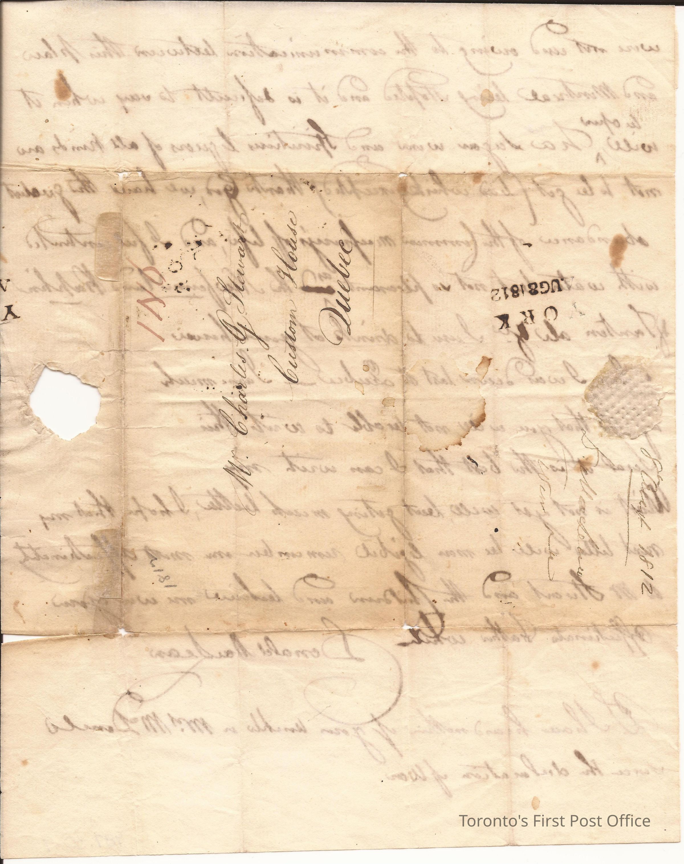Letter from Donald Maclean, Clerk of Upper Canada Assembly, to Charles G. Stuart, Customs House Quebec; postmarks: 8, August, 1812; yellowed paper with seal; watermark: "INO"; letter rate on address.Dimensions