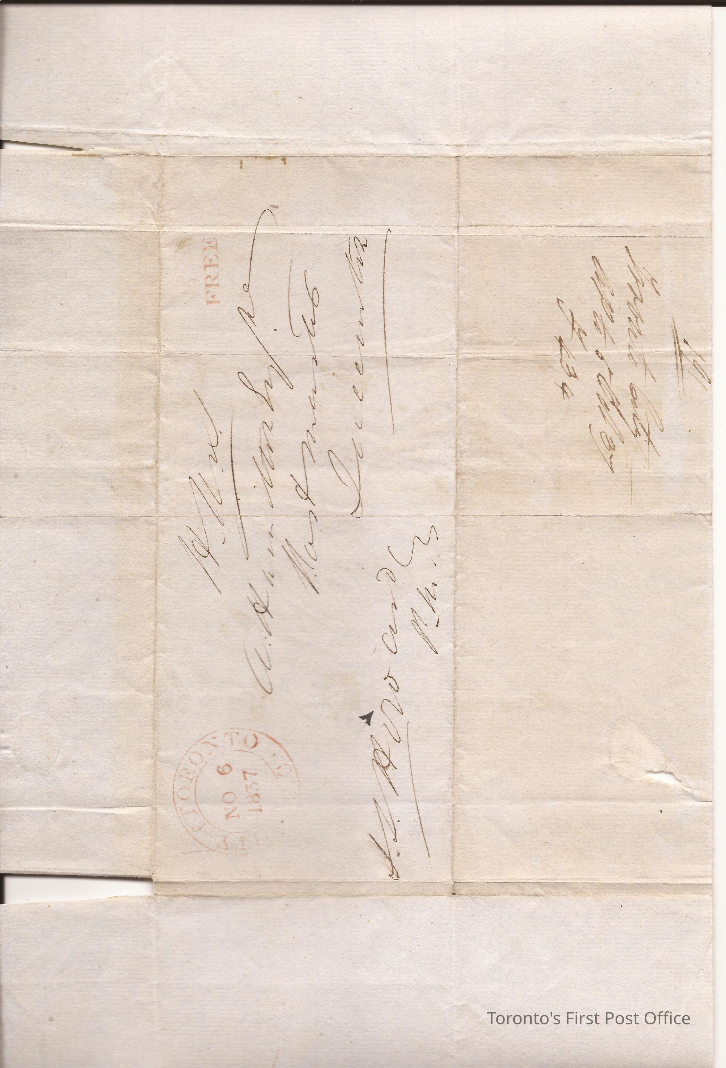 Letter from J.S. Howard, Toronto, to A. Hamilton, Esq., Queenston; 6 Nov 1837; olive-beige paper; folded; postmarks: "City of Toronto No 6 1837, U.C.", "FREE"; watermark.Update Date