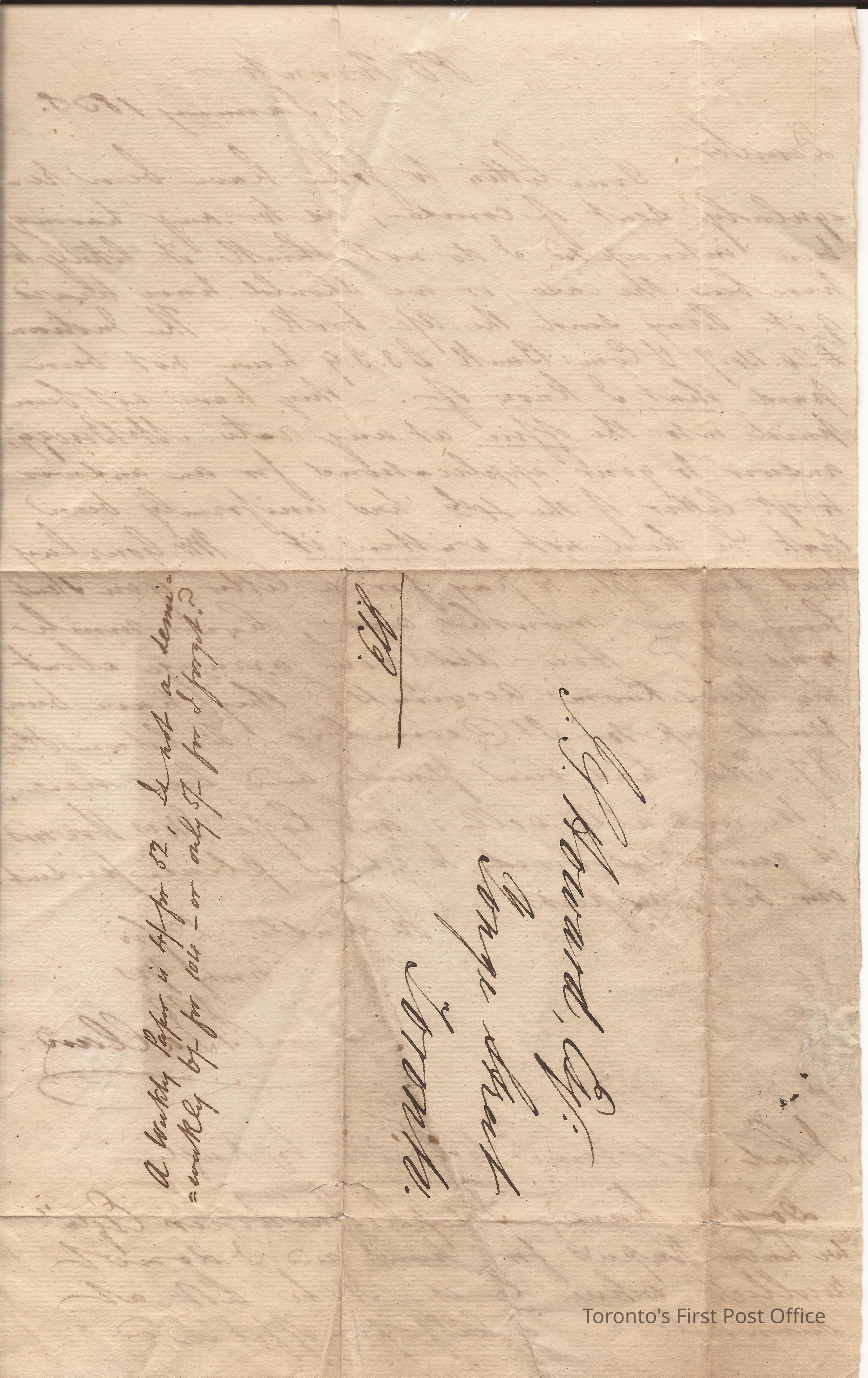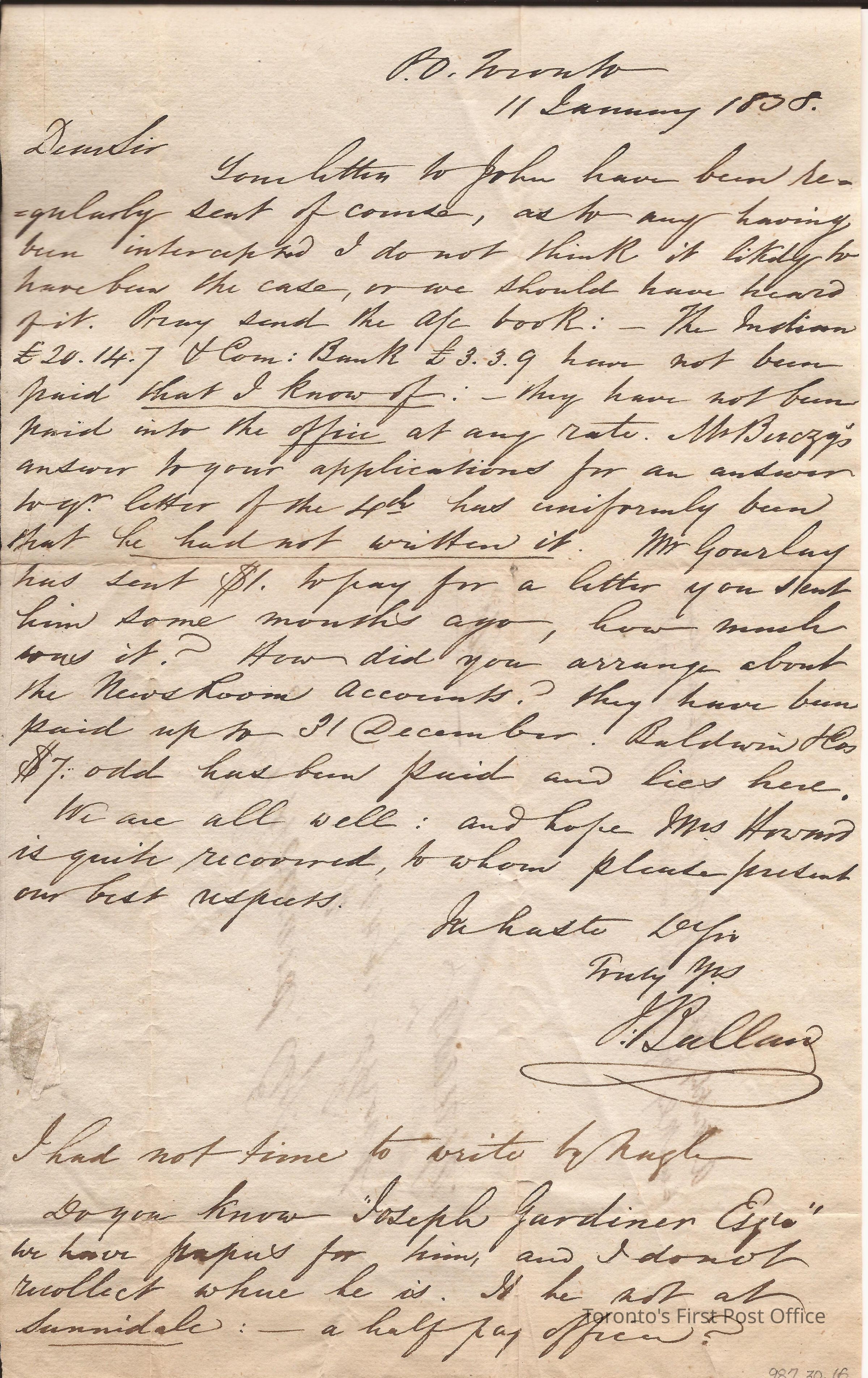 Letter from John Ballard, P.O., Toronto, to J.S. Howard, Yonge St., Toronto; 11 January 1838; long, olive-coloured paper, folded; no postmarks.Dimensions