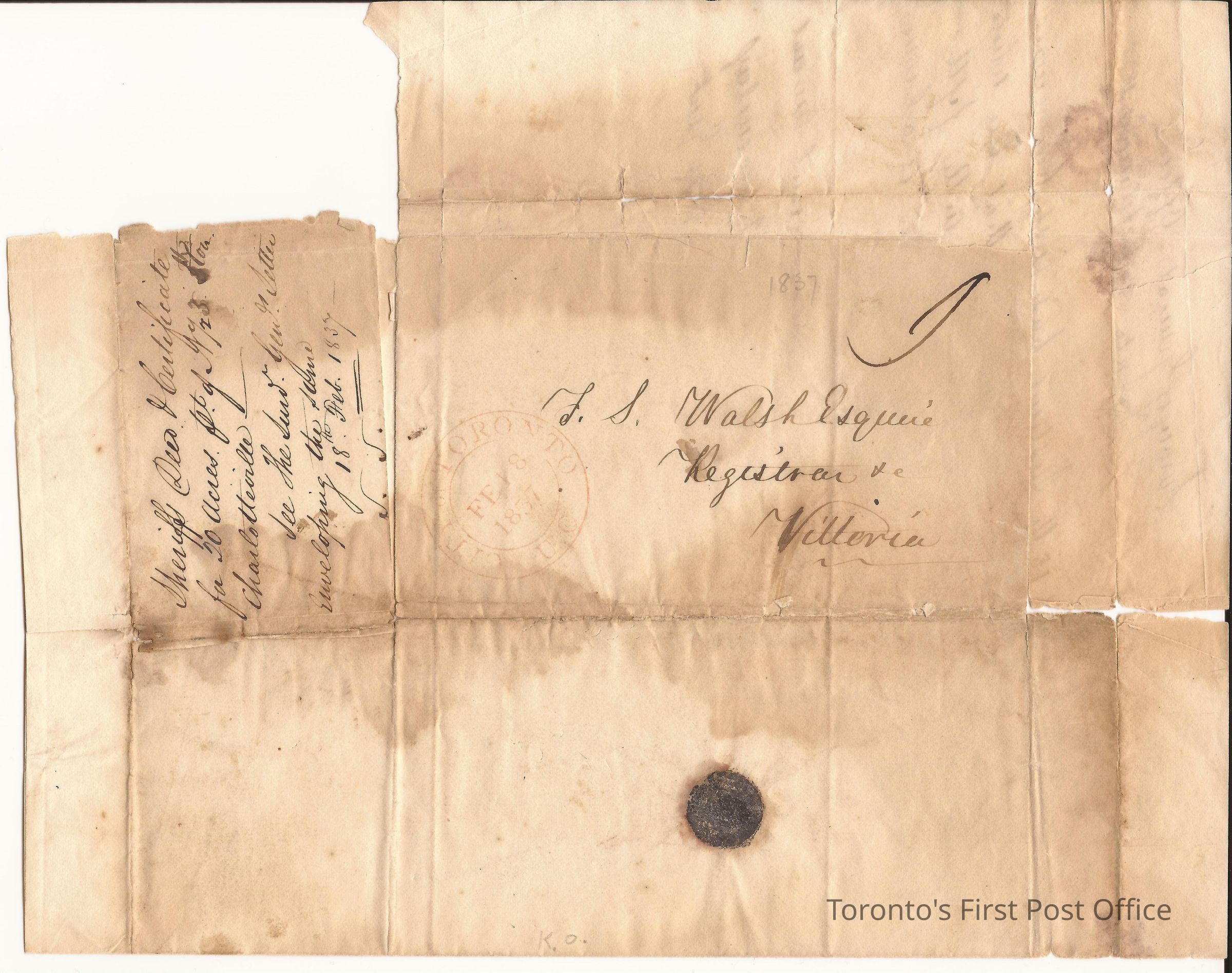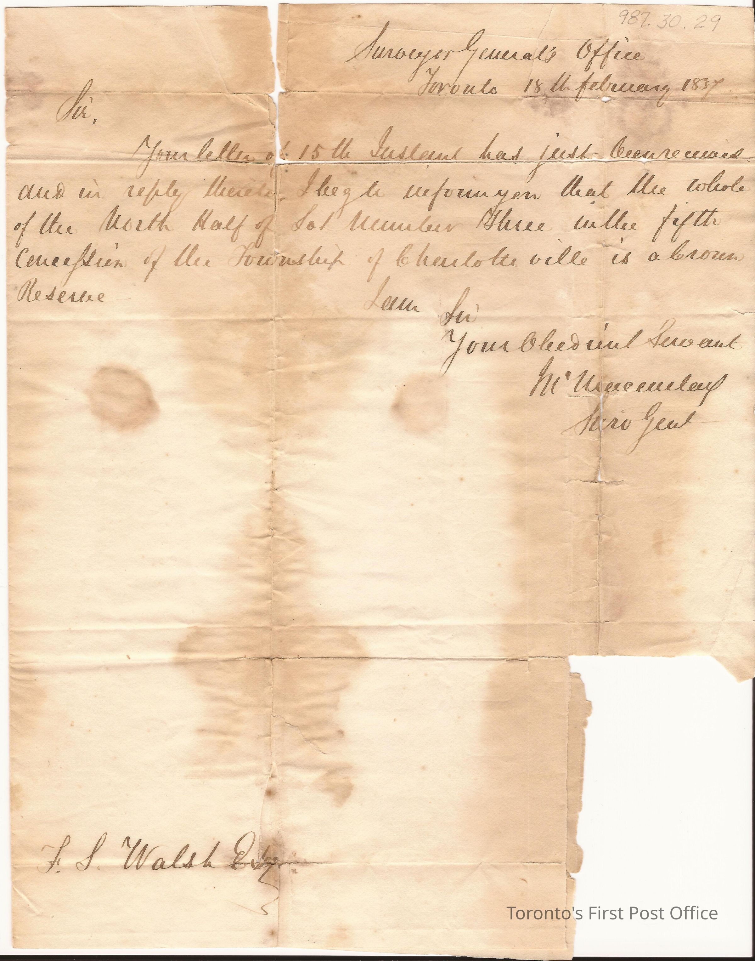 Letter from John S. Macauley; to F.S. Walsh, Esq., Registrar, Vittoria; dated: Surveyor General's Office, Toronto 18th February 1837; postmarks: "CITY OF TORONTO U.C. FEB 18 1837"; watermark: "J&J TOWN TURKEY MILL 1836".Dimensions