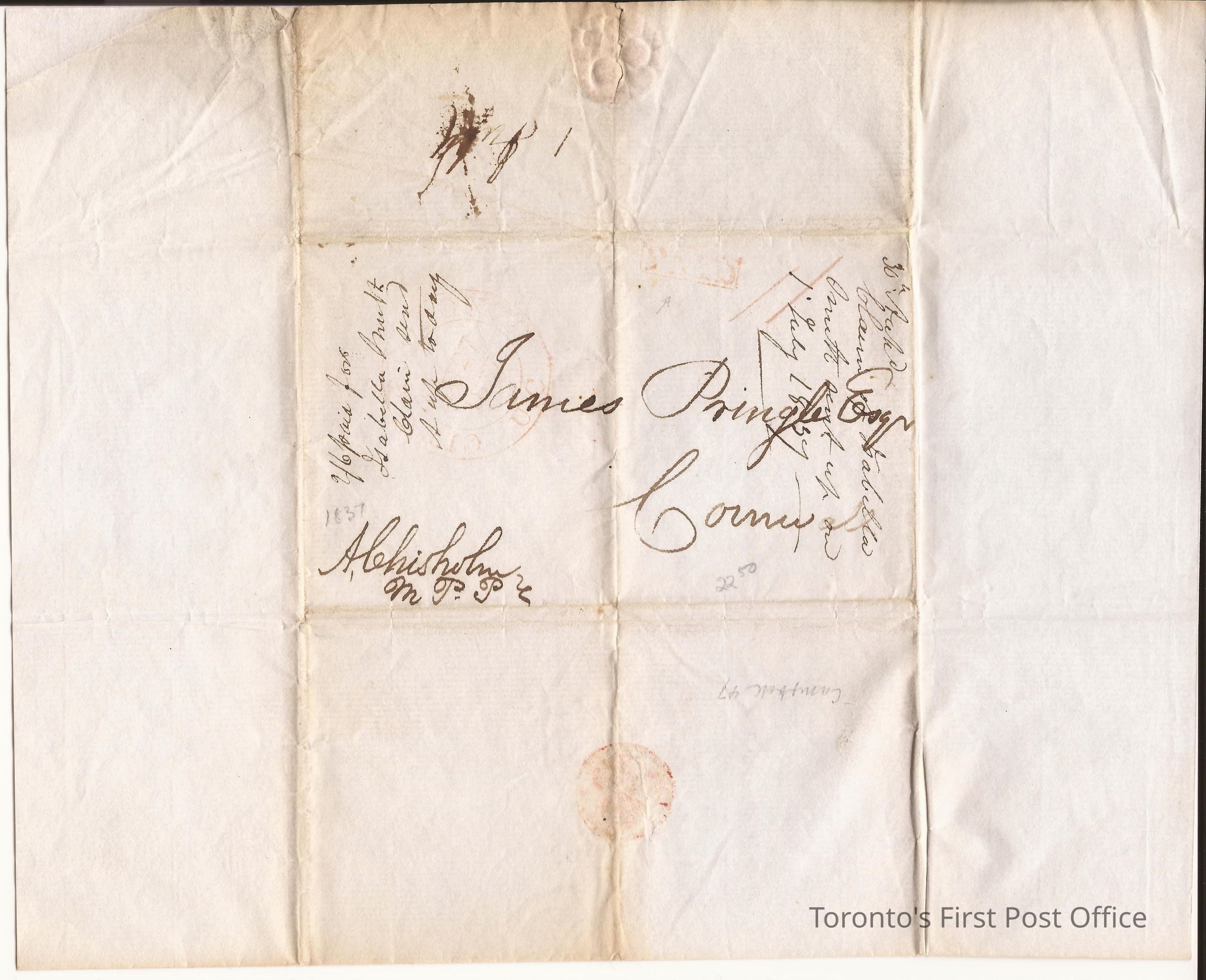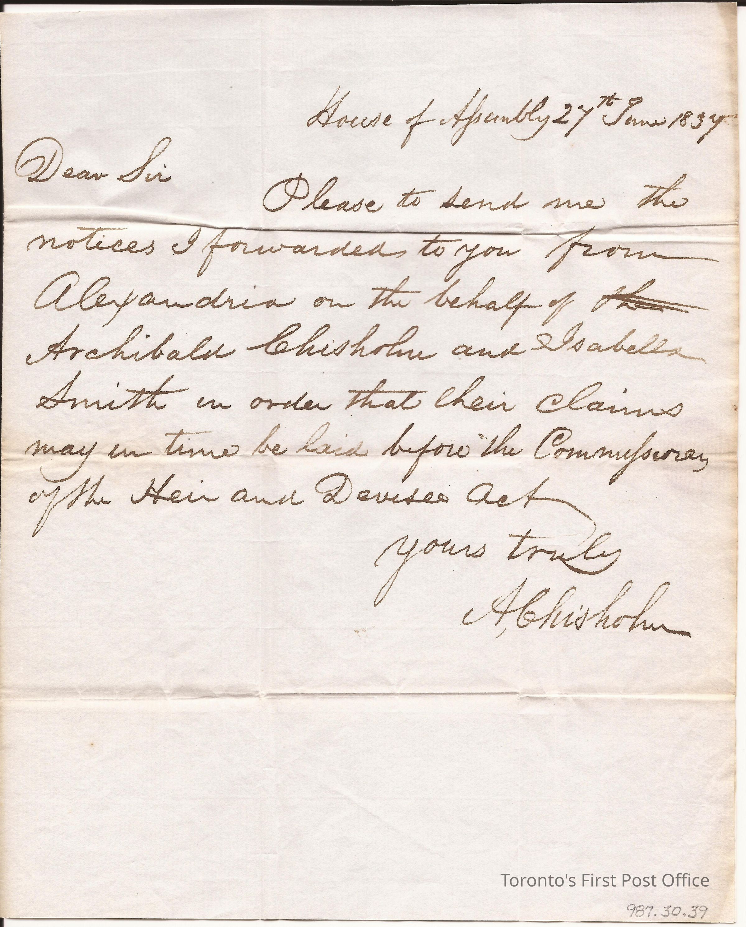 Letter from Alexander Chrisholm MPP Glengarry; to James Pringle Esq. Cornwall, District Agent, Crown Lands Office, Cornwall; dated: House of Assembly 27 June 1837; postmarks: "CITY OF TORONTO JU 1837 U.C.", "PAID"; red wafer seal; laid paper; watermark: elaborate shield surmounted by crown; re: claims made by heirs.Update Date