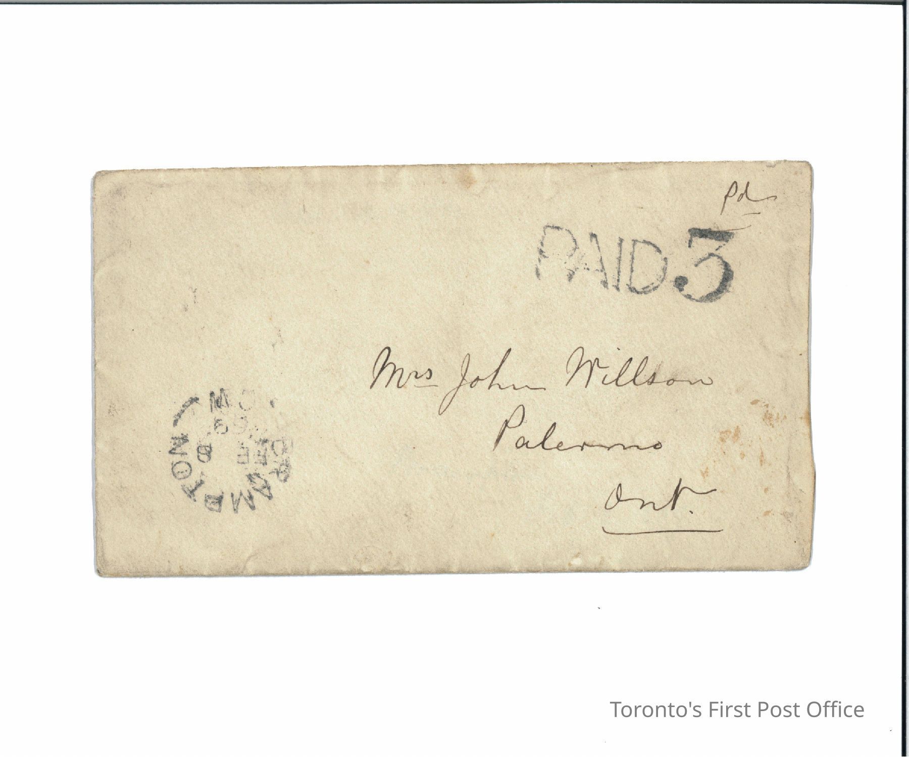 .1: Envelope: addressed to “Mrs John Willson, Palermo, Ont.”; and “pd” in top right corner in dark brown manuscript; postmarked “BRAMPTON CW FE 8 69”; also stamped “PAID 3” all in black; reverse has three postmarks: illegible, red; “PA…RMO…W…FE…1860”, dark red; and “GEORGETOWN… FE 9 69”, black