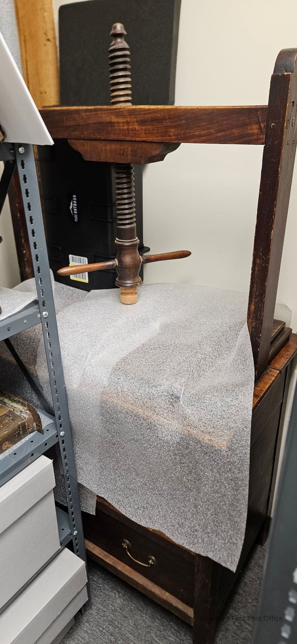 Letter press; oak; on oak stand with three drawers with keyhole and two brass pulls each; middle drawer lined with purple paper (modern); circa 1840.Update Date