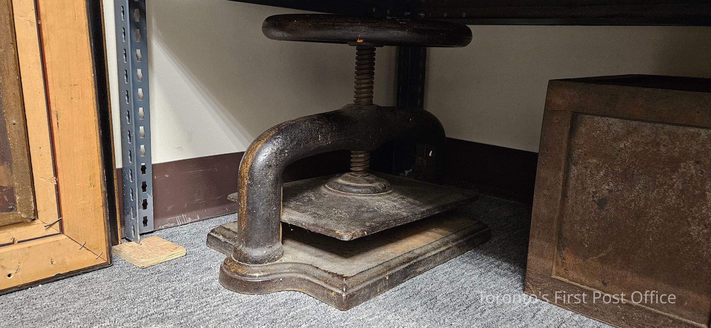Letter press; cast iron; rectangular; base is stationary, top plate moves up and down by screw mechanism attached to wheel; circa 1840.Dimensions
