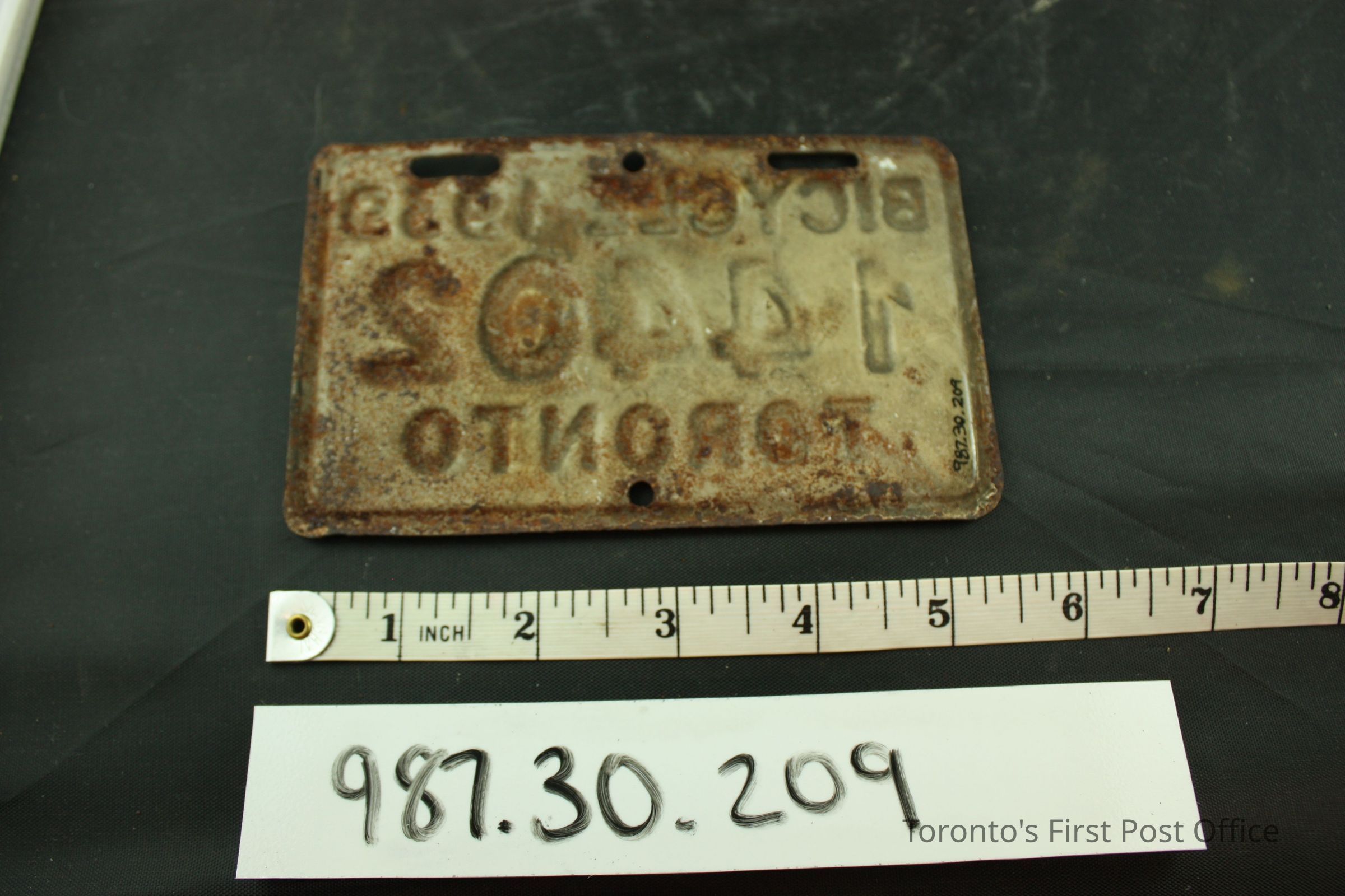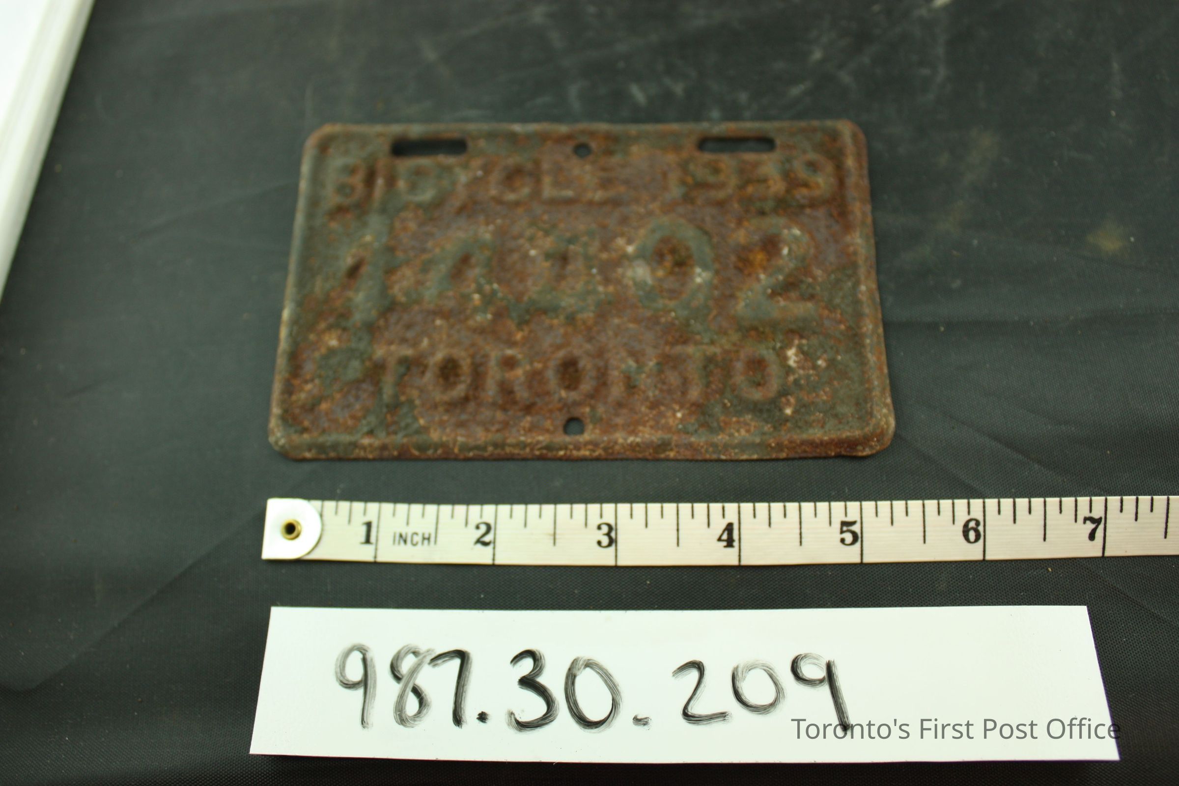 Tin license plate; embossed: "BICYCLE 1939 14402 TORONTO"; front is rusted throughout; beige paint on reverse; 3 holes at top; 1 hole at base; found on the first floor of the Cumberland addition, covered by the 1940 floor.Update Date