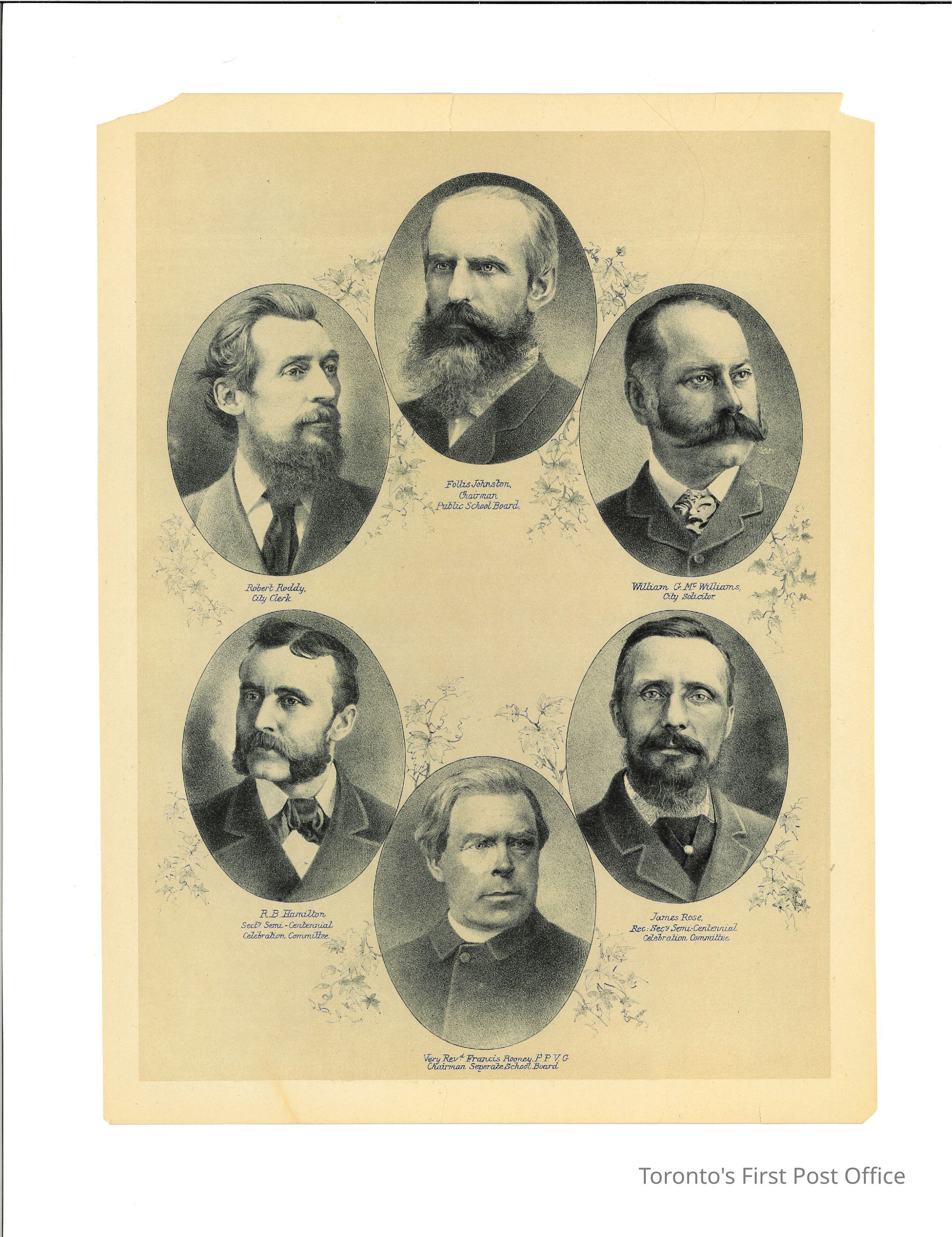 One lithograph page featuring six portraits of city hall bureaucrats on two pages. Top: (left to right) Robert Roddy: City Clerk, Follis Johnston: Chairman Public School Board, William G McWilliams: City Solicitor. Bottom: (left to right) R.B. Hamilton: Secretary Semi-Centennial Celebration Commitee, Very Reverend Francis Rooney, P.P.V.G. Chairman Seperate School Board, James Rose: Rec: secretary Semi-centennial Celebration CommitteeDimensions