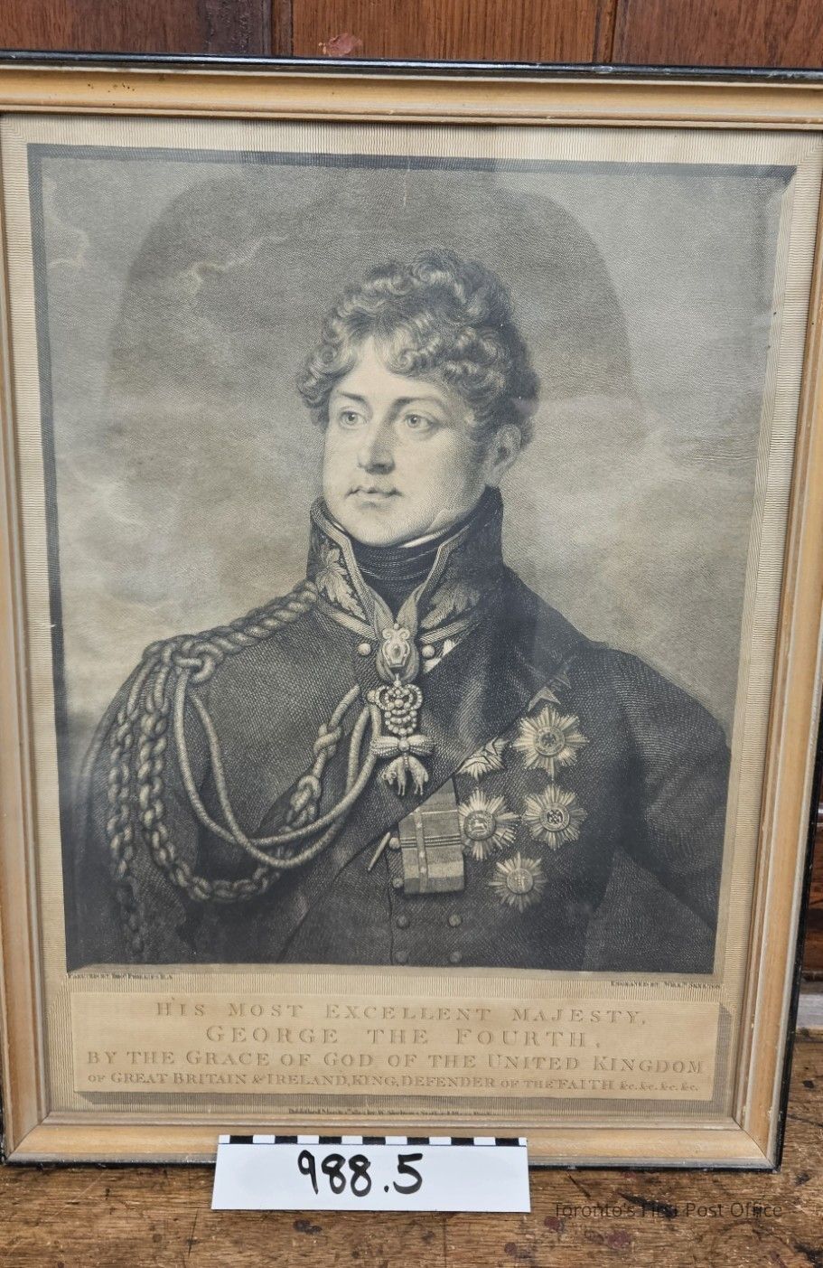 Lithograph; inscribed: "George IV His Excellent Majesty George the Fourth by the grace of God of the United Kingdom of Great Britain, Ireland, King, Defender of the Faith"; painted by Thos. Phillips R.A.; engraved by Willm Skelton; published March 4th 1810 by W. Skelton, Stafford Place, Pimlico; black and gold wood frame.Dimensions