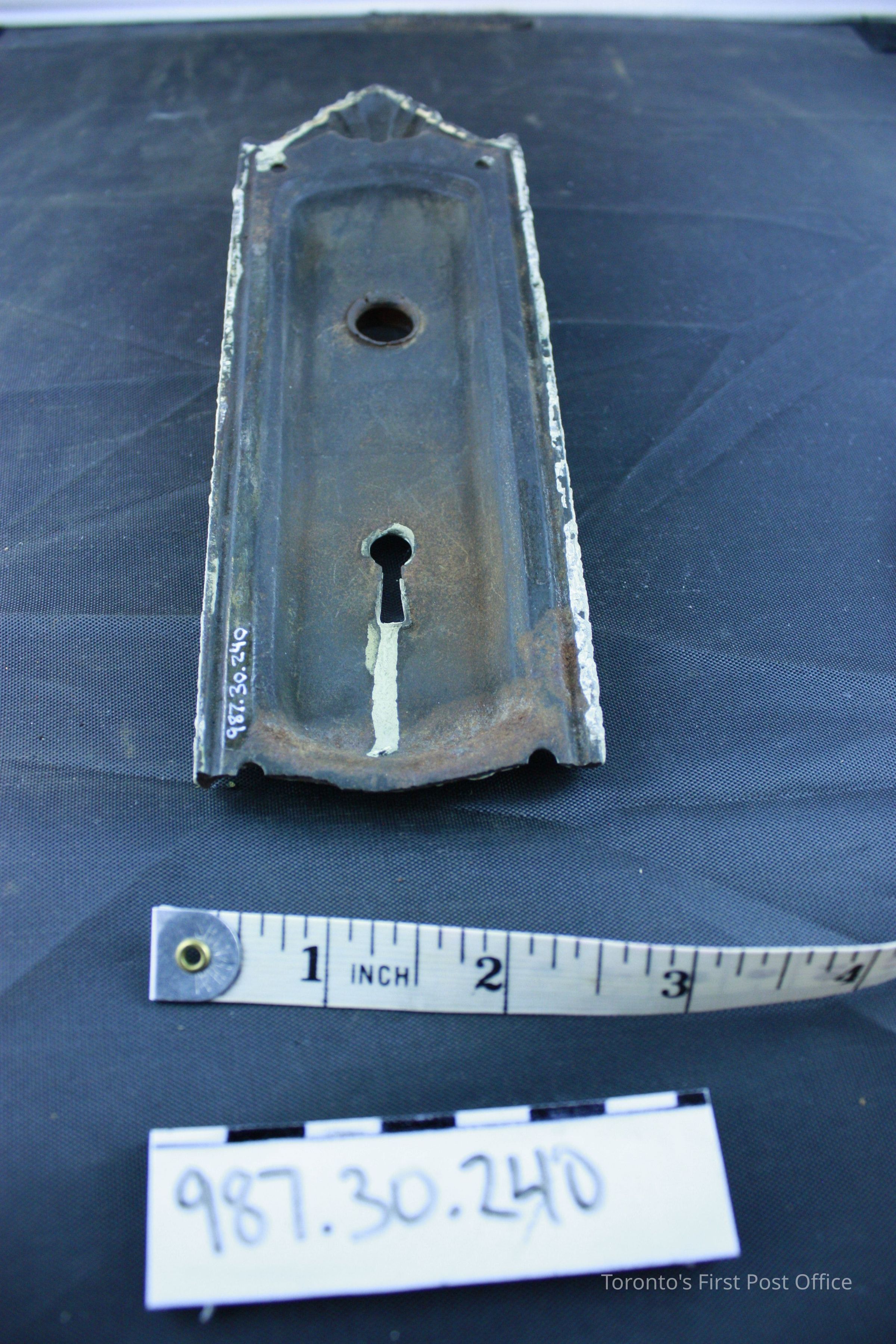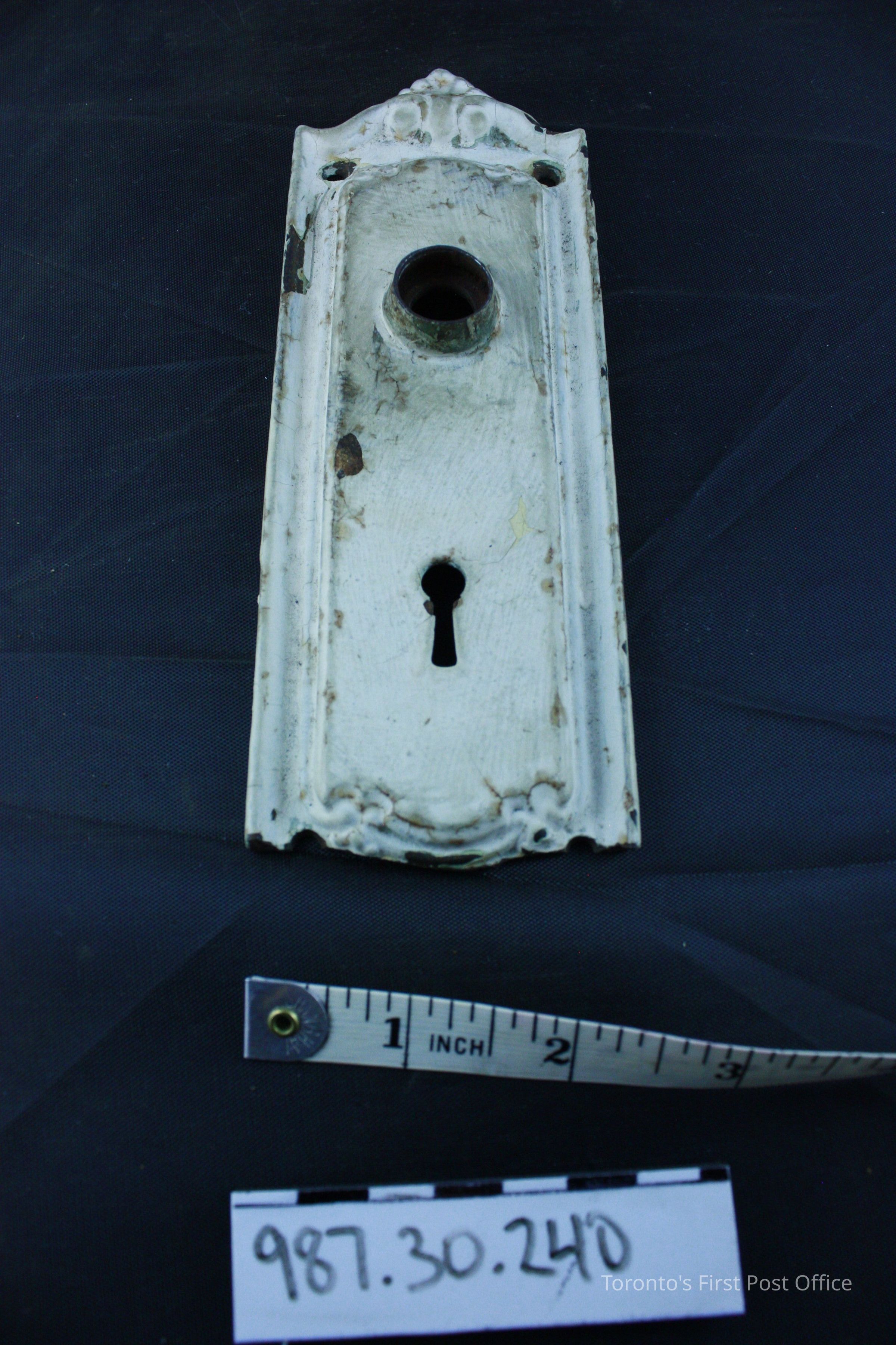 Cast iron lock cover; cream paint; decorative scroll work at top; small scroll work at bottom below key hole; circa 1851; from first floor of Cumberland addition, matches existing original hardware on front door on George St.Update Date