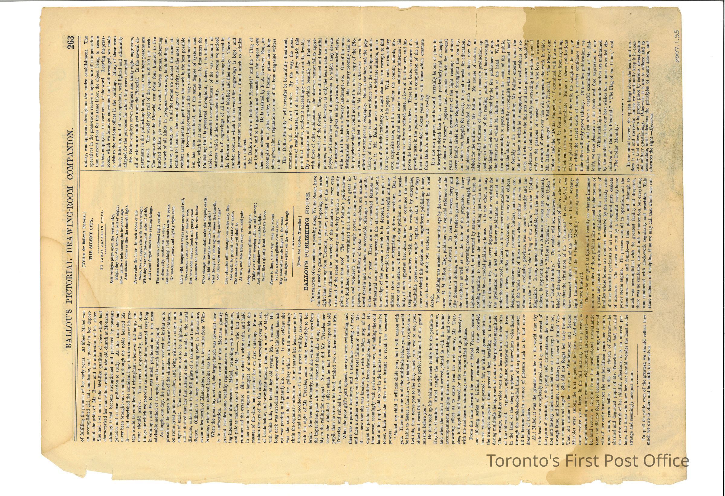 One page from Ballou's Pictorial Drawing Room Companion; double-sided pp. 263-264; article on p. 264 entitled "The Late Railroad Accident in Canada"; two engravings; all black print on off-white paper; c. 185-?Dimensions