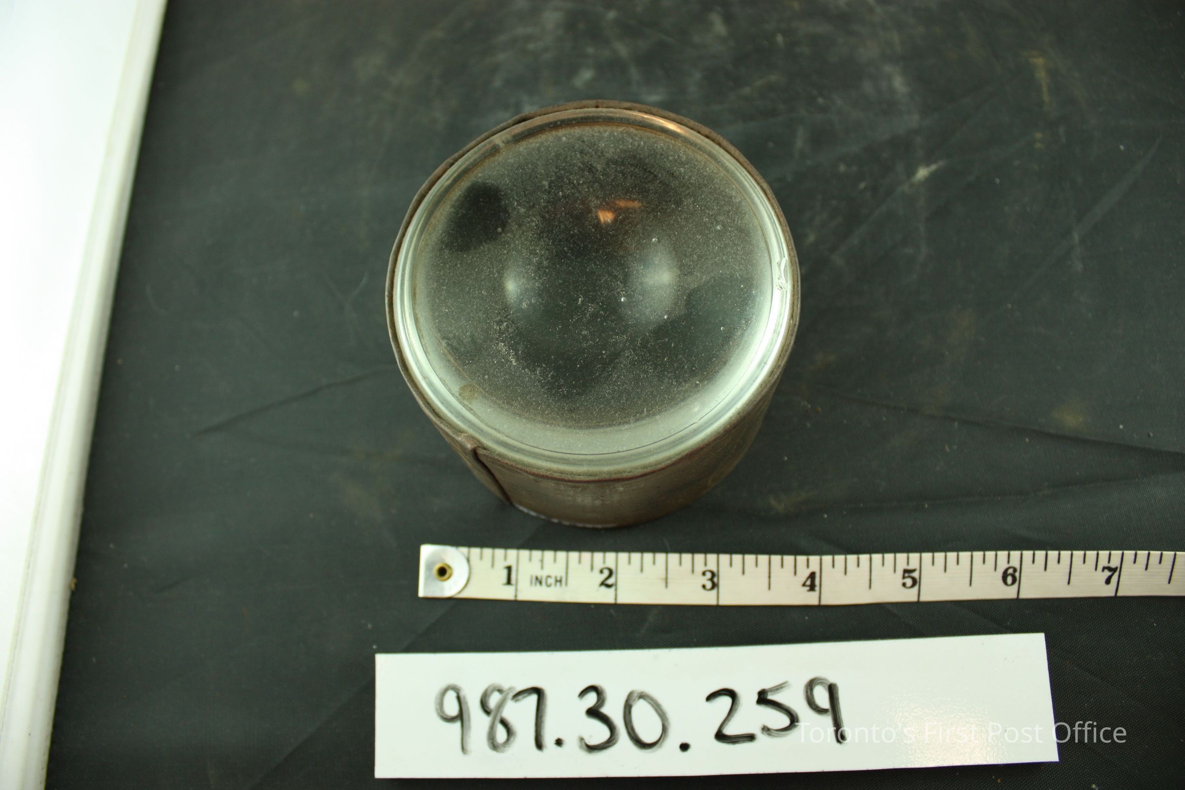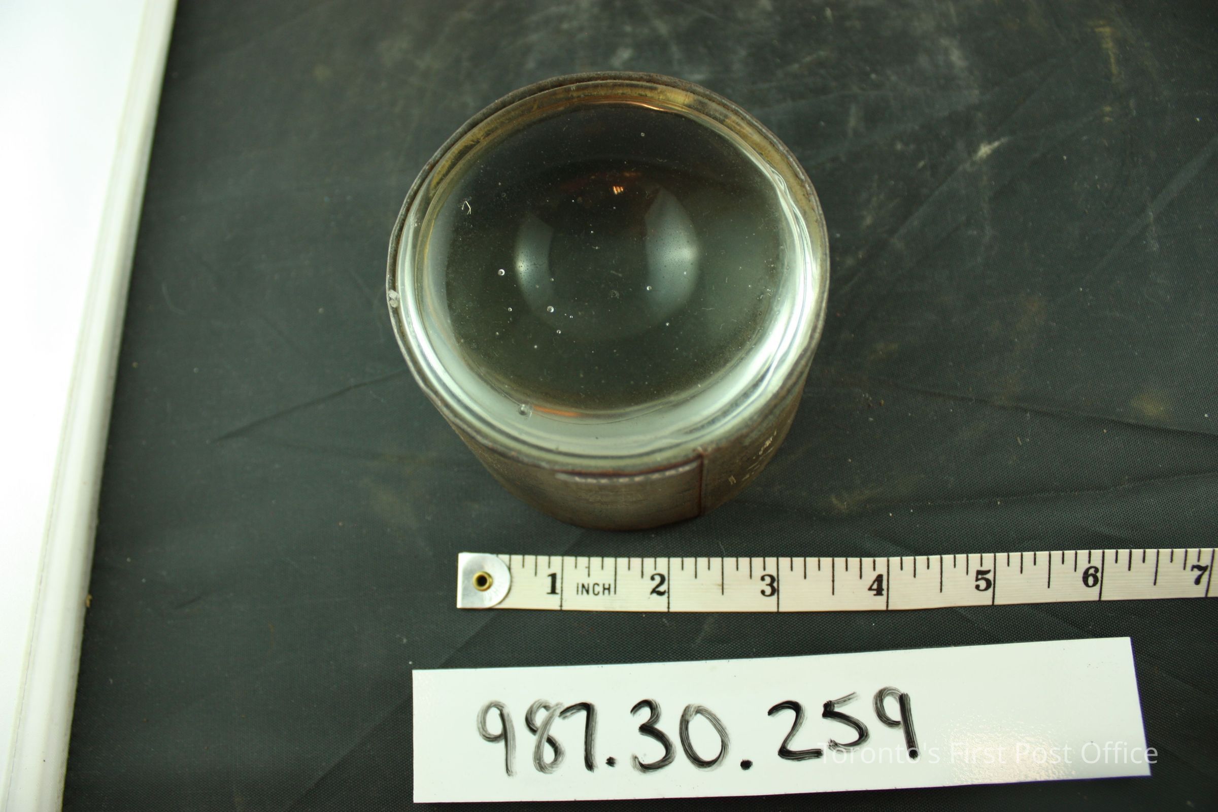 Magnifying glass; two lenses within circular metal casing; bubbles in glass.