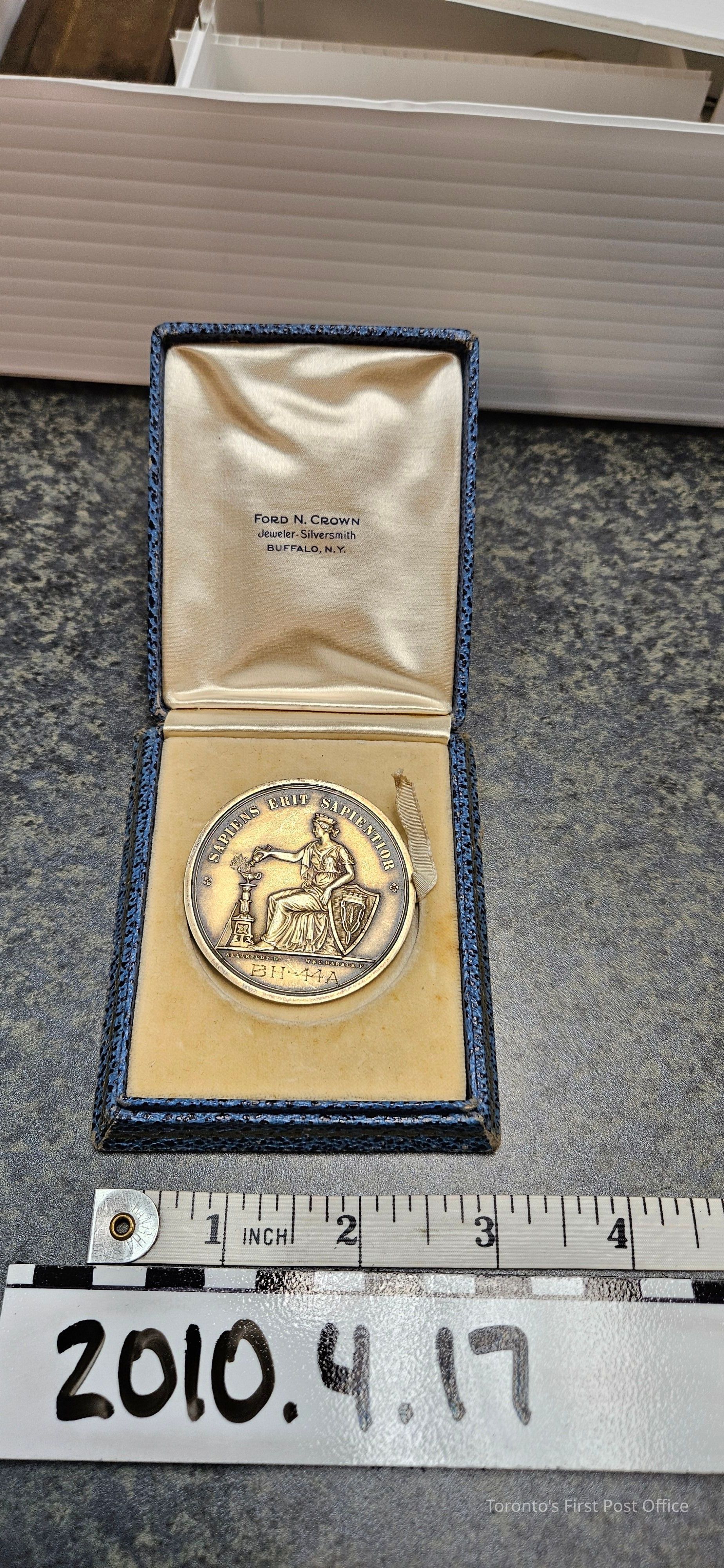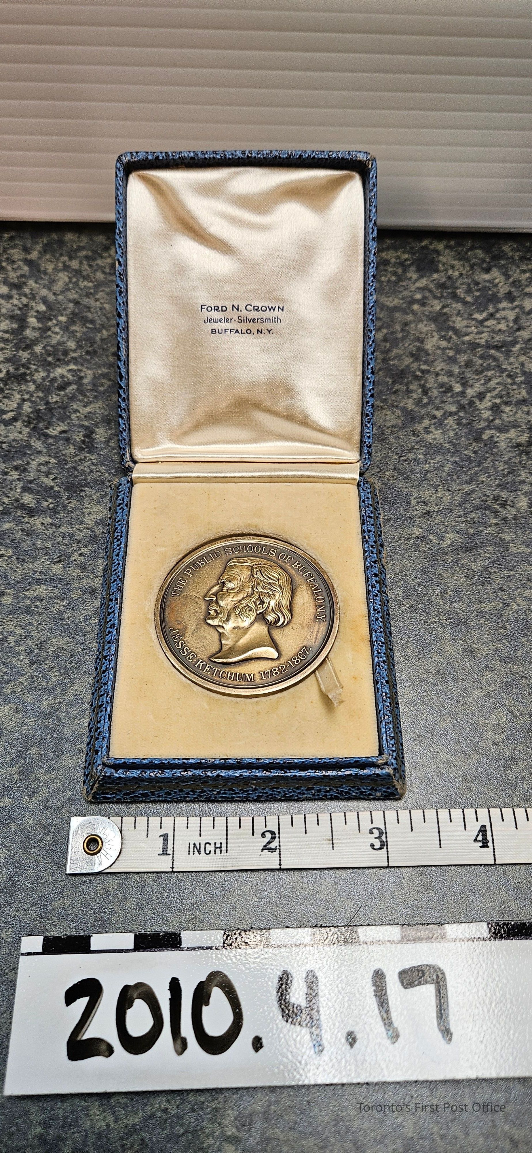 One medal in box. Obverse: portrait of Jesse Ketchum; has writing "The Public Schools of Buffalo N.Y. Jesse Ketchum 1782-1867". Reverse: portrays Liberty; has writing: "Sapiens erit Sapientor"; stamped serial number BH-44A; has engravers mark "W&C Barber F"; has designer mark "Sellstedt D.". The blue box has words "Ford N Crown Jeweler. Silversmith Buffalo, N.Y." and has a ribbon inside to help take out the medal.Update Date