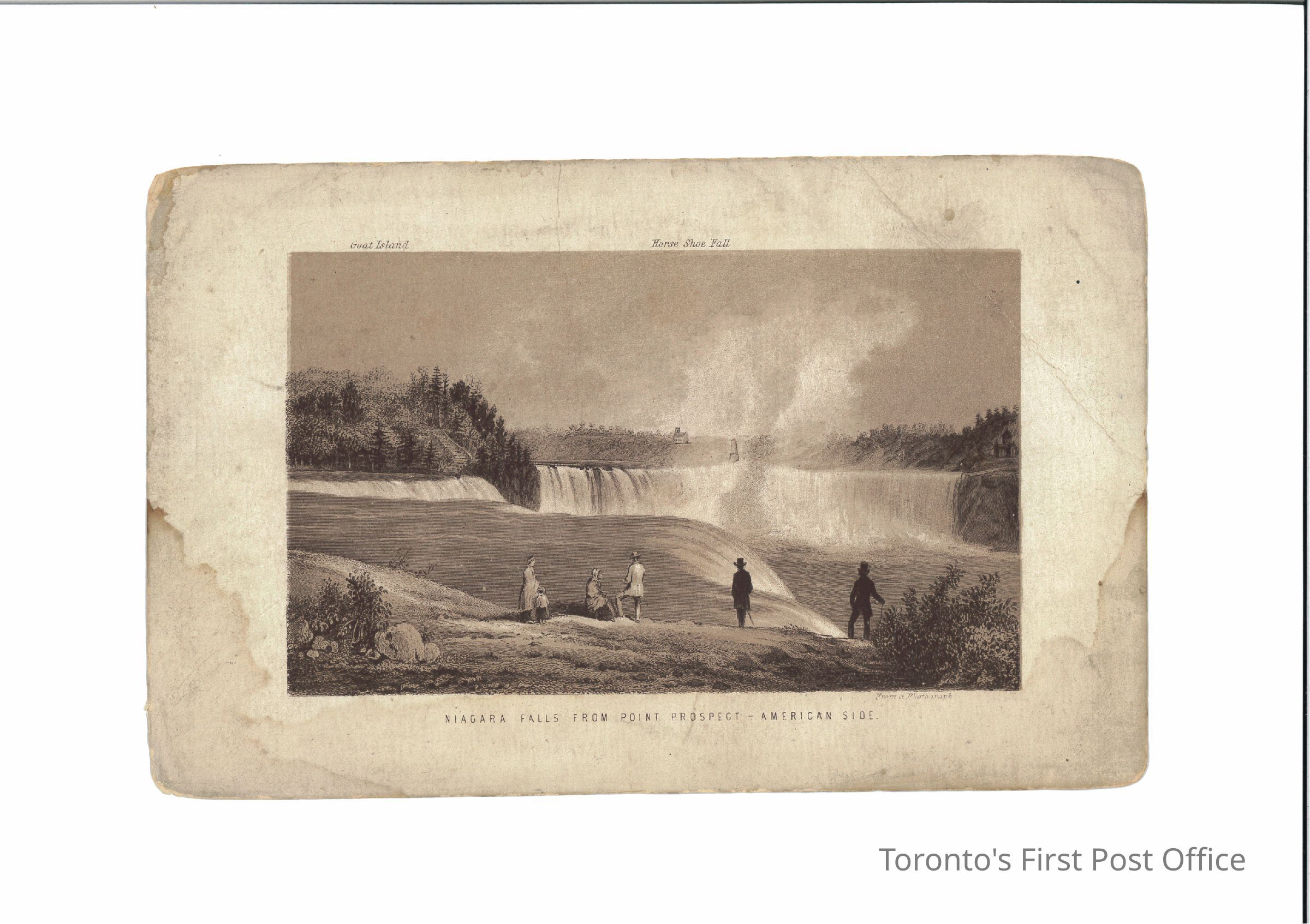 Four mezzo tints; c. 1850; as follows: .1: "NIAGARA FALLS FROM POINT PROSPECT - AMERICAN SIDE", also showing Goat Island and Horse Shoe Fall (labelled), three men, two women, one child, also labelled "From a photograph"; .2: "NEW SUSPENSION BRIDGE - NIAGARA" showing bridge and falls, road with five or six people walking; .3: "THREE SISTERS & GOAT ISLAND FROM CANADA SIDE", also showing Goat Island and Three Sisters (labelled), fence and road in foreground with horse and cart, man digging a hole, small barrow, also labelled "From a Photograph"; .4: "NIAGARA IN WINTER FROM CANADA SIDE", showing falls with blocks of ice at base, four men and one woman at rock outcrop in foreground; all in sepia on card with rounded corners.Dimensions