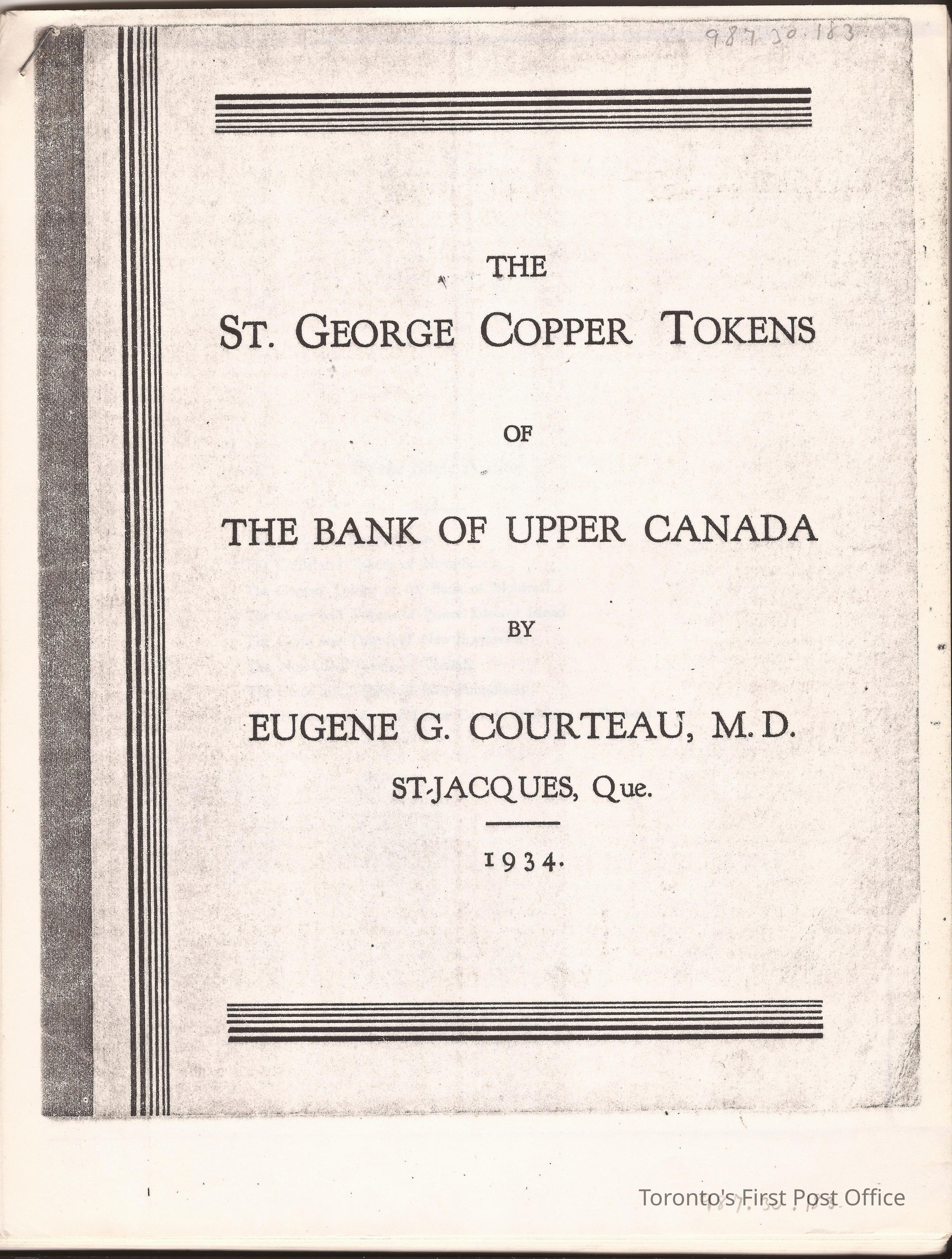 Monograph: "The St. George Copper Tokens of the Bank of Upper Canada by Eugene G. Courteau, M.D. St. Jacques, Que. 1934; photocopy; 30 pp.Dimensions