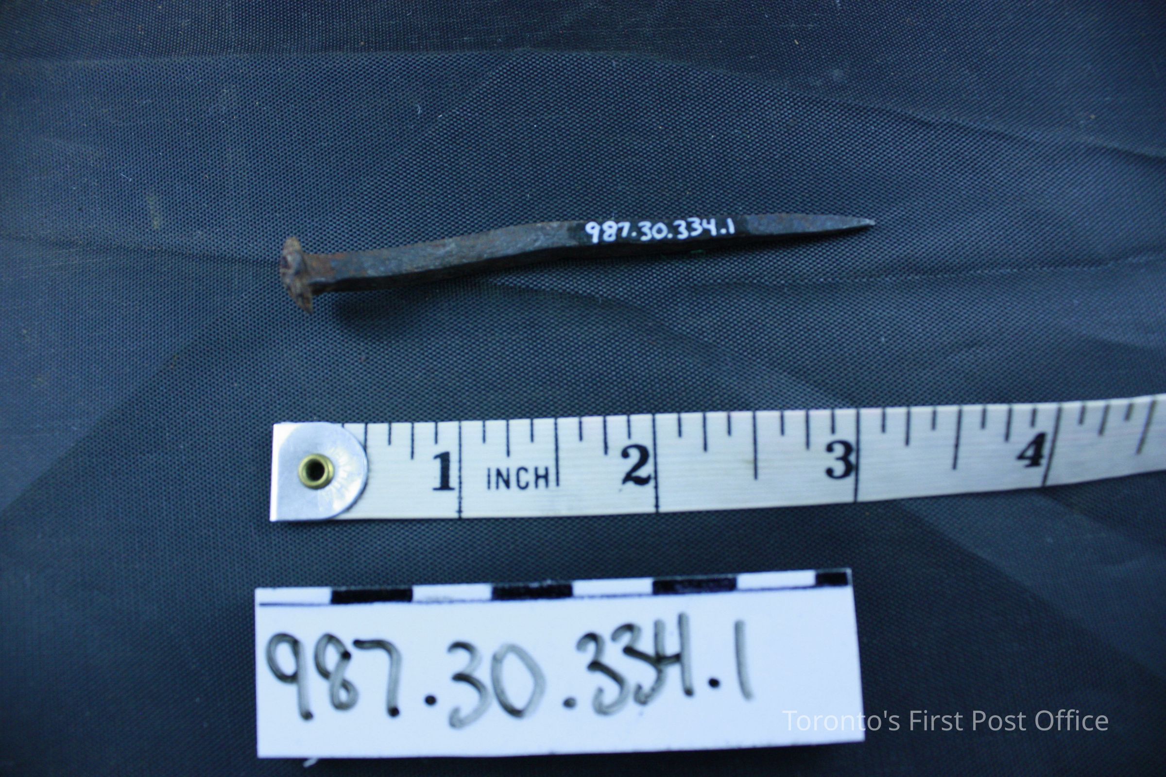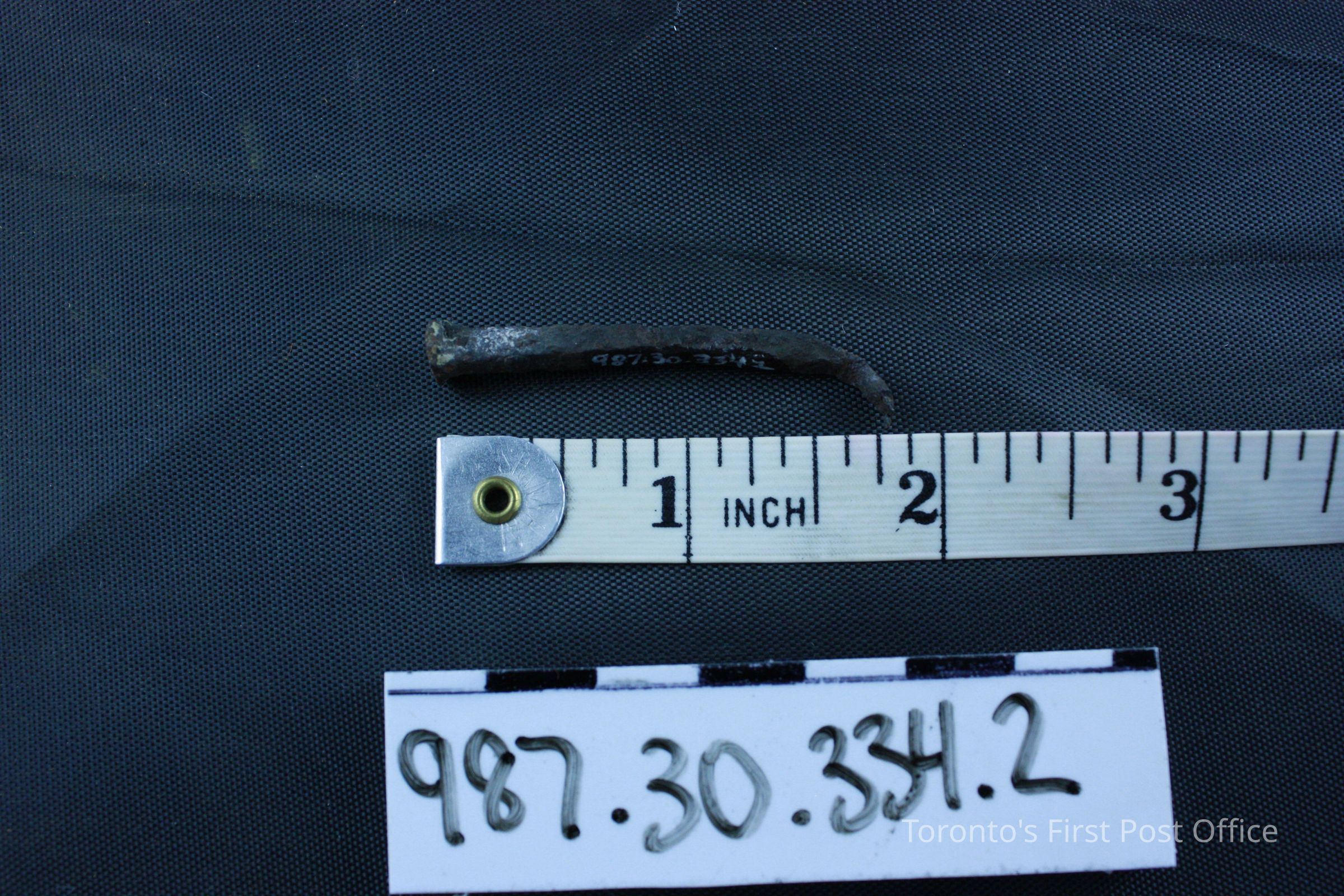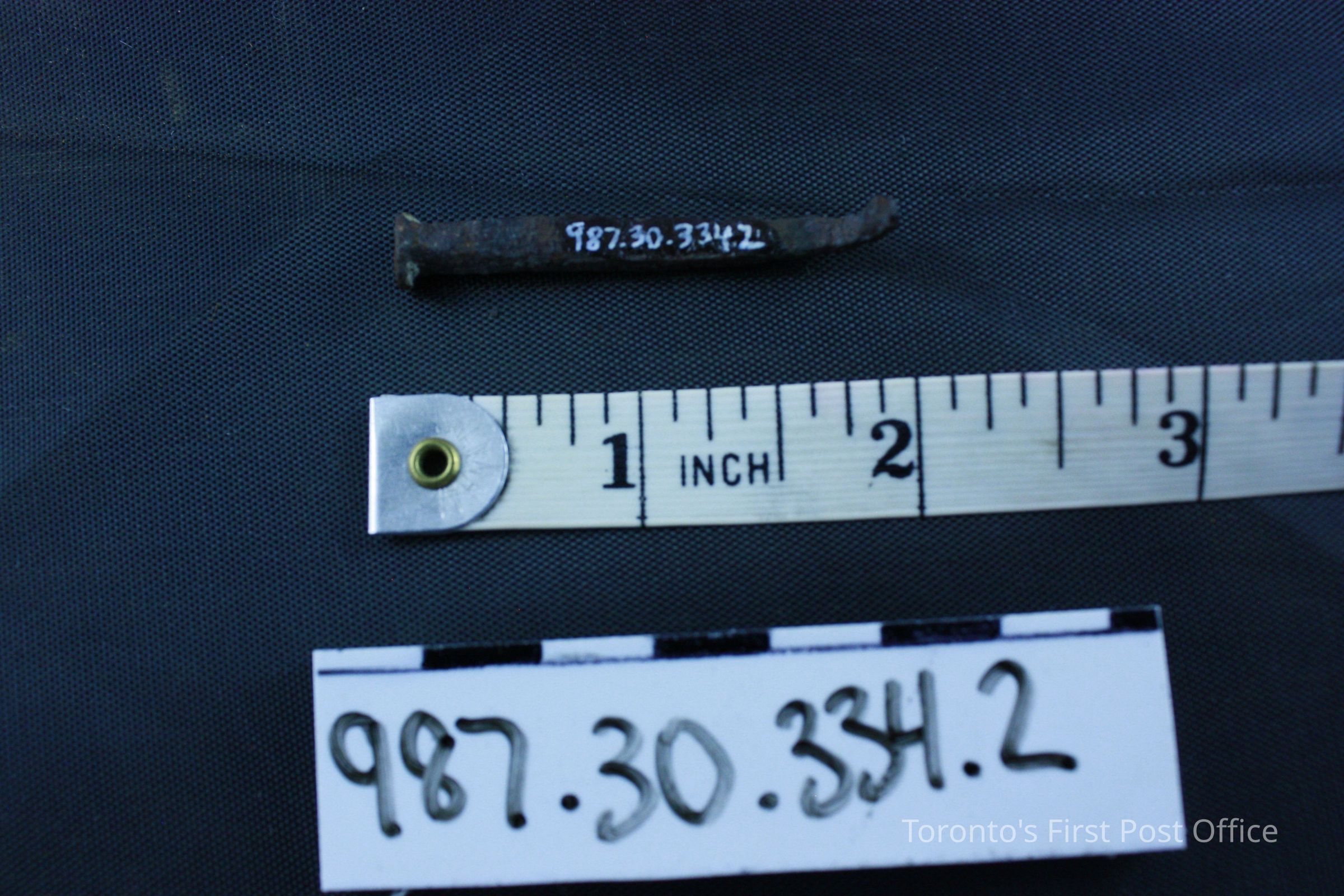 Two nails; roughly forged; irregular heads; bent; removed from above first floor window in south wall, east side.Dimensions
