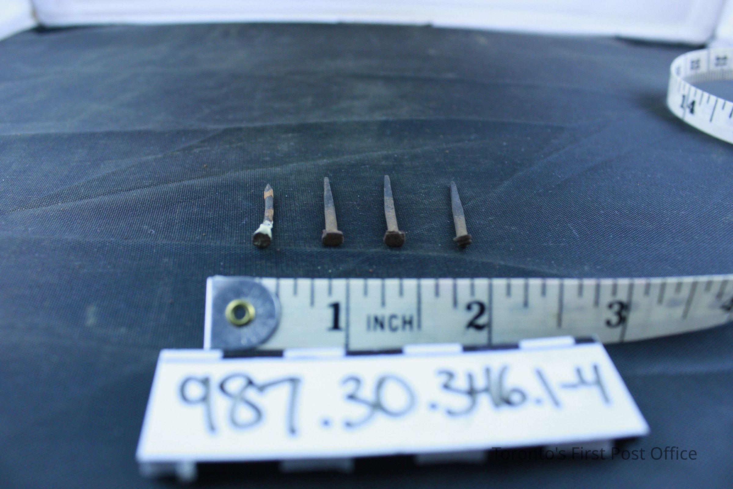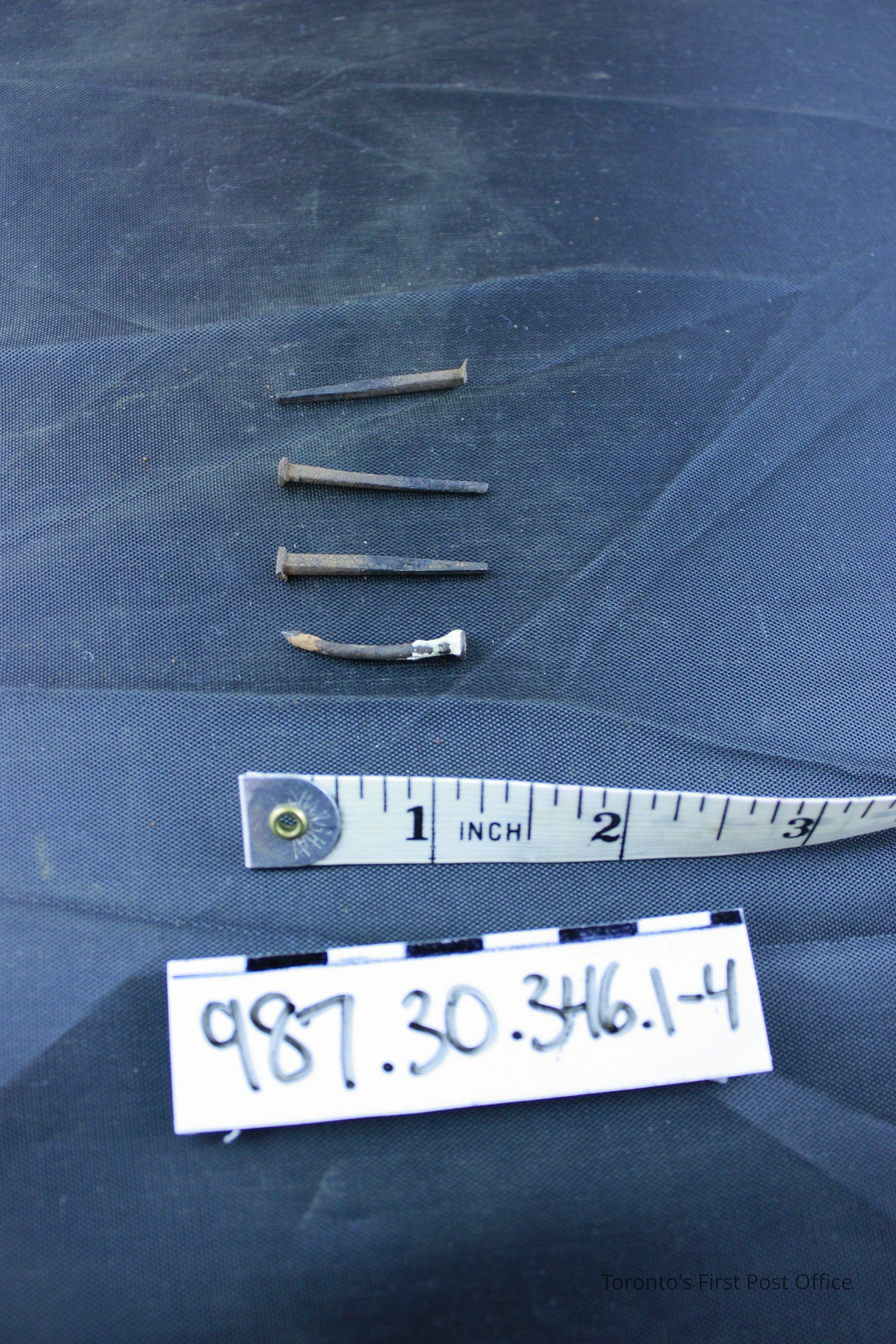 Four nails; iron; top halves rusty; beige paint on top half of .2; circa 1876.Dimensions