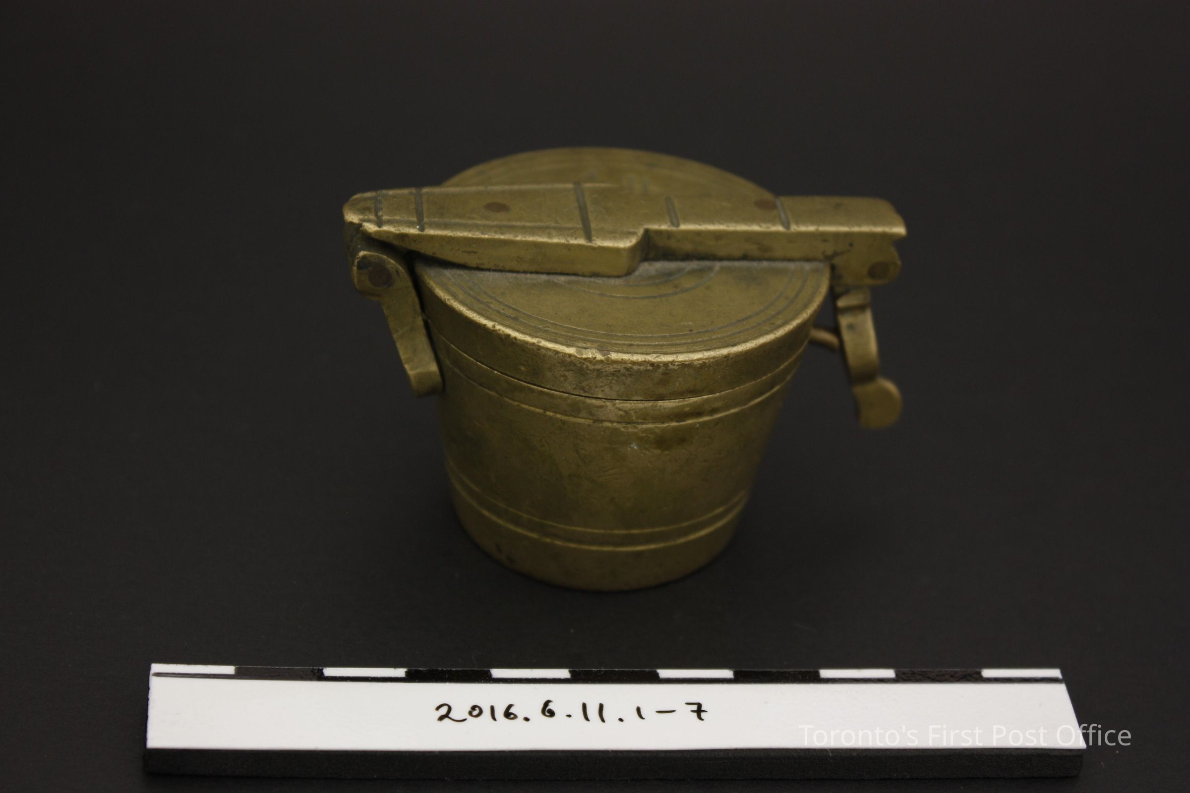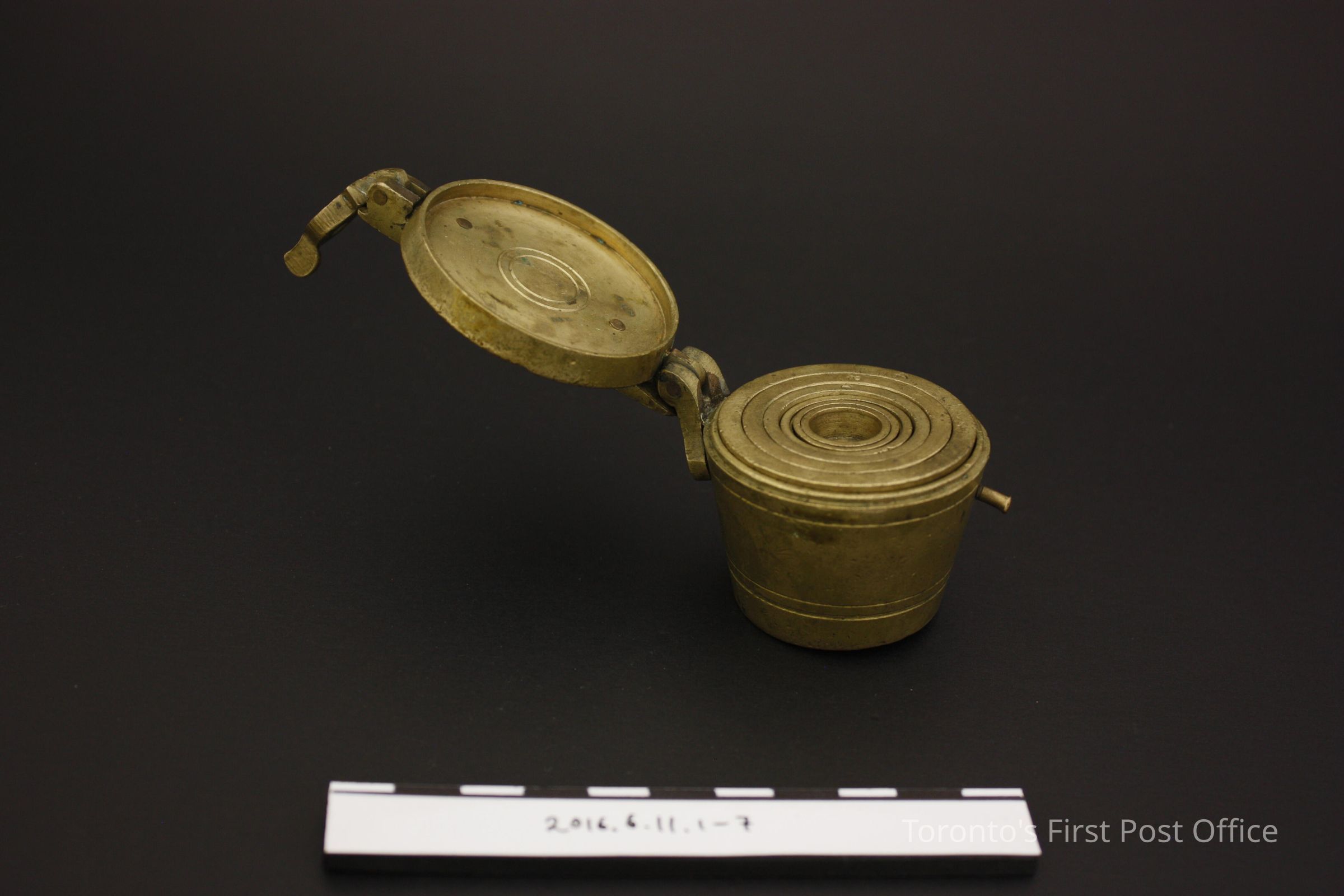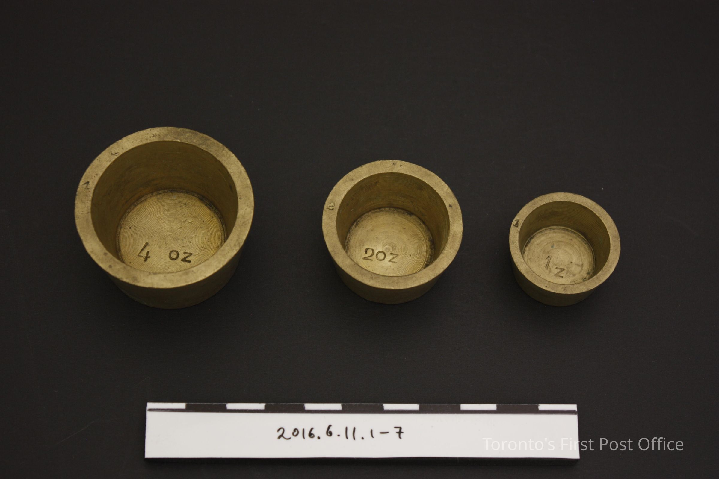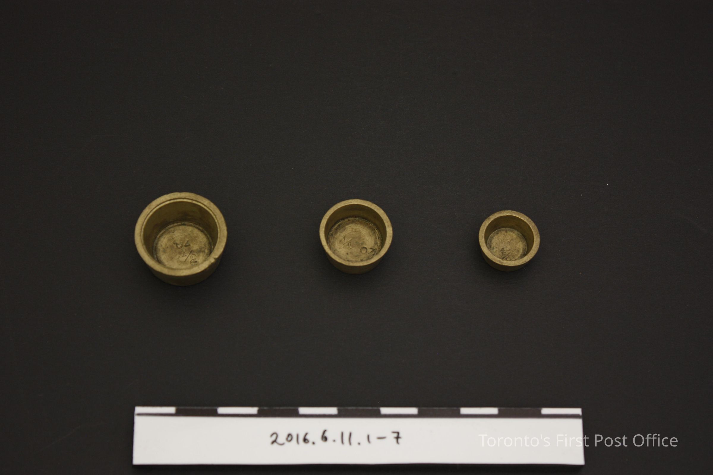 Nested Weights. Seven (7) brass nested weight, in denominations of 8 oz, 4 oz, 2 oz, 1 oz, 1/2 oz, 1/4 oz, and 1/8 oz. Missing pill (smallest/top) weight.Update Date