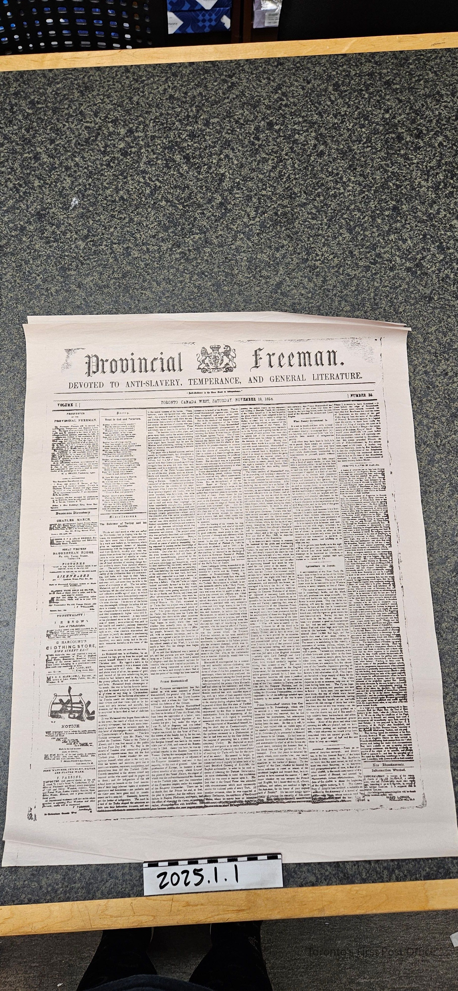 A replica of the front page of the Colonial Advocate published in York on Thursday December 6, 1827. The replica was made using historic newspaper plates and printing press from the time, although the provenance of the plates and press themselves are unknown. Printed on thin lightweight paper.Update Date