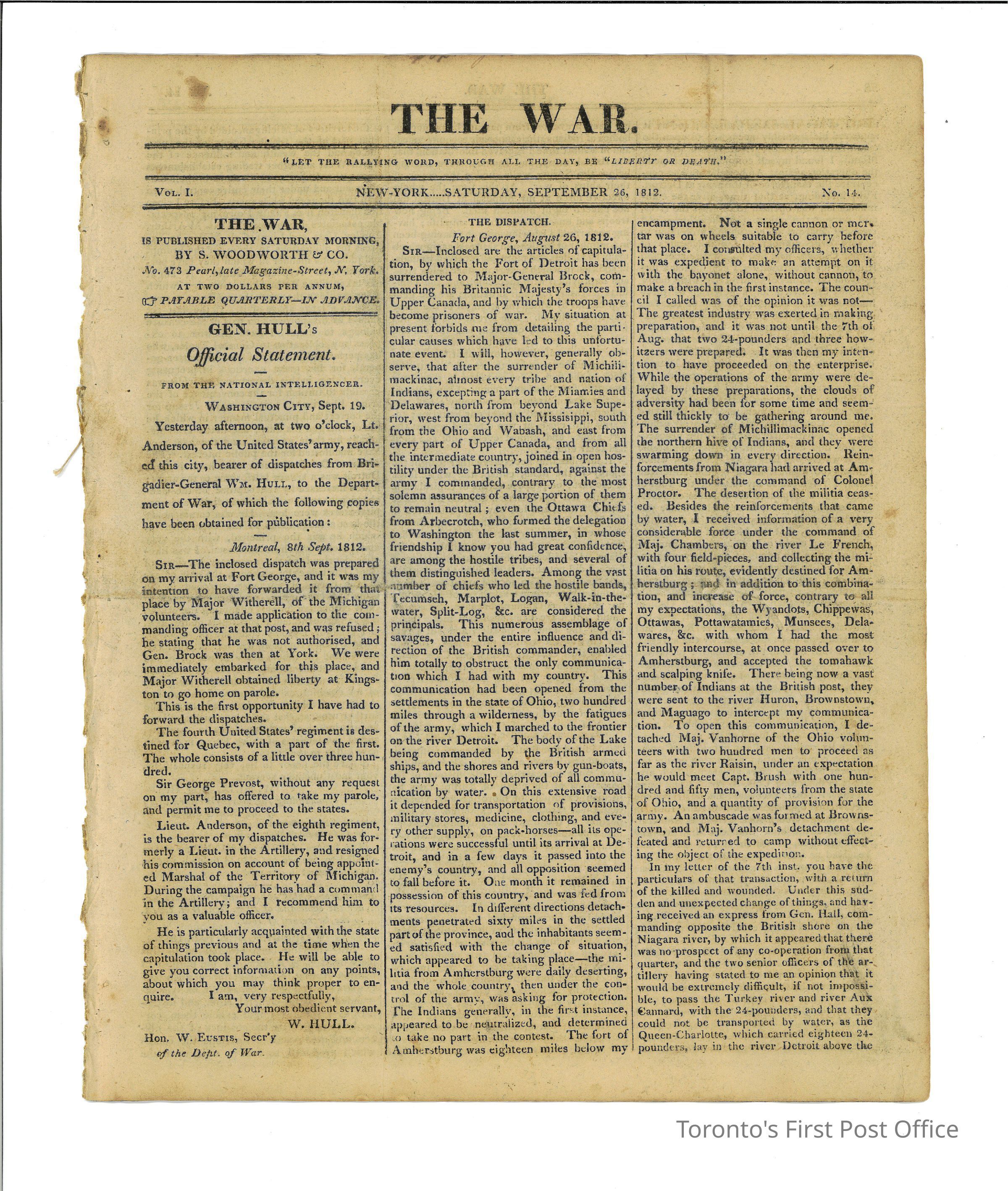 Newspaper, titled "THE WAR" with motto "LET THE RALLYING WORD, THROUGH ALL THE DAY, BE LIBERTY OR DEATH"; New York, Saturday, September 26, 1812; Masthead: "THE WAR, IS PUBLISHED EVERY SATURDAY MORNING, BY S. WOODWORTH & CO., No. 473 Pearl, late Magazine-Street, N. York. AT TWO DOLLARS PER ANNUM, PAYABLE QUARTERLY - IN ADVANCE"; 8 pp., 3 columns each page, lede: "GEN HULL'S Official Statement", Vol. 1, No. 14.Dimensions