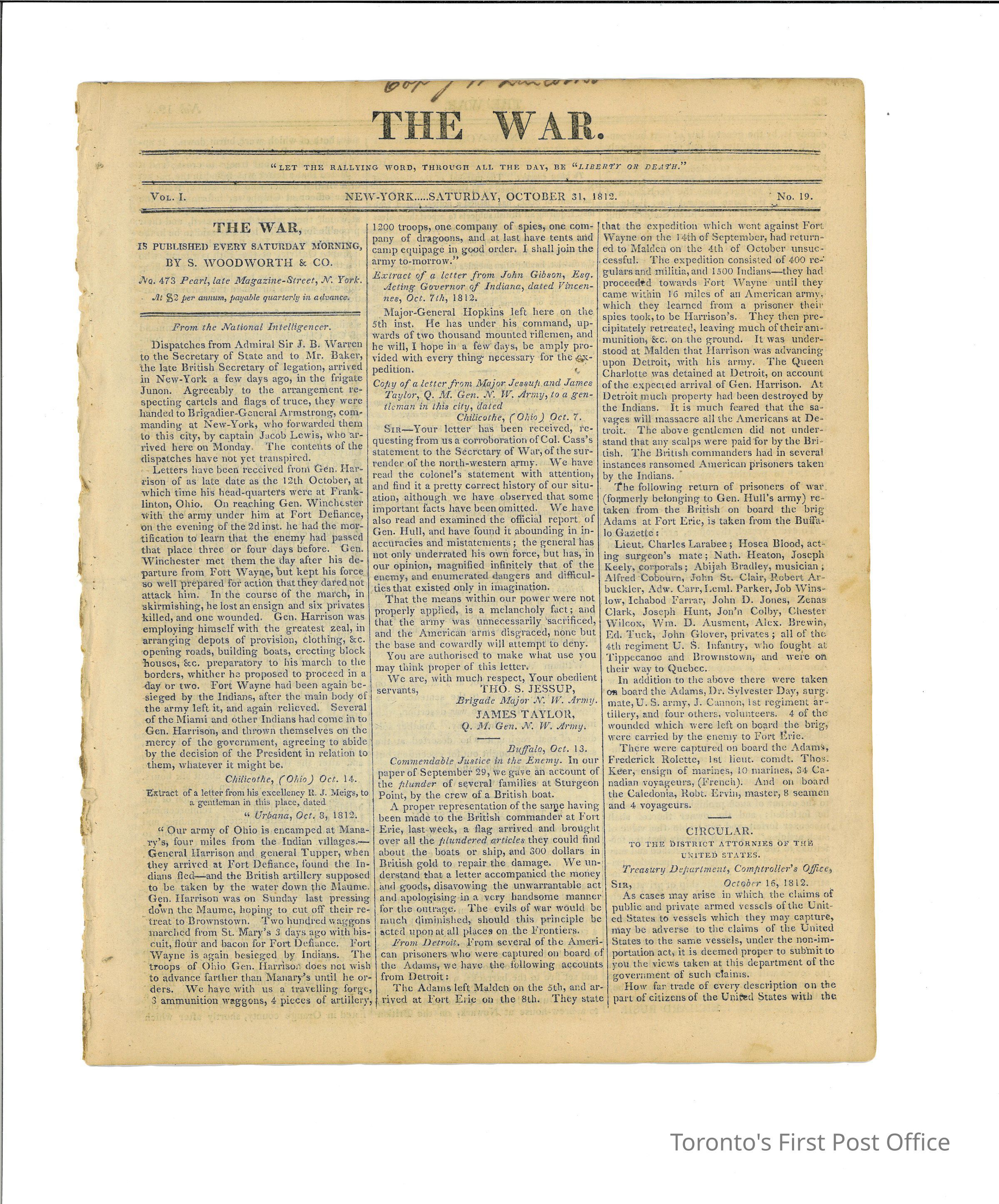 Newspaper, titled "THE WAR" with motto "LET THE RALLYING WORD, THROUGH ALL THE DAY, BE LIBERTY OR DEATH"; New York, Saturday, November 14, 1812; Masthead: "THE WAR, IS PUBLISHED EVERY SATURDAY MORNING, BY S. WOODWORTH & CO., No. 473 Pearl - late Magazine-Street, N. York. at $2 per annum, payable quarterly in advance"; 4 pp., 3 columns each page, lede: "Letter from Captain Elliot to the Secretary of the Navy of the United States"; handwriting at top edge partially cut off, ends with "... Lincoln", Vol. 1, No. 21.Dimensions