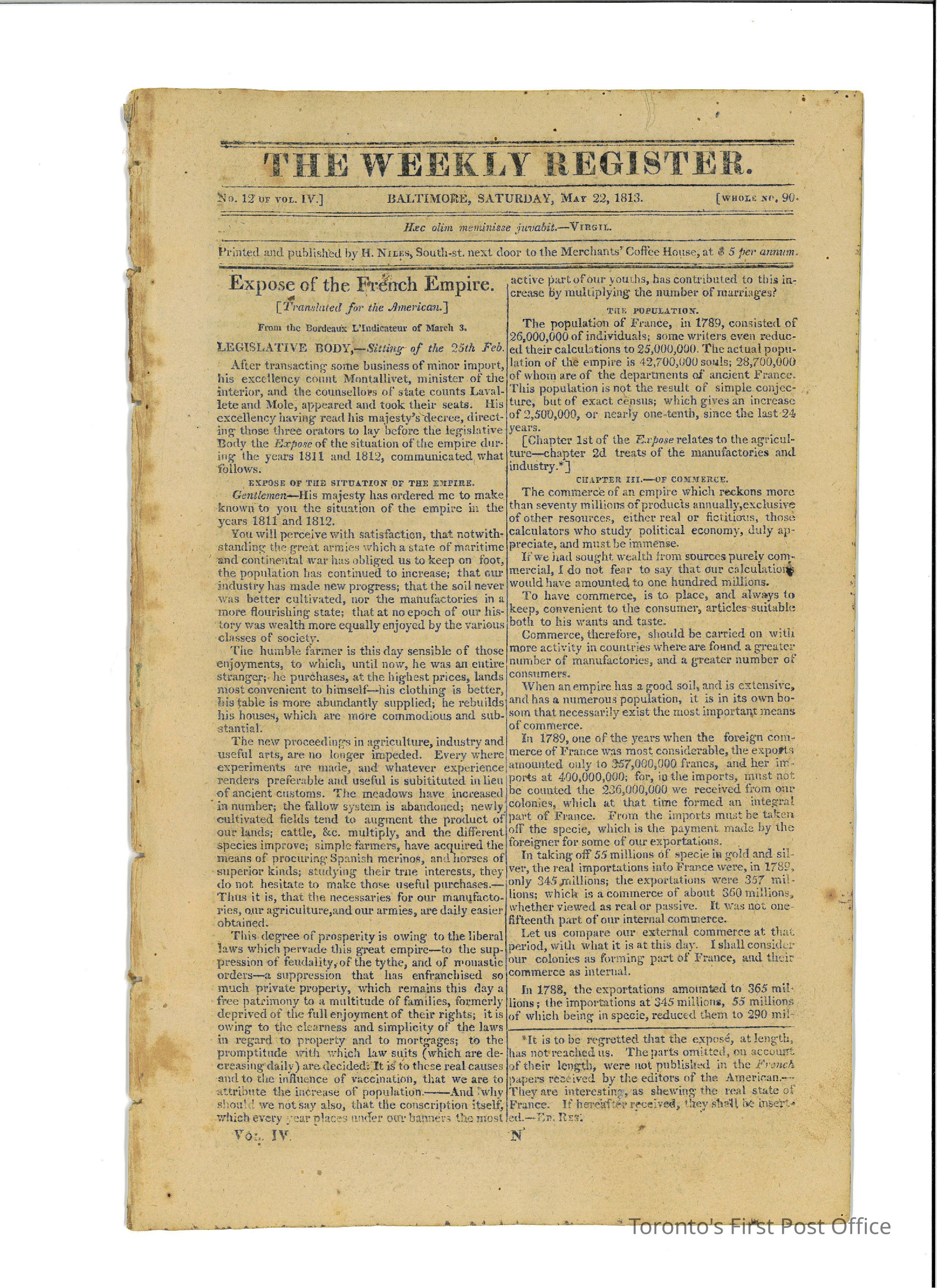 Newspaper. Small rectangular, printed newspaper. Four sheets of white paper, folded in half to create eight pages. Titled 'The weekly register', dated Saturday May 22, 1813. Articles include 'Expose of the French Empire'; 'Rules and Regulations for the army of the United States'; 'Events of the war'; 'American Prizes'; 'Of foreigners'; 'York-Upper Canada'; and 'The chronicle'.Dimensions