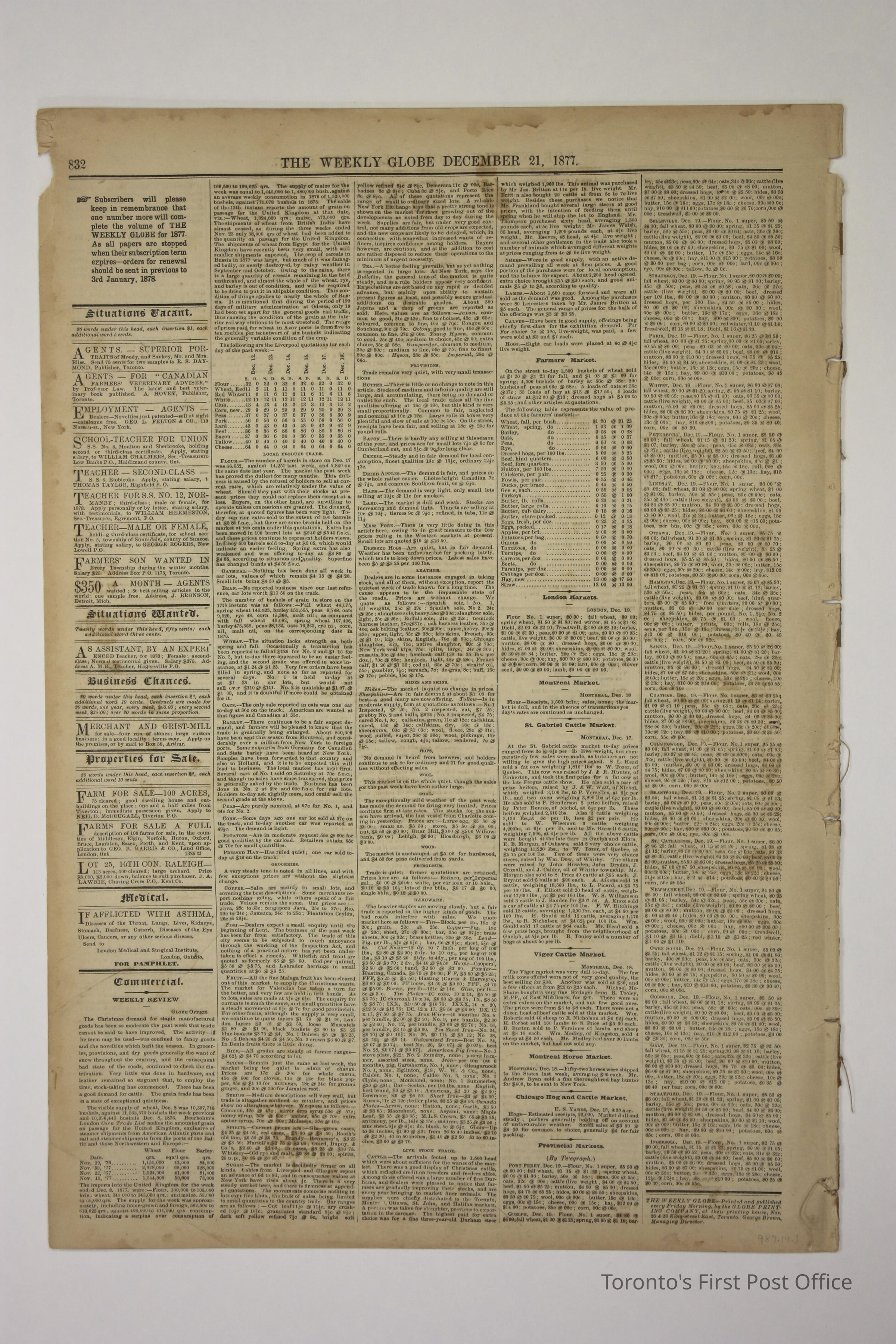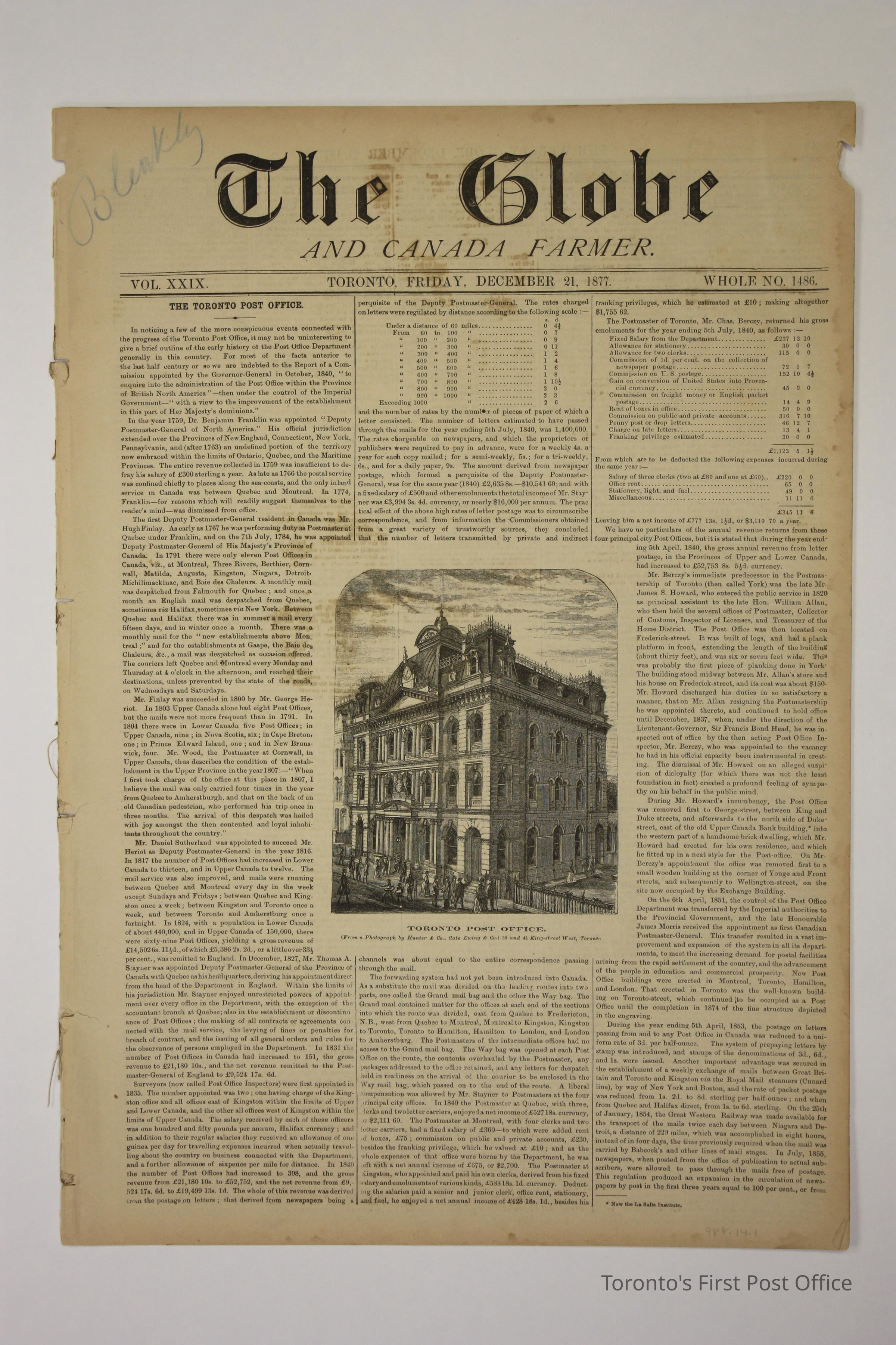 Newspaper: "The Globe and Canada Farmer"; Toronto, Friday, December 21, 1877; front page article: "The Toronto Post Office", mentions James Scott Howard's post office.Update Date