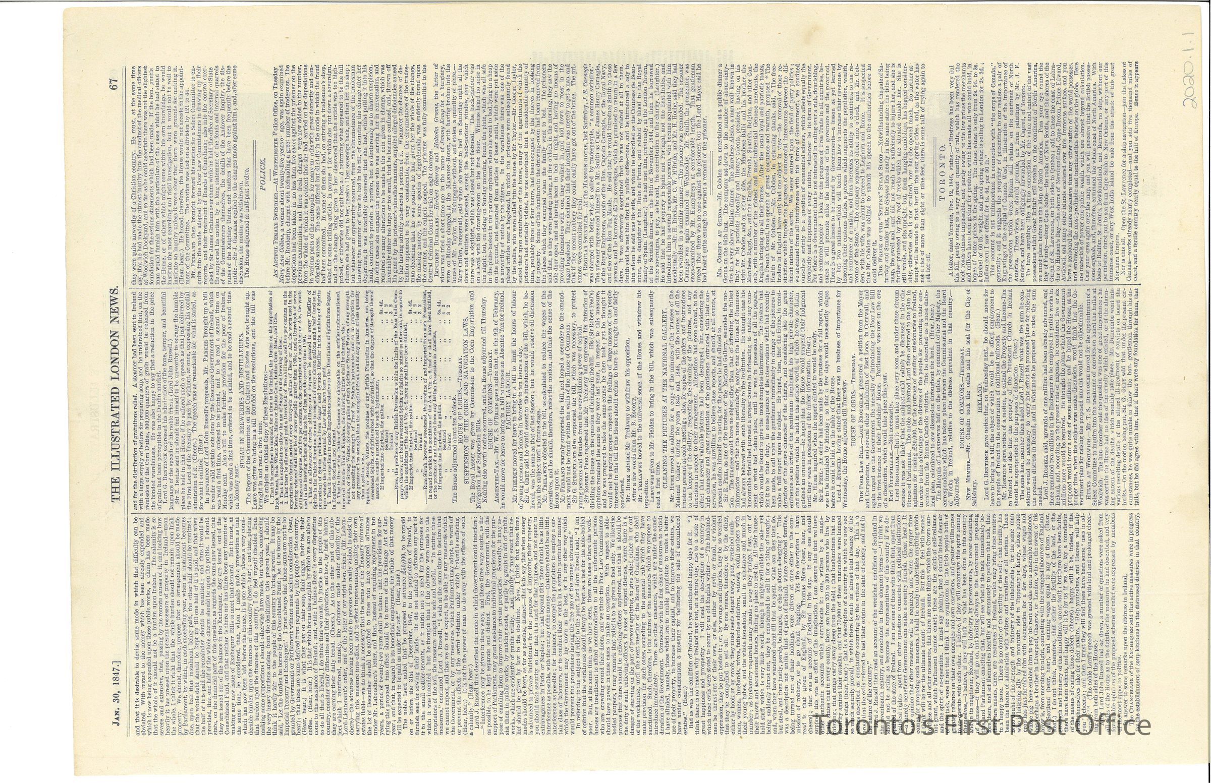 A page from "The Illustrated London News", pages 67 to 68. Most articles focused on British Politics, but one article talks about Toronto. Also includes 2 lithographs of King Street.Update Date