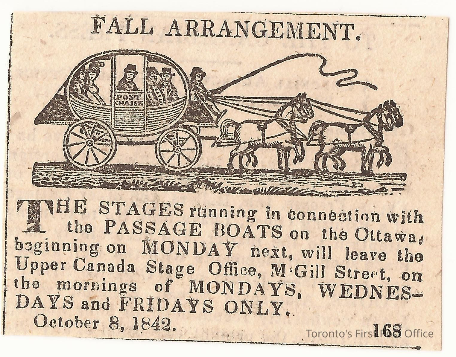 Newspaper advertisement for stages in connection with the Passage Boats on the Ottawa…; Oct. 8, 1842.