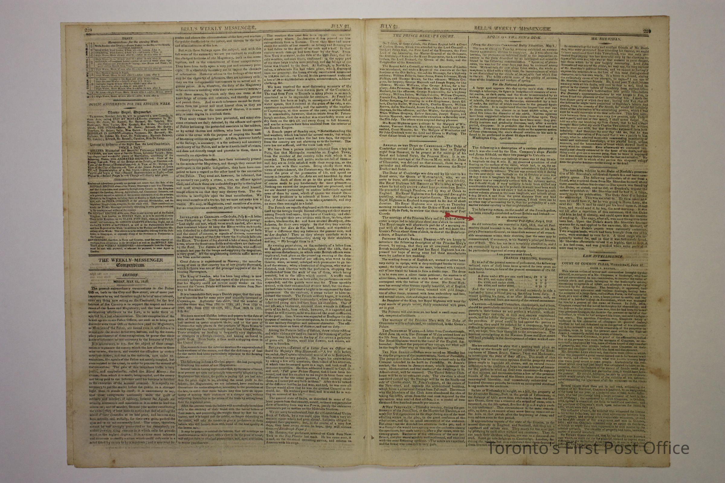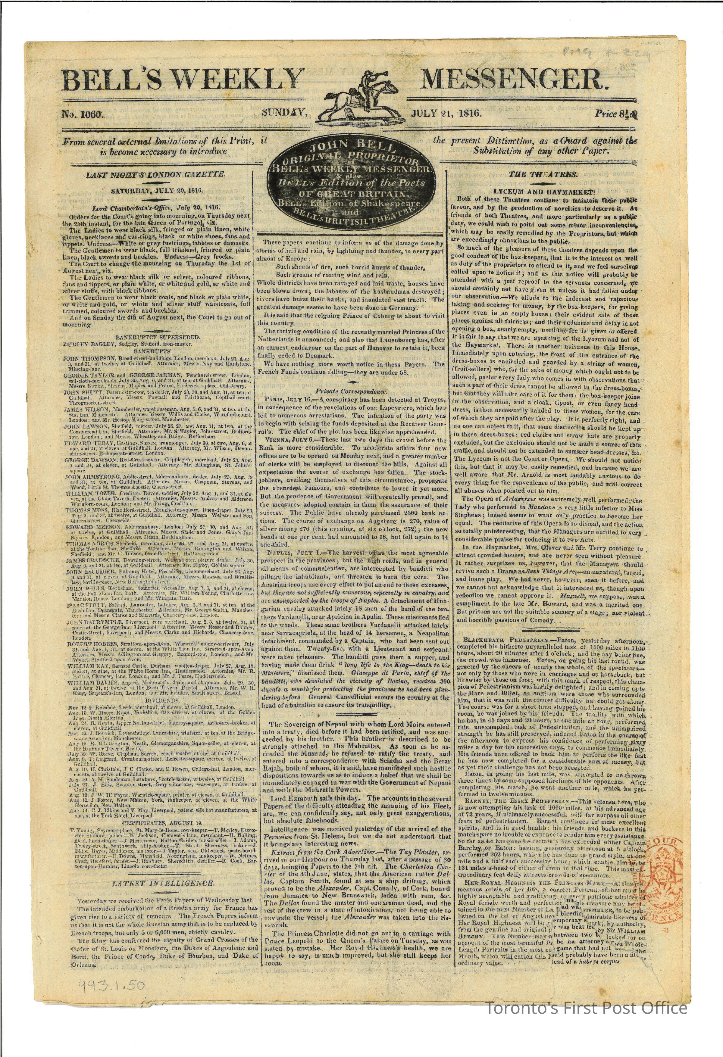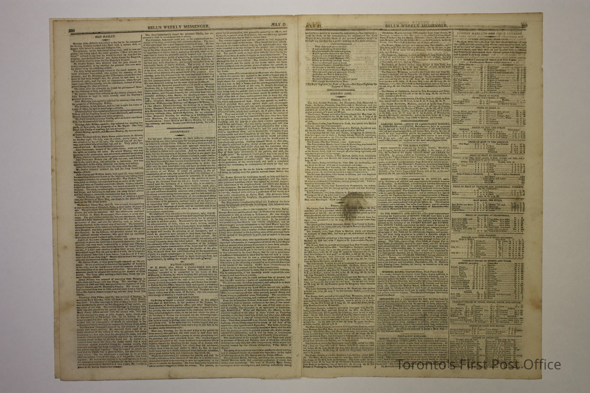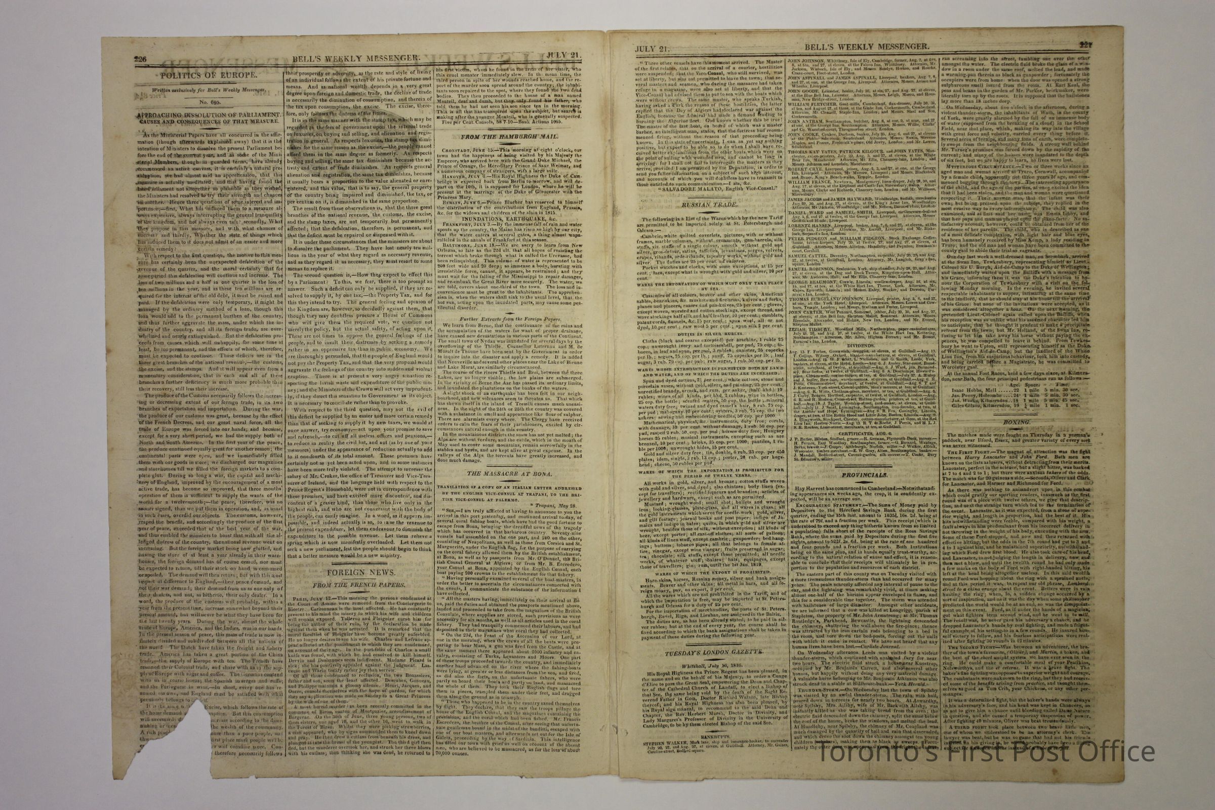 Newspaper: "Bell's Weekly Magazine"; black ink on unbleached paper; 2 pieces of paper; 8 printed sides; local and world news; includes "a letter from Francis Feeling, Secretary to the Post Office to all Postmasters that they should act as government informers"; price: 4 pence.Update Date