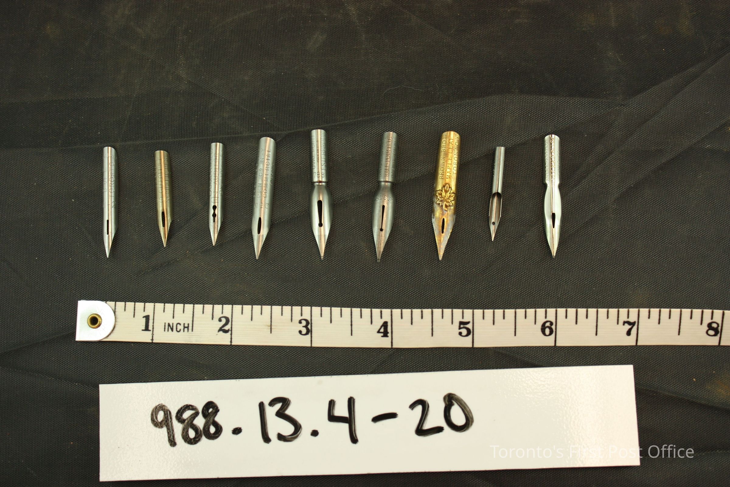 Collection of metal nibs, as follows: .2.1-7: "John Mitchell's Student's Pen, England 202"; .3.1-6: "SPROTT'S FEDERATION commercial Text Book Co. Toronto"; .4.1-4: "England B. of E Toronto -M-2"; .5.1-2: "292 Joseph Gillotts Public Pen - F"; .6.1: "Spencerian Primary School - England No. 60"; .7.1-2: "101 Hunt Imperial USA"; .8.1: "E-640-Eagle Pencil Co. - Auditor New York U.S.A.; .9.1: "No 3 - Spencerian Pen Co. N-Y Commercial England"; .10.1: "Spencerian Pen- No - Queson Phinney & Co., New York - England"; .11.1: "CCO - SPROTT'S NO 22"; .12.1-4: "Ovalpoint - Made in USA Esterbrook - 788"; .13.1-3: "D Leonardt & Co. Ball pointed - Birmingham England"; .14.1-3: "IRIDNOID 777EF ES PERRY England"; .15.1: axe symbol "M.Myers & Son Ltd."; .16.1: has impression of maple leaf inscribed on nib; .17.1: "Hunt 107 USA"; .18.1: "Maddox's Double Elastic Pen - 97"; .19.1: "No 942 - Spencerian - GILT POINT Domepaint - England"; 20.1: "Turner & Harrison Silver 229 Alloy Phila. P.A.".Update Date