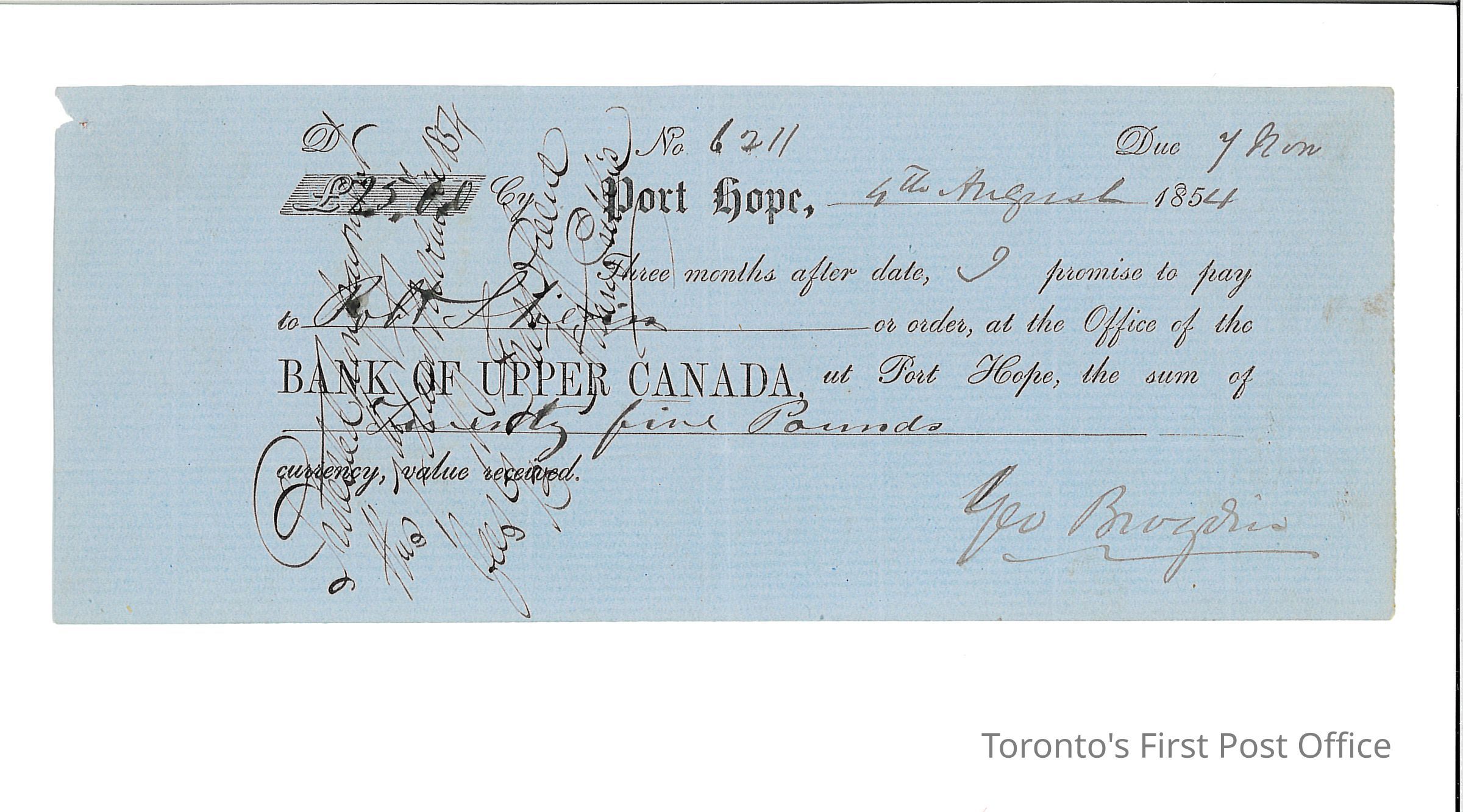 One promissory note; a form letter; made out to Robert Lewis by Geo Brogdin for £25; payable at the Bank of Upper Canada at Port Hope; endorsed on reverse by John Kells and Robert Armstrong; printed on blue laid paper; remains of orange wafer seal on reverse; dated Aug 4 1854.Update Date