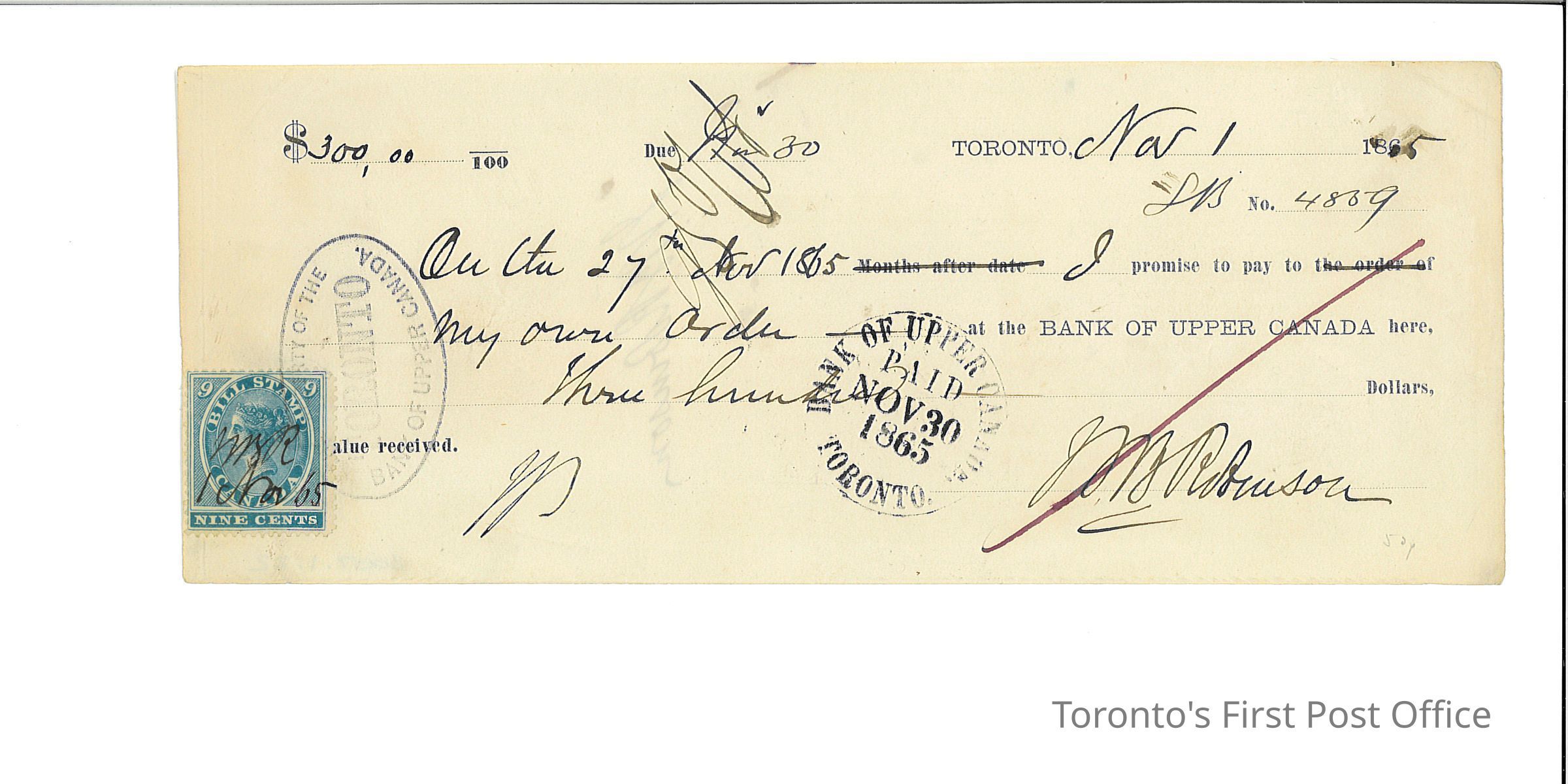 One promissory note to "my own order" by JB Robinson for $300; note #4809; nine cent bill stamp attached; stamp is blue with engraving of Queen's bust sinister; two black bank rubber stamp cancels: "Bank of Upper Canada, Toronto, Paid Nov 30 1865" and "The Property of the Bank of Upper Canada Toronto"; signed on reverse; cream paper; black ink manuscript on partially printed form; red ink line across right side; dated Nov 1 1865.Update Date