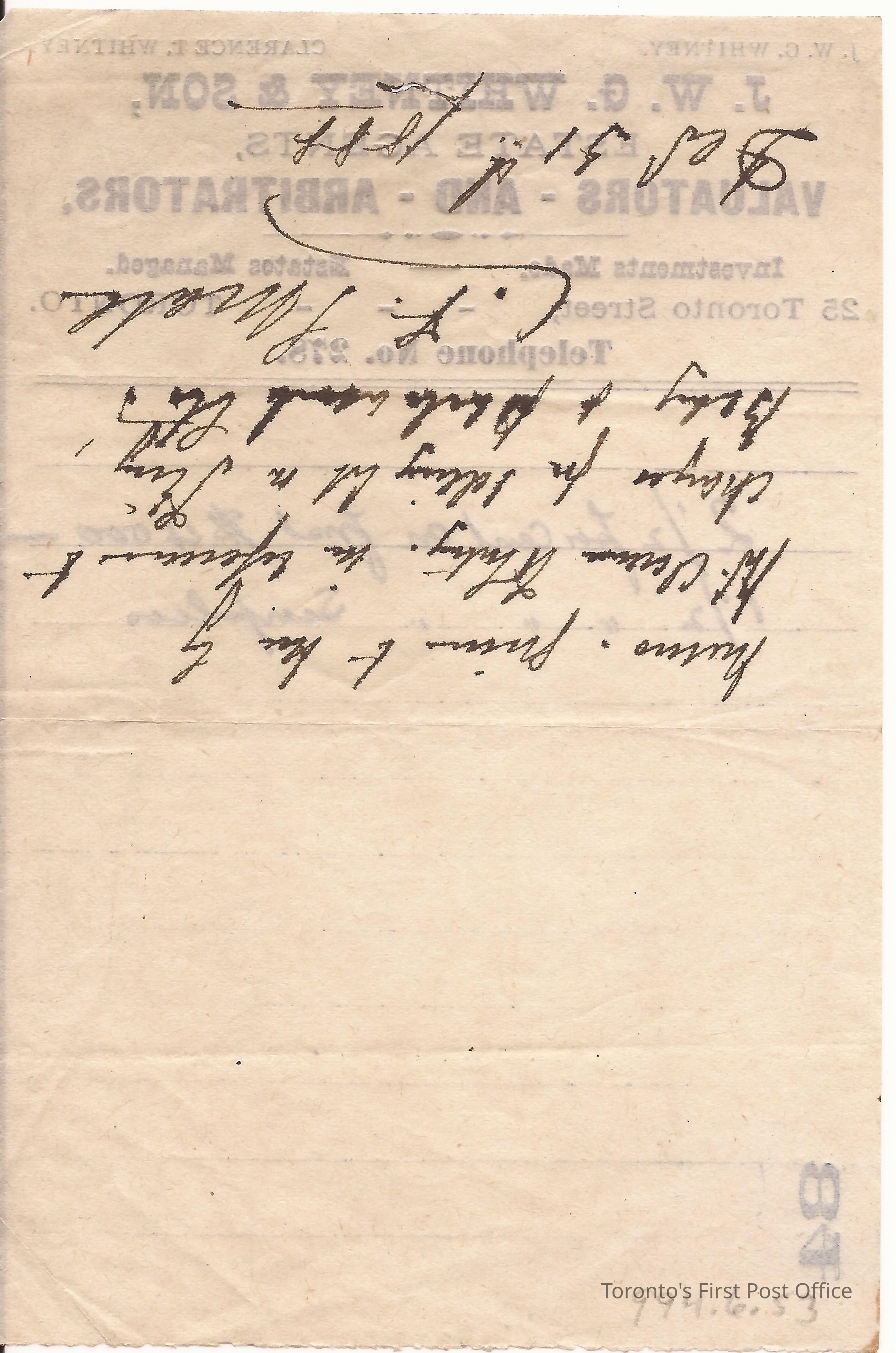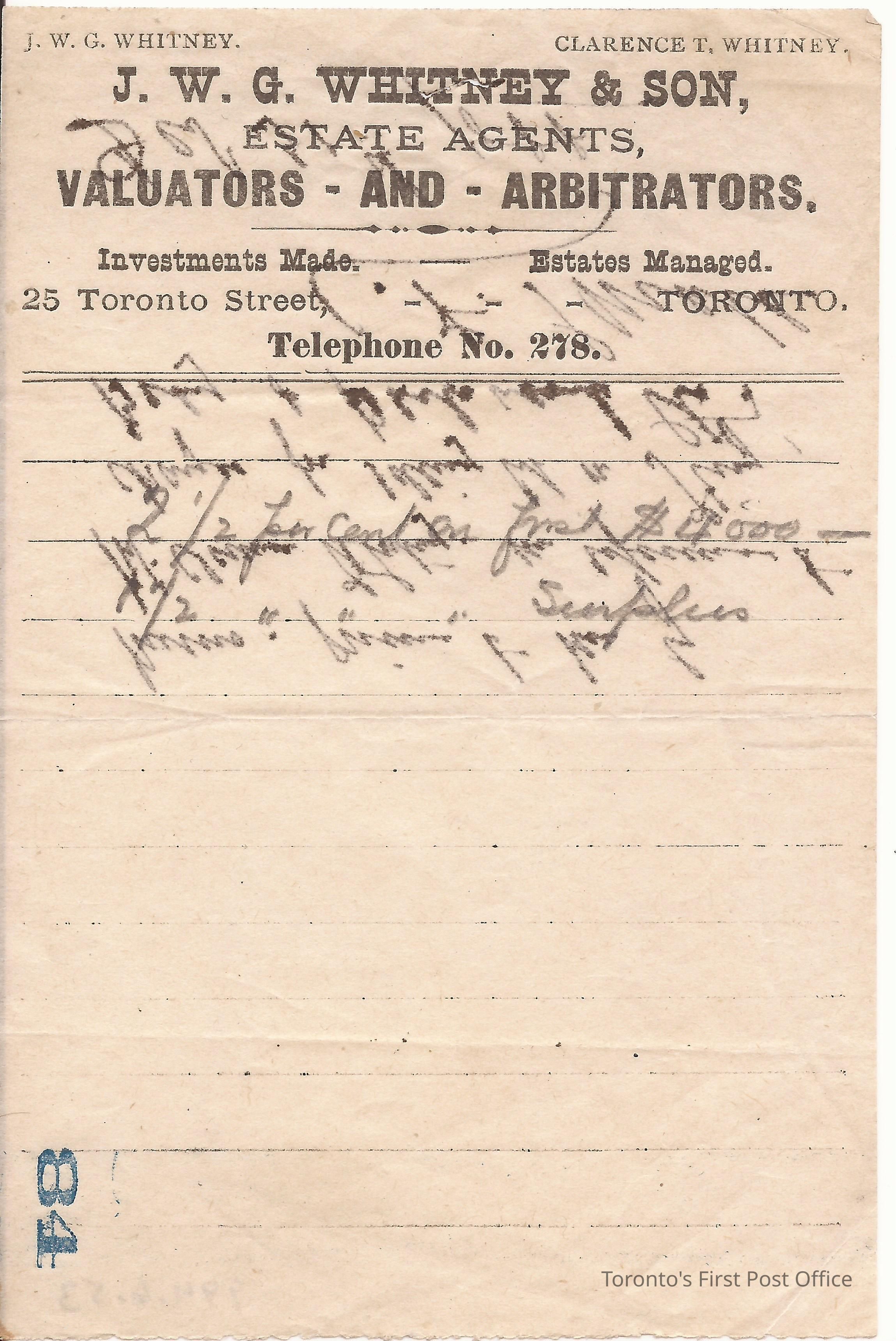 Note; thin paper; logo of J.W.G. Whitney and Son, Estate Agent, Valuations and Arbitrators… Telephone No. 278; invoice #84; signed by "J.Small"; dated Dec 31, 1888.Update Date