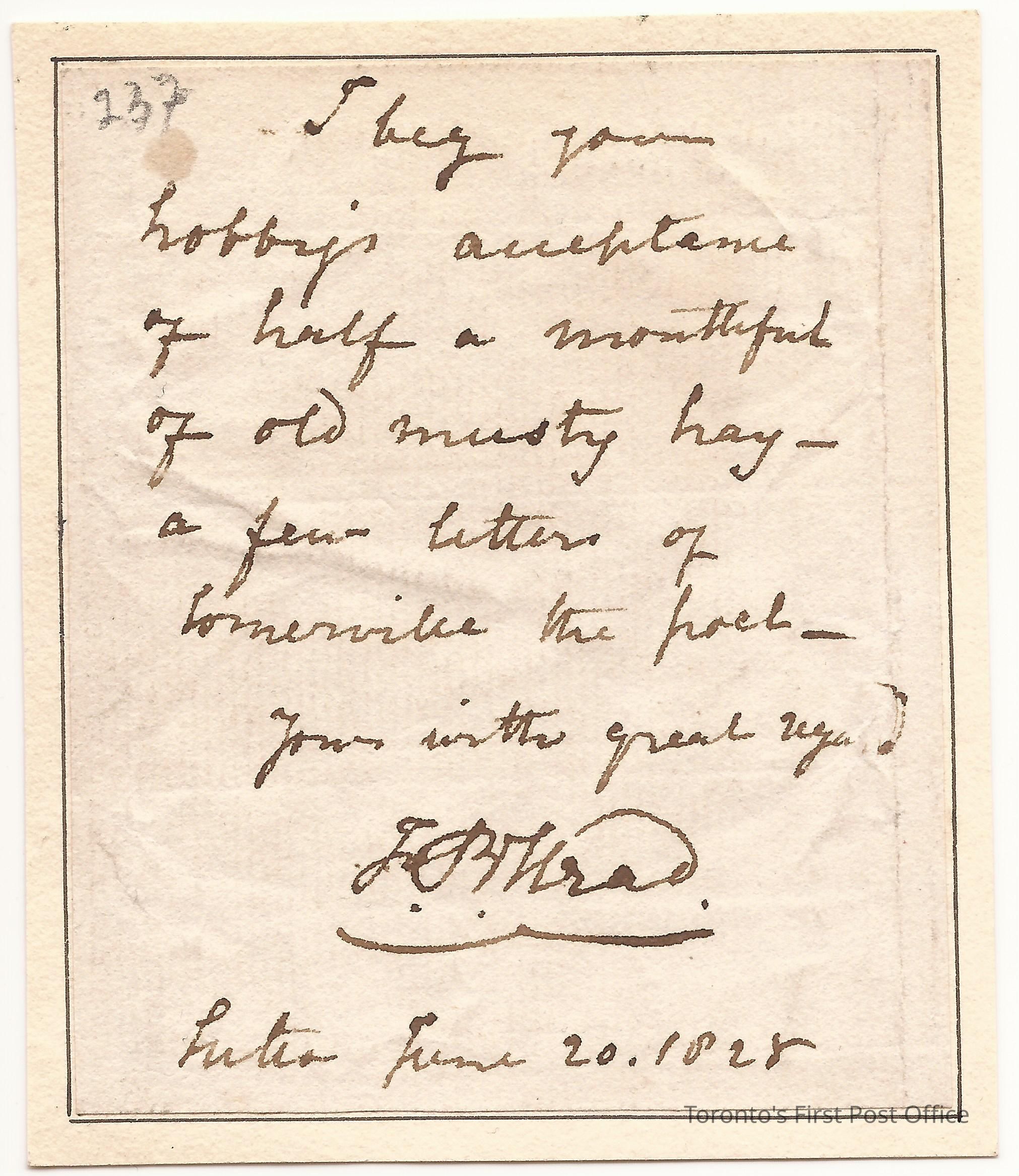 Manuscript note signed by "F.B. Head, Exeter, 20 June 1828"; one page; off-white paper mounted on same card; with thin black-lined border.Update Date