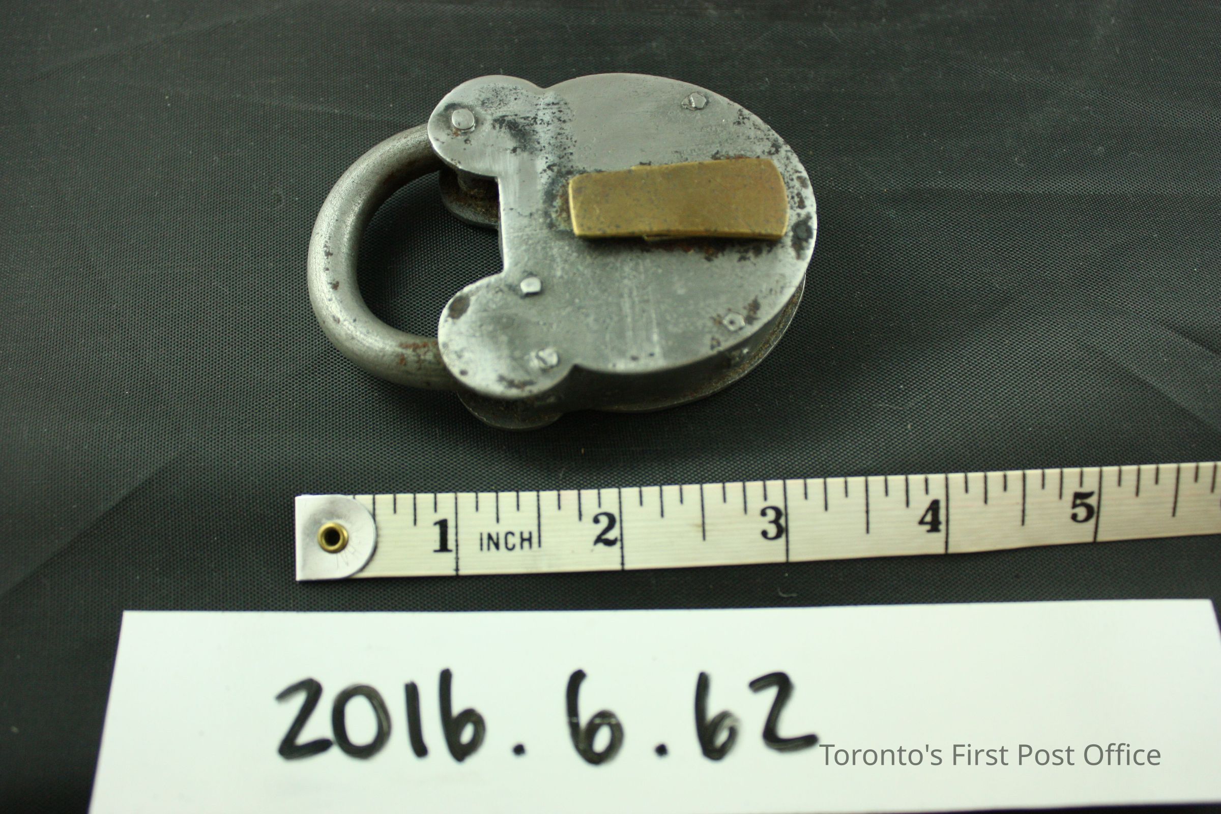 Steel handmade padlock, brass rectangular keyhole and keyhole cover, no key. The shackle swings away to proper right, but the toe of the shackle is partially stuck due to corrosion. The obverse of the padlock features five (5) crudely welded rivets, while the reverse features twelve (12). The sides of the body of the padlock bare three (3) rivets. the steel still has glossy sheen.Dimensions