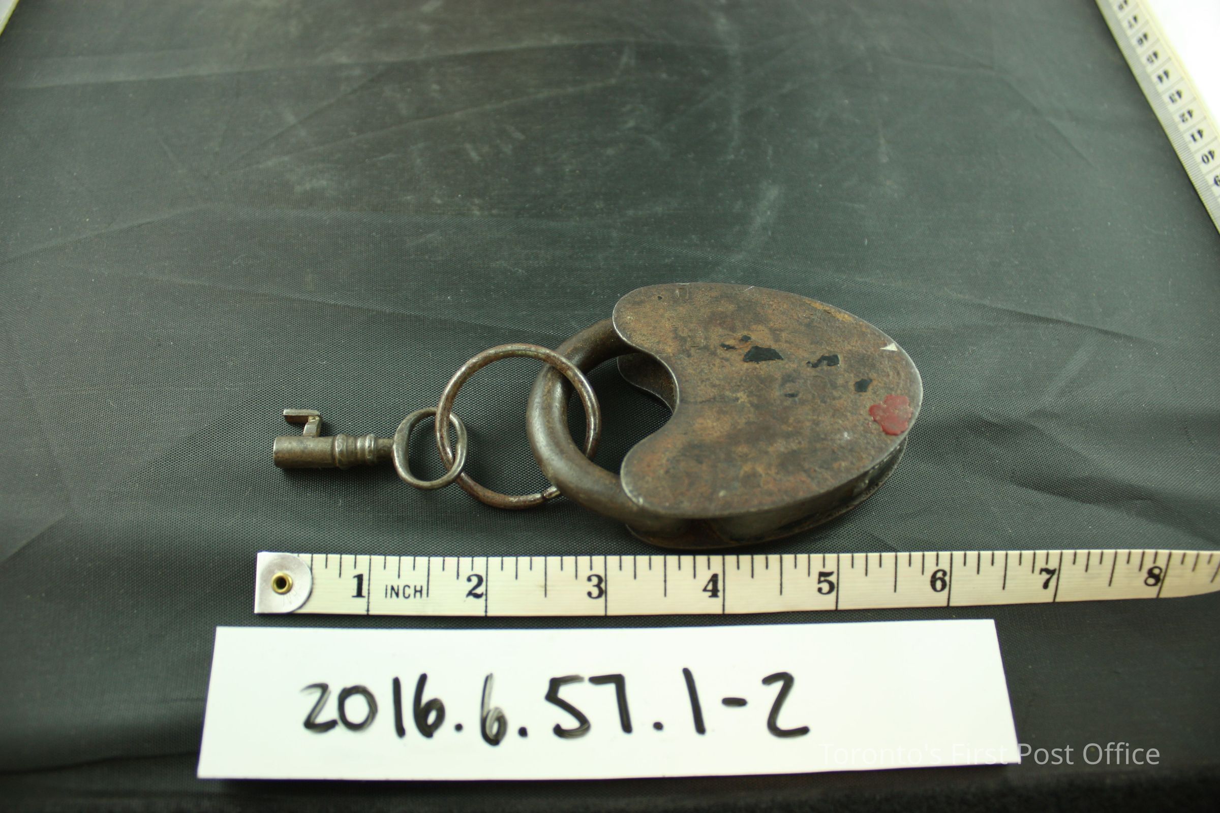 Iron handmade railway padlock with brass keyhole and keyhole cover, with key. 'E R & Co.' stamped on keyhole cover, probably denoting the Erie Railroad Company founded in 1861. The key appears to be original and is attached by its bow to a hoop which is then attached to the shackle. The shackle swings away to proper right, but the toe of the shackle is locked. Black paint flakes still visible on the body of the padlock.Dimensions