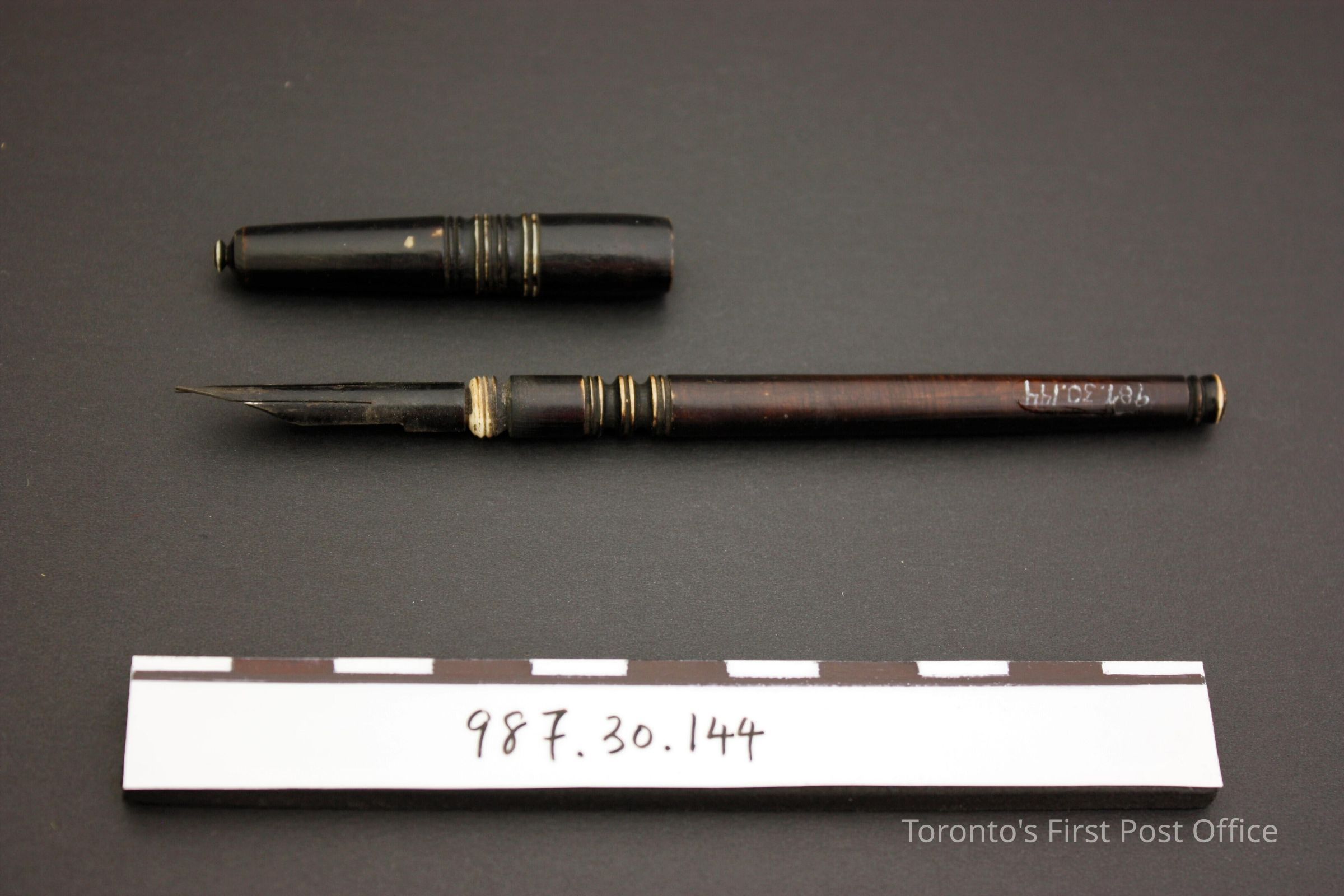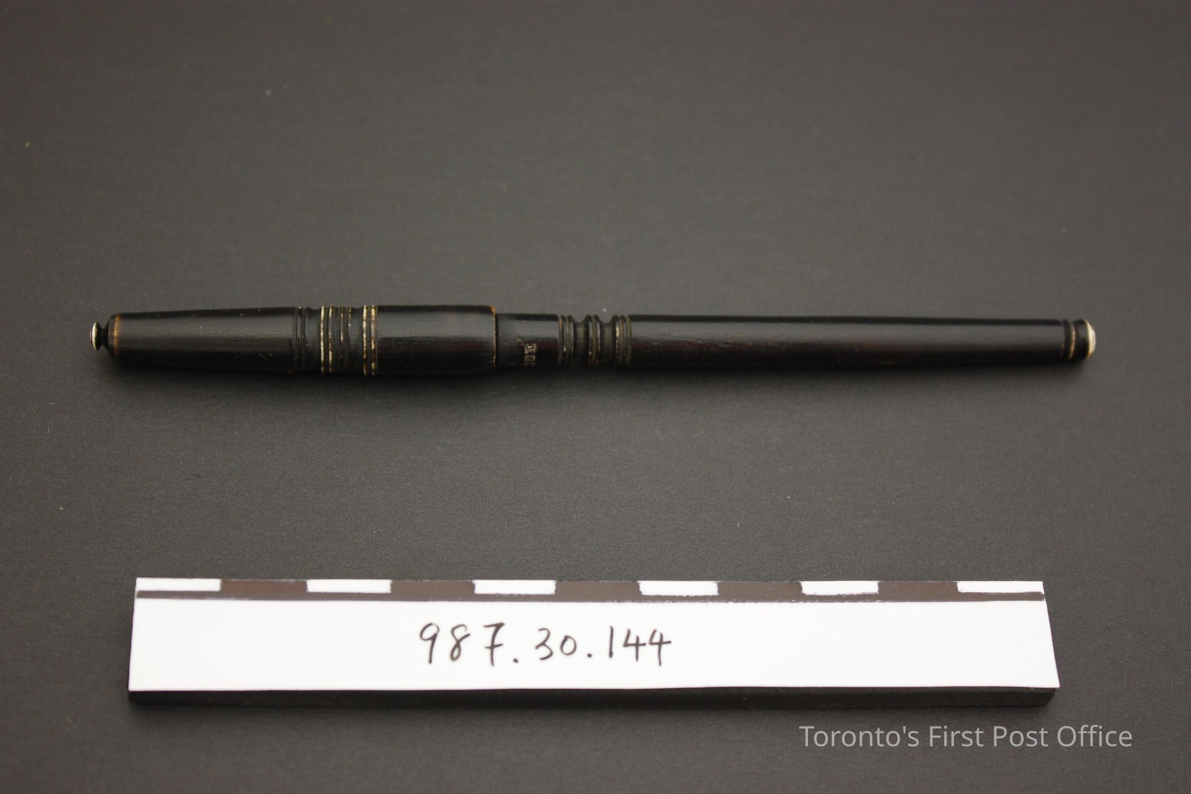 Travelling pen; blackened ivory; screw on lid; steel nib; marked "J WAGE" on base; circular incised lines on base, handle and lid, circa 1830.