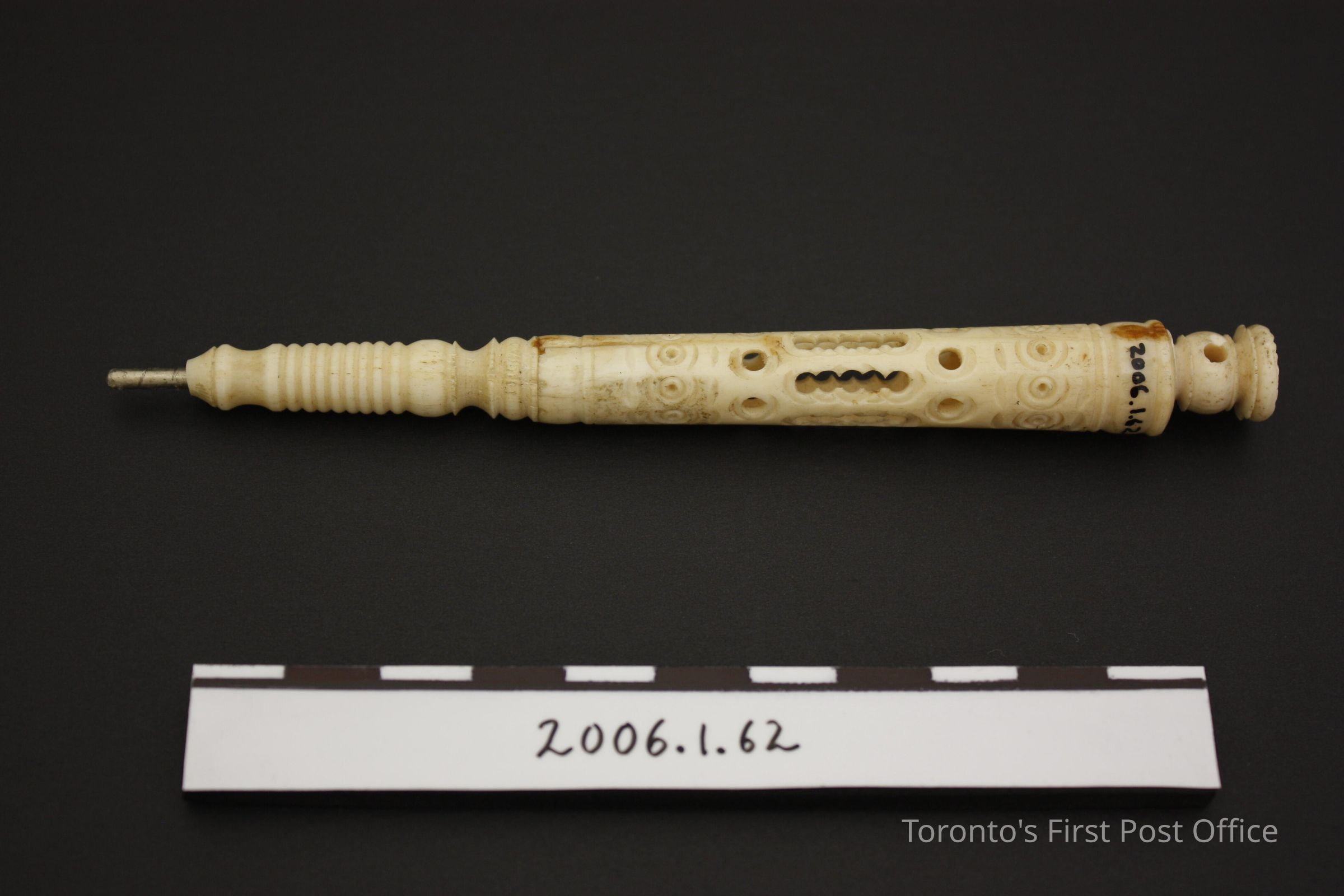 Pen with bone shaft; turned and hand-carved in circle and half-moon design; shaft appears to be three or four pieces; sterling piece at base; cross-hatch seal at top.Update Date
