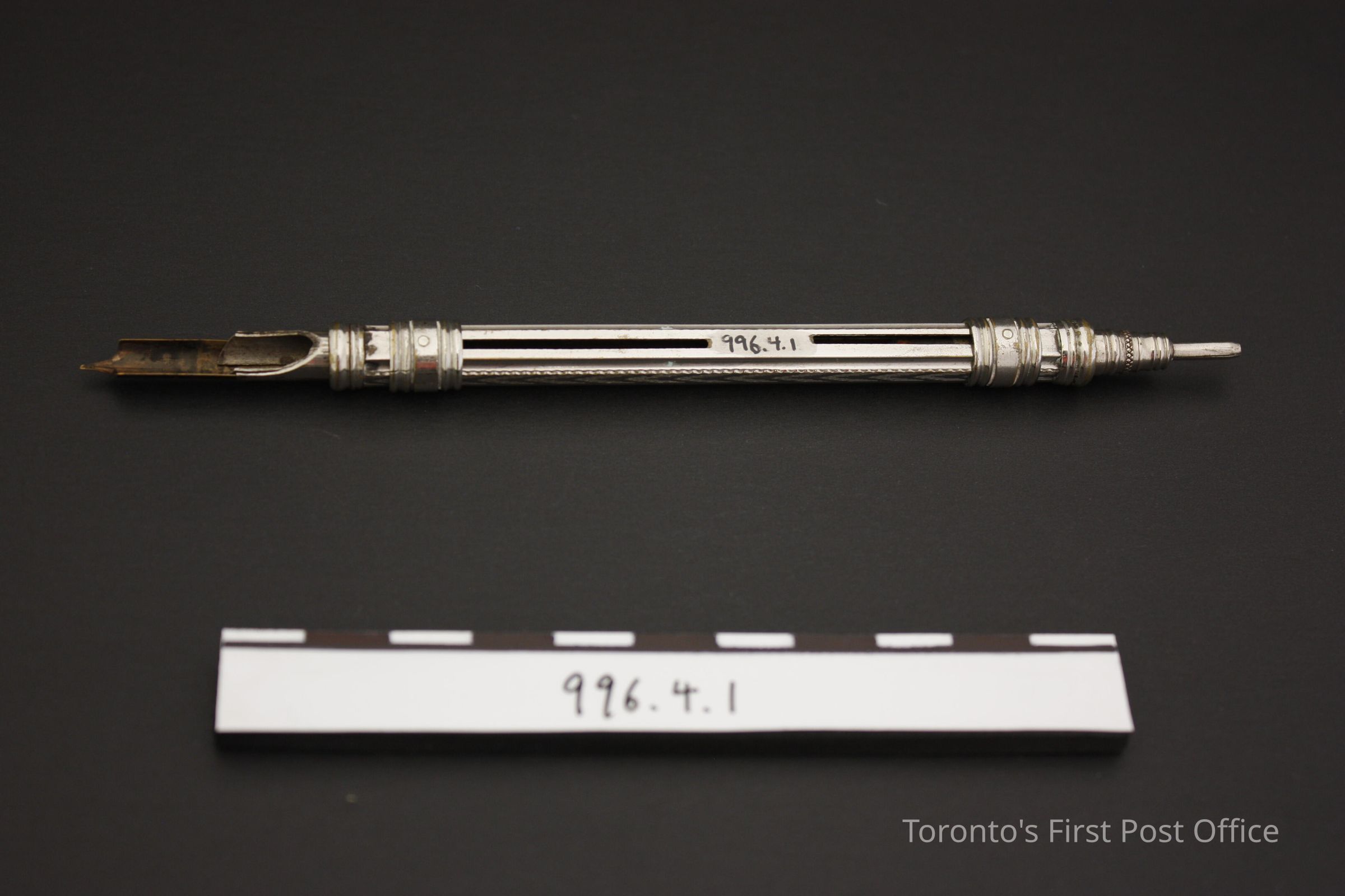 Retractable pen; silver or alloy chrome; gold coloured steel nib: "Resterbrook & Co. Refill 314"; one end for ink, other for pencil (no lead); two rings in central part of shaft allows pen and pencil to be retracted or extended; geometric line design along shaft.Dimensions