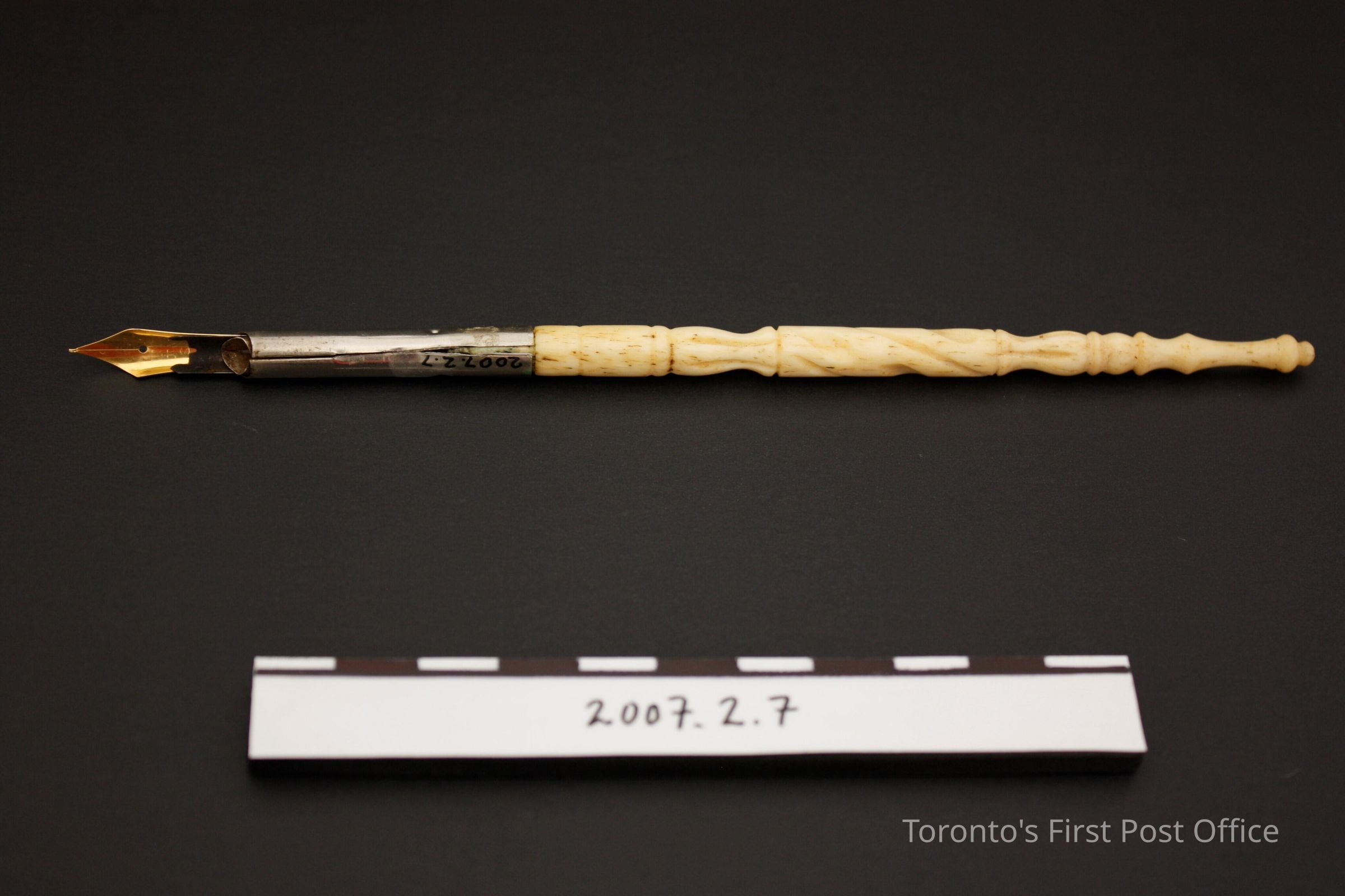 Pen with carved bone handle; long nickel-plated collar; gold nib marked "GOLD PLATED 12"; c. 1900; European origin.