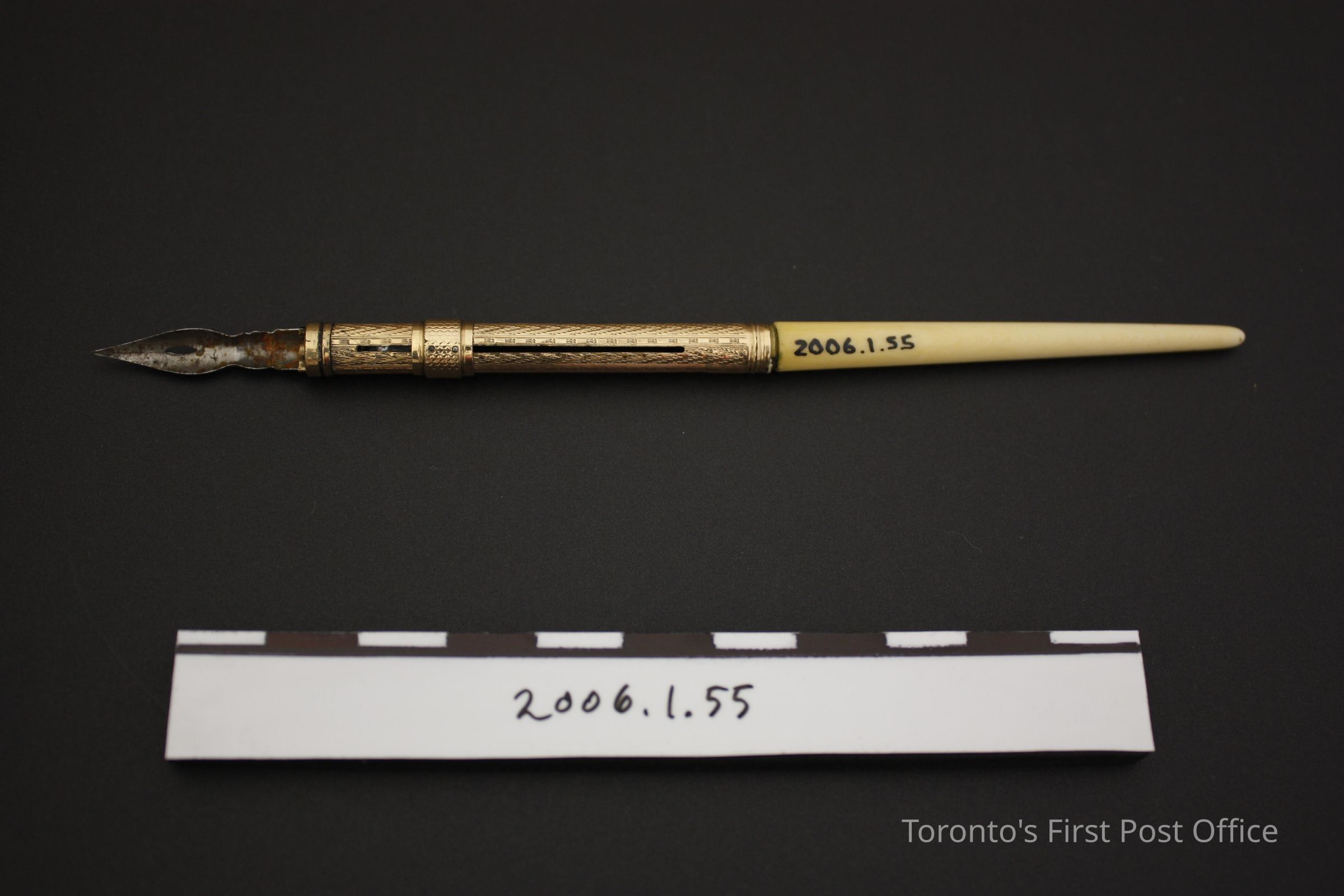 Pen with ivory shaft; gold collar; steel nib; retractable nib.
