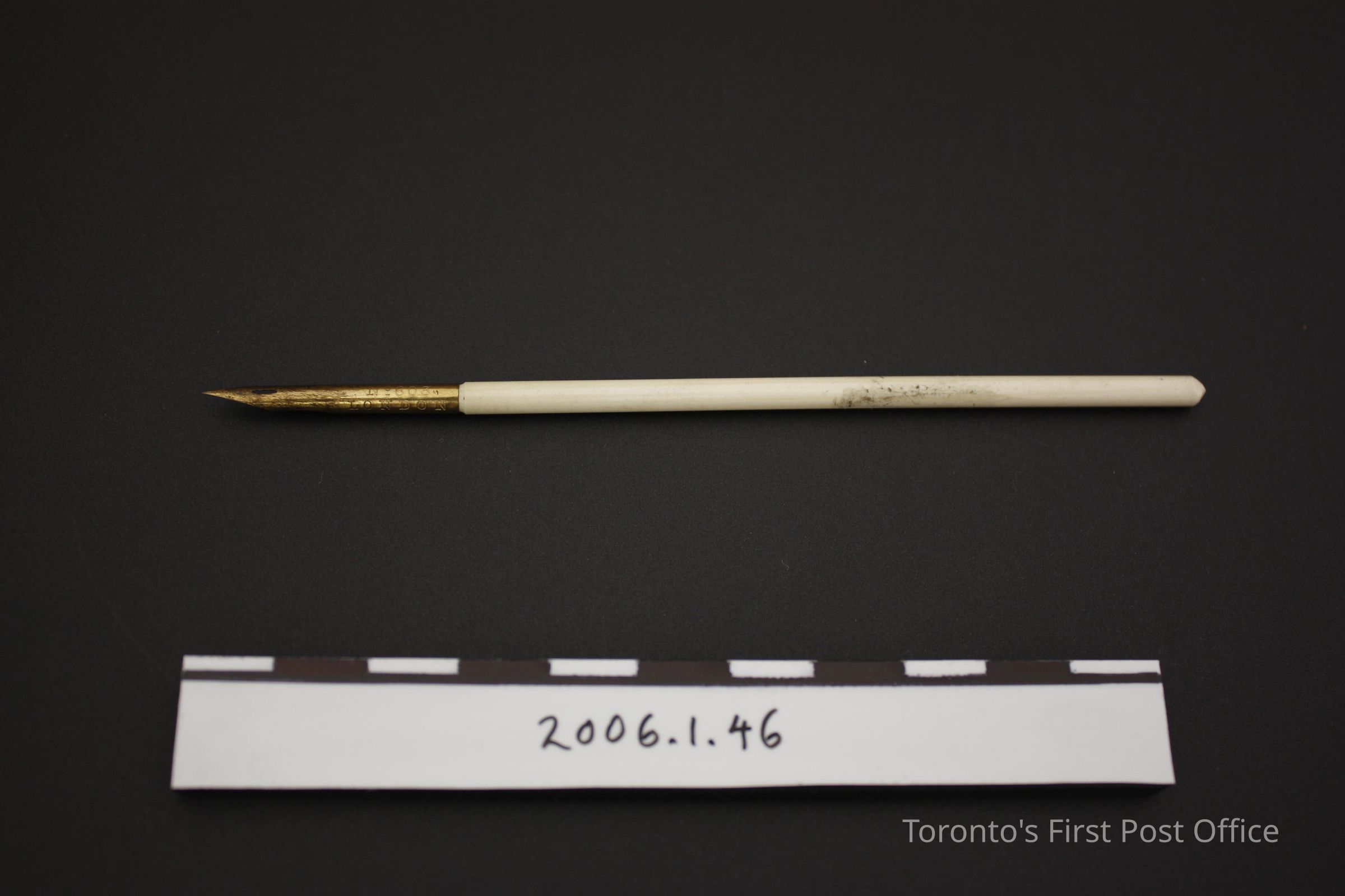 Pen; ivory with gold nib; "PERRY & CO No 603 LONDON" stamped on nib; very plain stem; circa 1850.